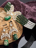 Introducing the Gold Plated Green Tumble Beaded Choker Necklace Set for Women, a perfect blend of elegance and sophistication. This beautifully crafted choker features a striking array of green tumble beads, meticulously arranged to create a vibrant and eye-catching design. The gold-plated finish enhances the overall allure, offering a touch of luxury that complements the rich green hues.