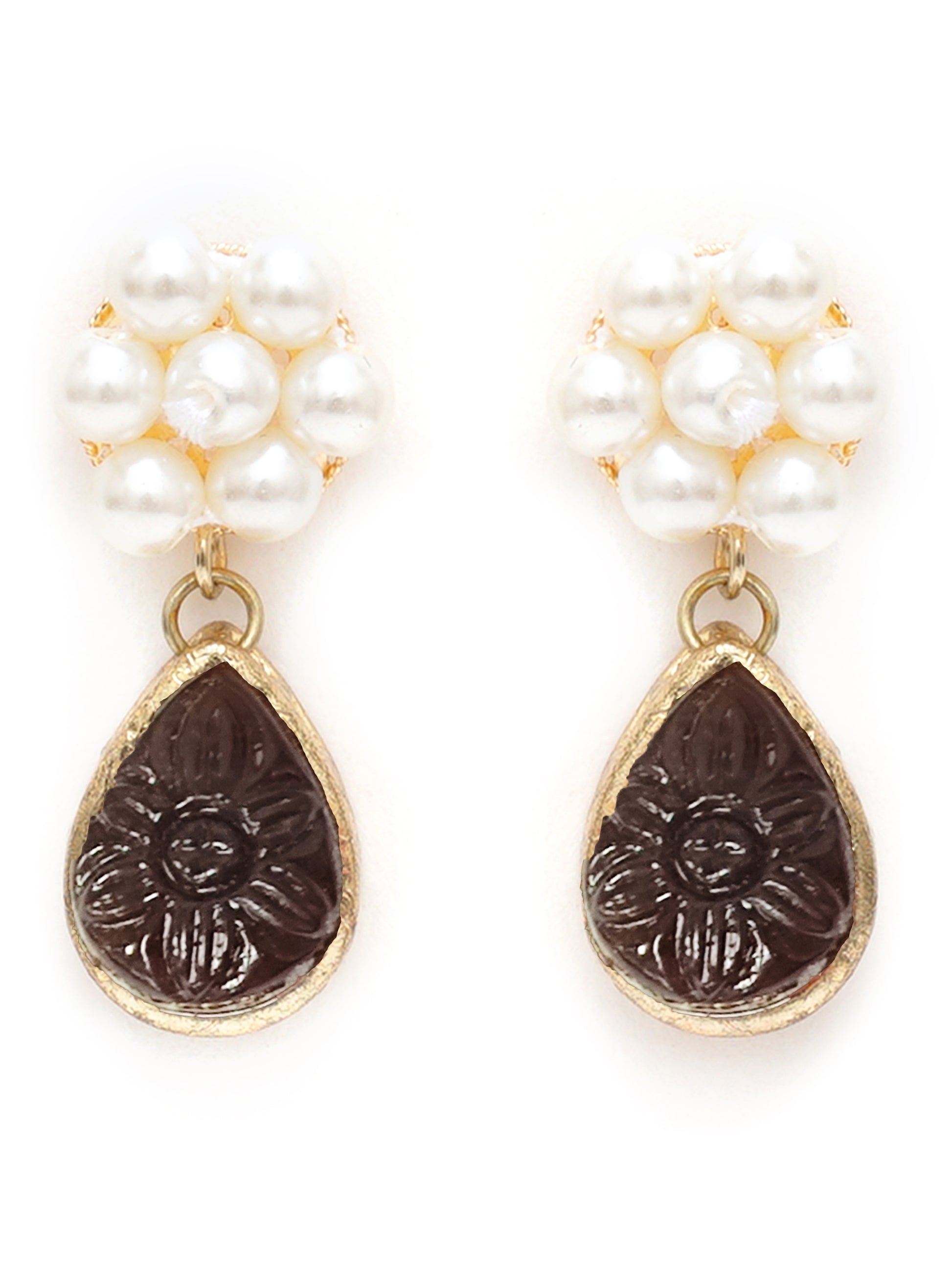 Introducing the Brown Carved Stone Studded Pearl Kundan Necklace Set for Women, a sophisticated blend of elegance and earthy charm. This exquisite set features a beautifully designed necklace adorned with rich brown stones, lustrous pearls, and intricate Kundan detailing. The warm tones of the brown stones paired with the classic pearls create a stunning and versatile look.