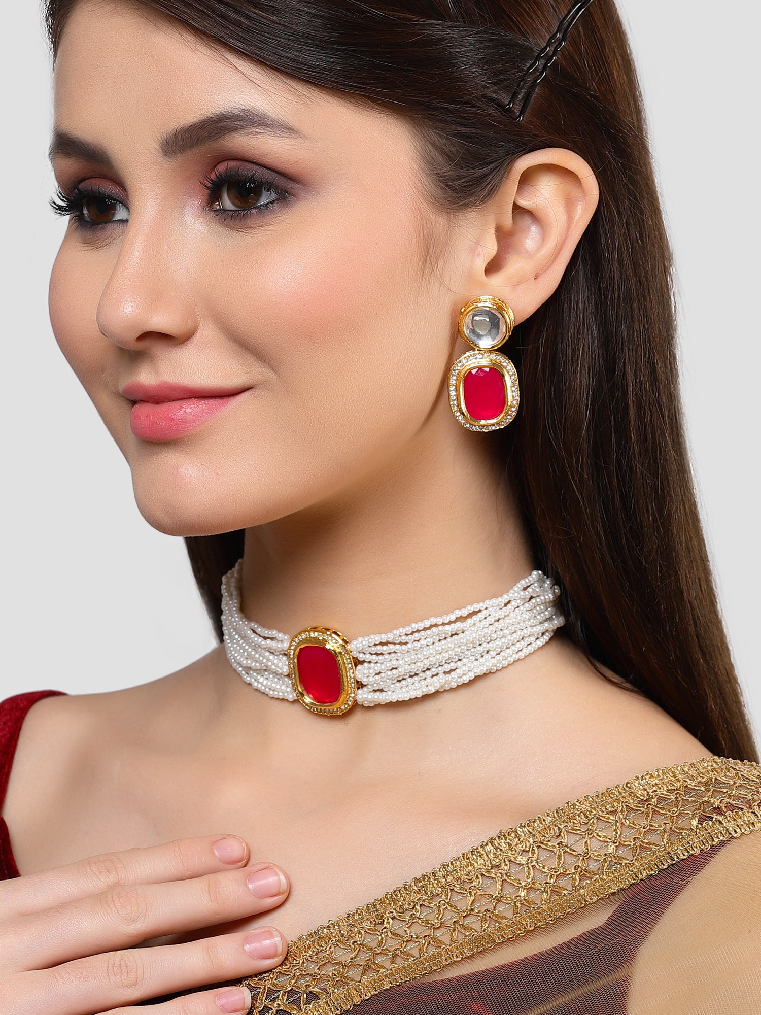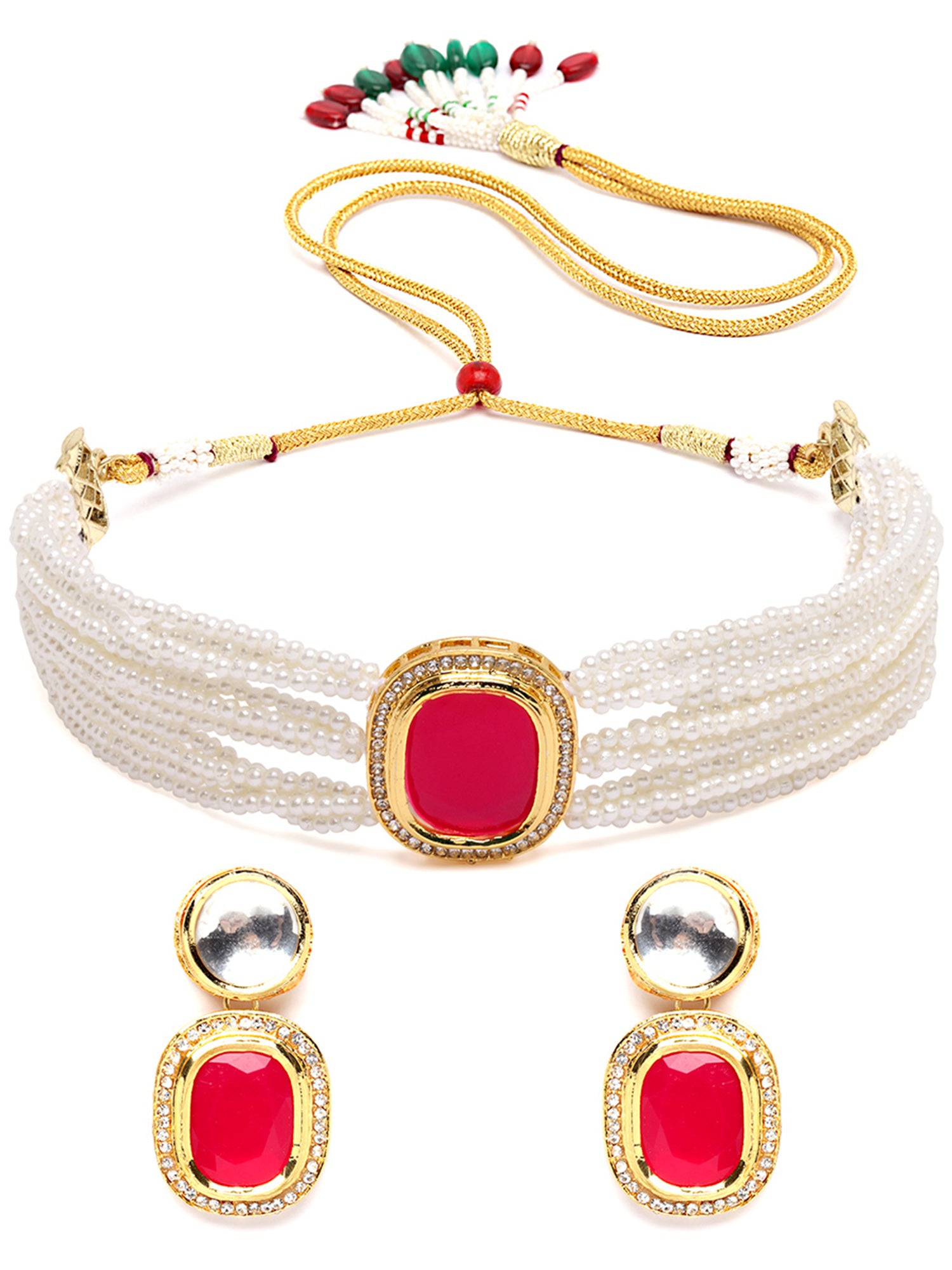 Karatcart Gold Plated Red Polki Kundan Choker Necklace Set for Women