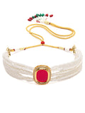 A statement piece that combines traditional elegance with modern sophistication. This beautifully designed choker features vibrant red Polki Kundan stones, meticulously set against a luxurious gold-plated backdrop. The rich red hues of the Polki stones add a bold pop of color, while the gold plating ensures a radiant and enduring shine.