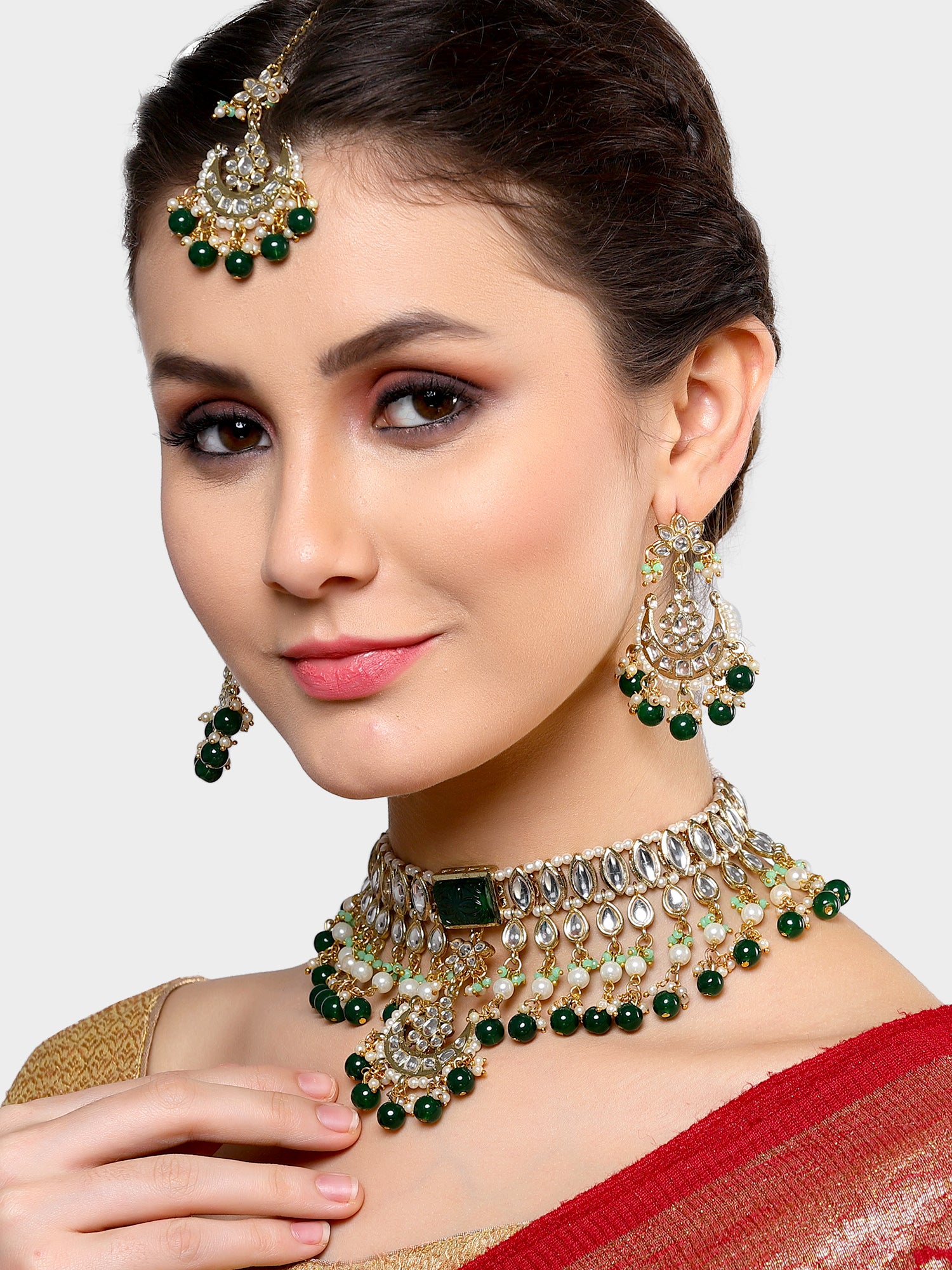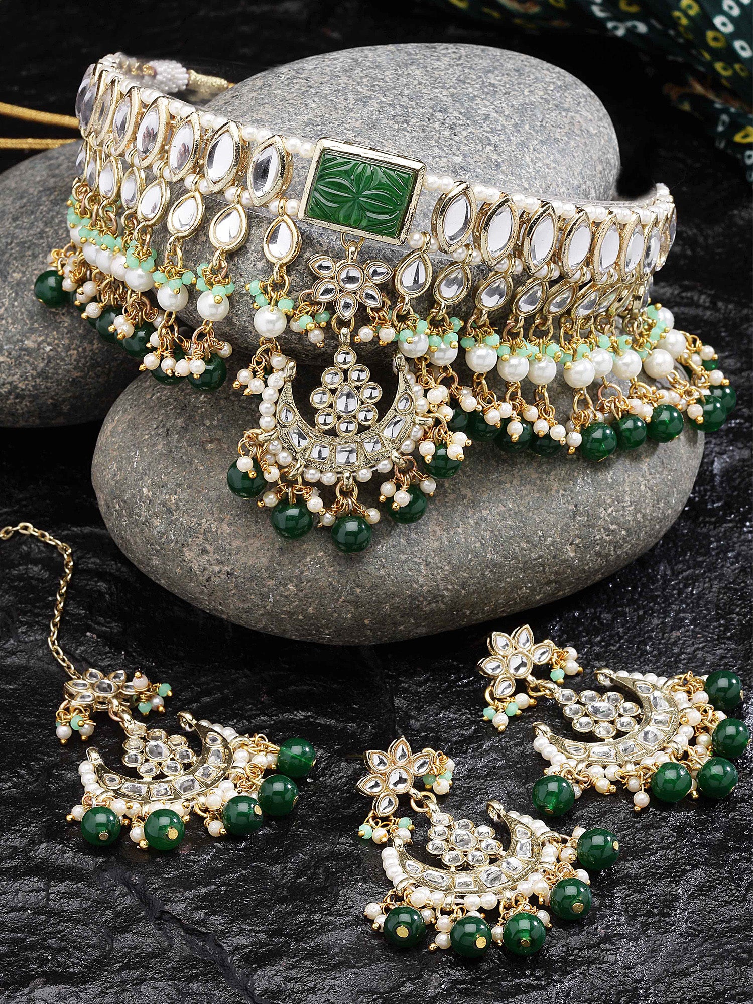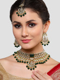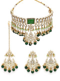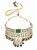 Karatcart Gold Plated Green Beads and Pearl Kundan Choker Necklace Set for Women