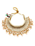 A stunning choice for the modern bride seeking a touch of traditional elegance. This beautifully designed choker features vibrant pink beads intricately arranged with exquisite Kundan stones, all set against a luxurious gold-plated base. The result is a captivating and sophisticated piece that adds a radiant pop of color to any bridal ensemble.