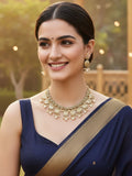 A timeless combination of elegance and sophistication. This exquisite set features lustrous pearls paired with intricate Kundan stones, all beautifully set on a luxurious gold-plated base. The classic pairing of pearls with Kundan detailing creates a refined and graceful look that enhances any outfit.