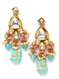 A beautiful fusion of serene elegance and intricate craftsmanship. This stunning choker features soft light blue tumble stones paired with lustrous pearls and detailed with delicate Polki Kundan accents, all set against a luxurious gold-plated base. The gentle blue hue and radiant pearls create a refined and eye-catching design.