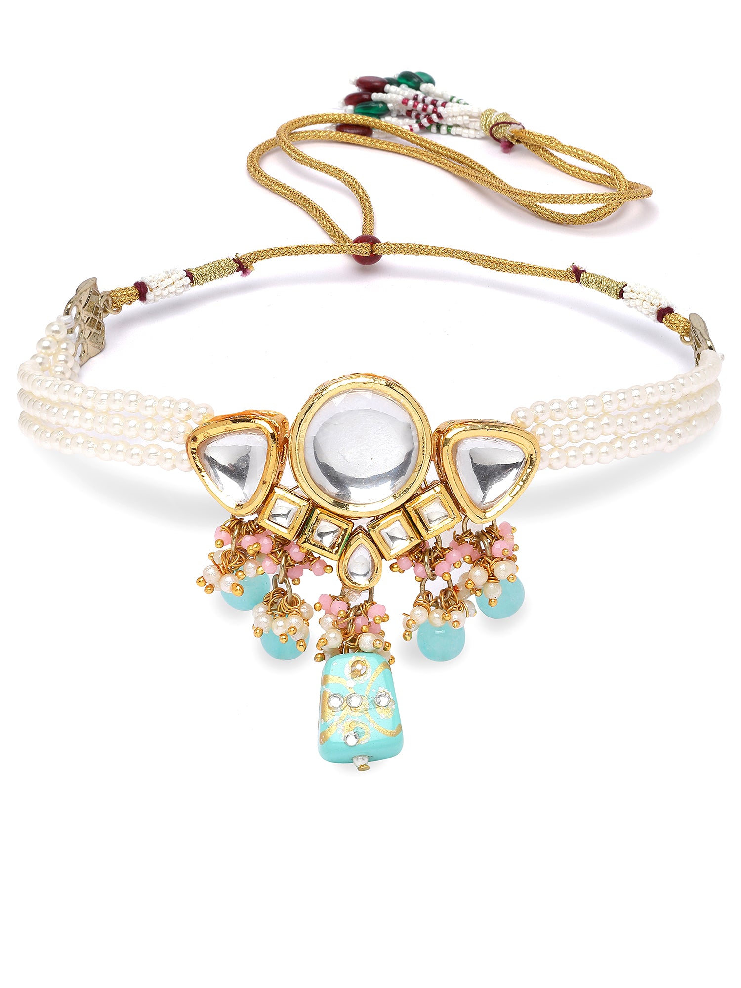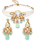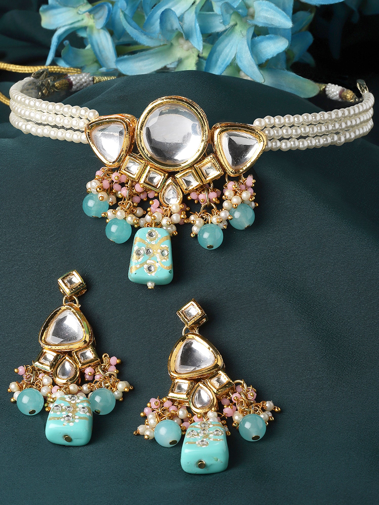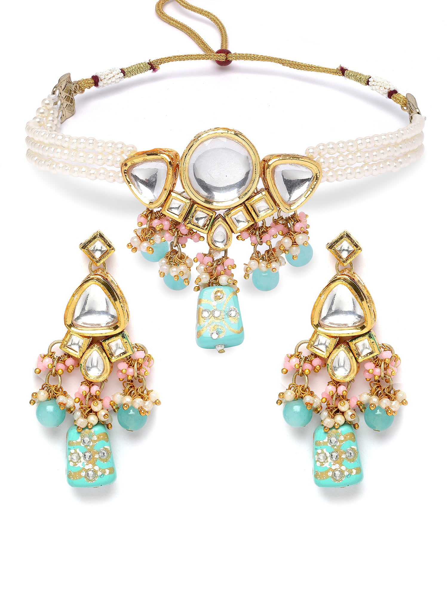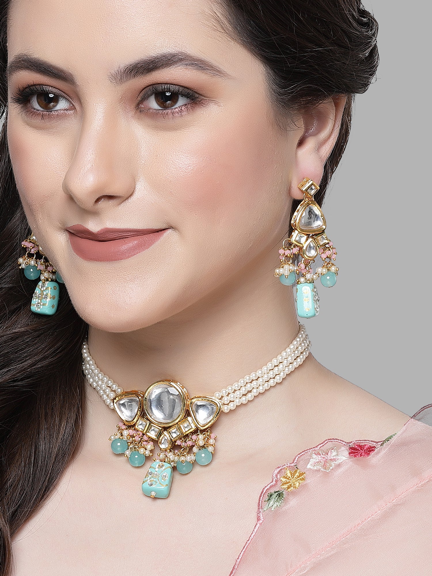 Karatcart Light Blue Tumble and Pearl Studded Polki Kundan Choker Necklace Set for Women