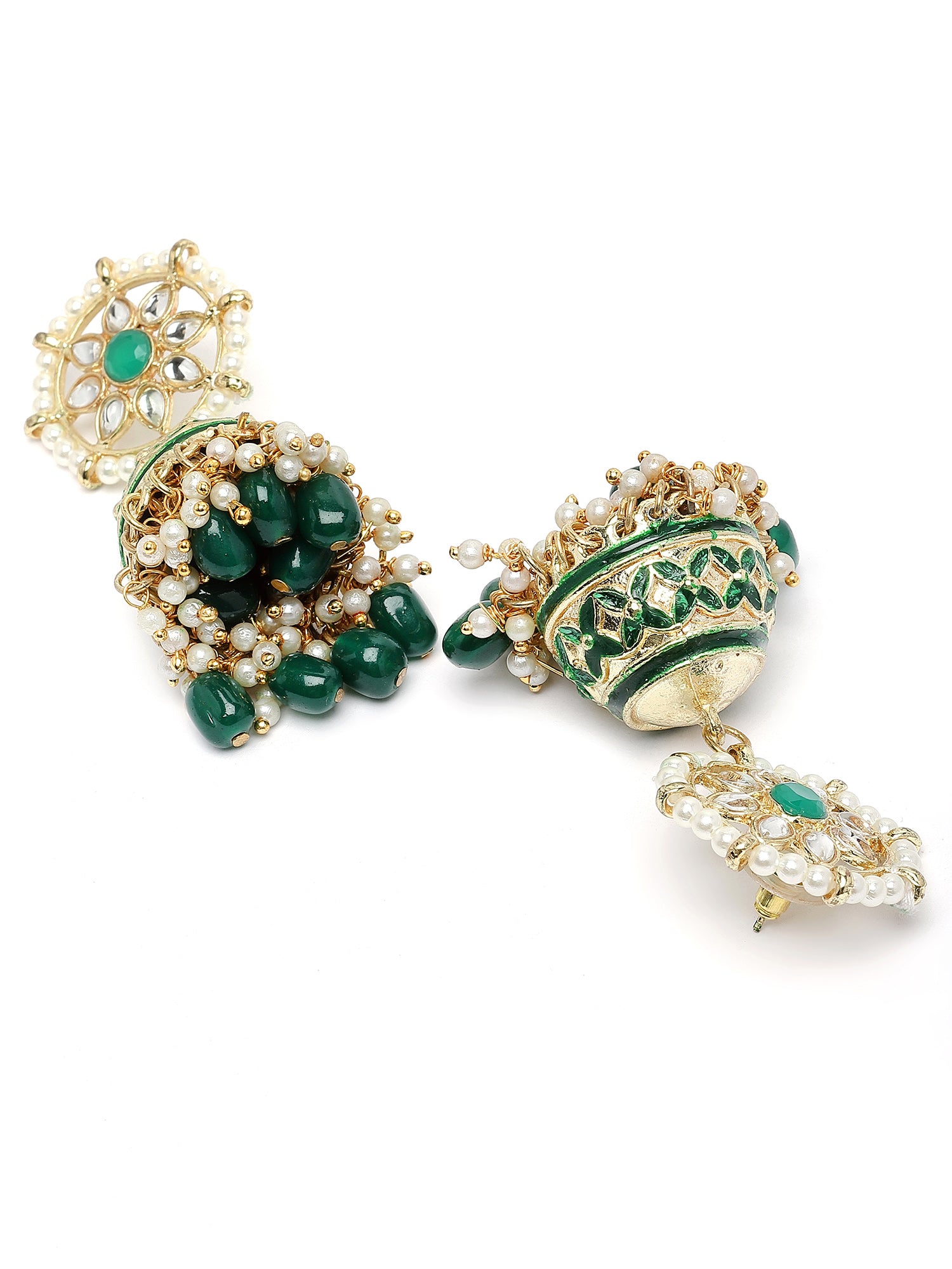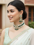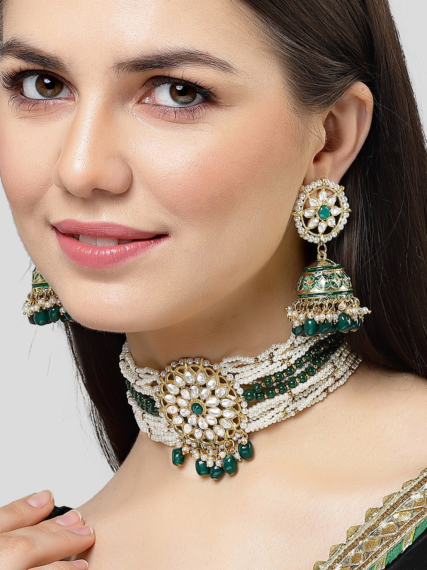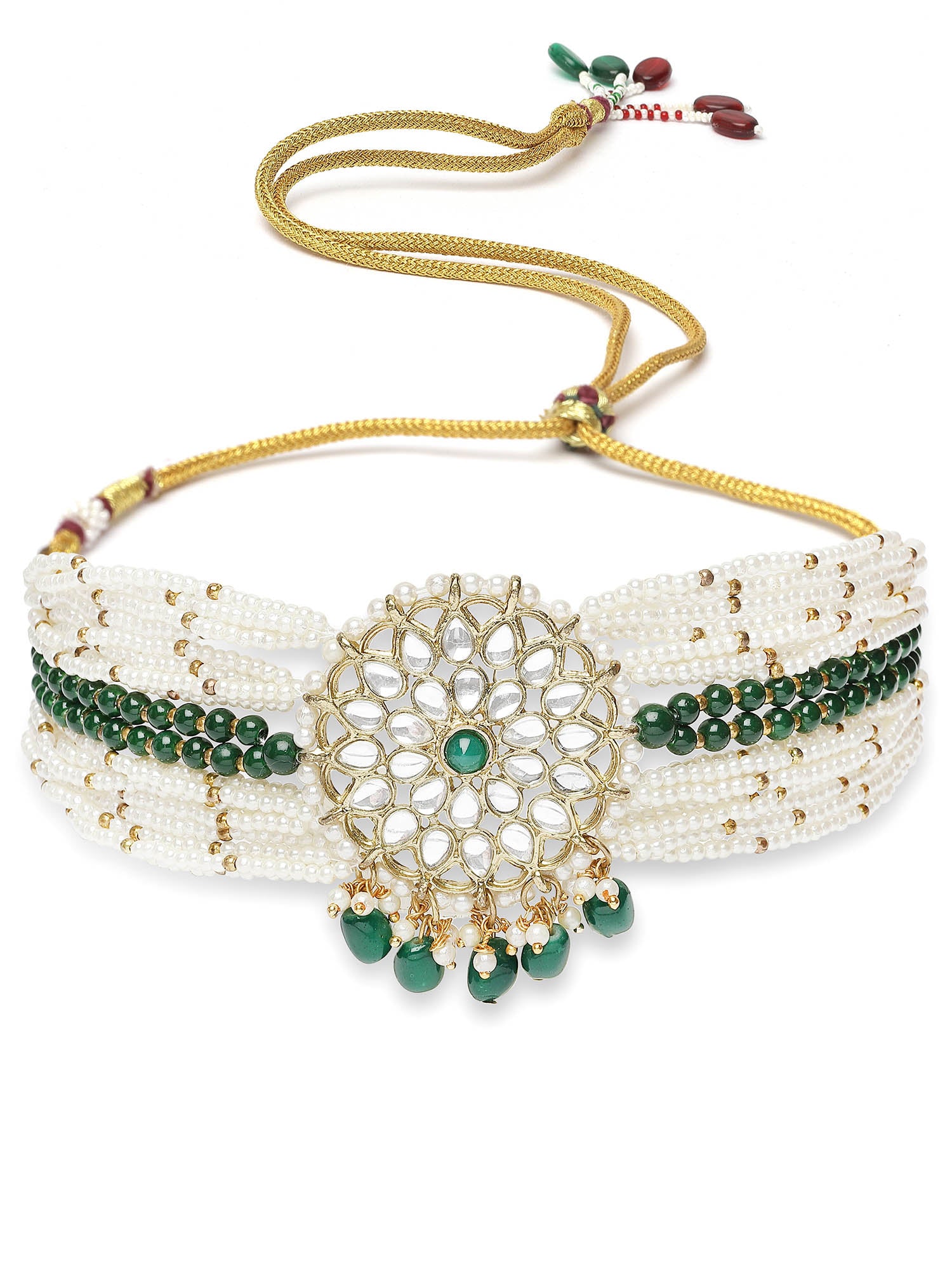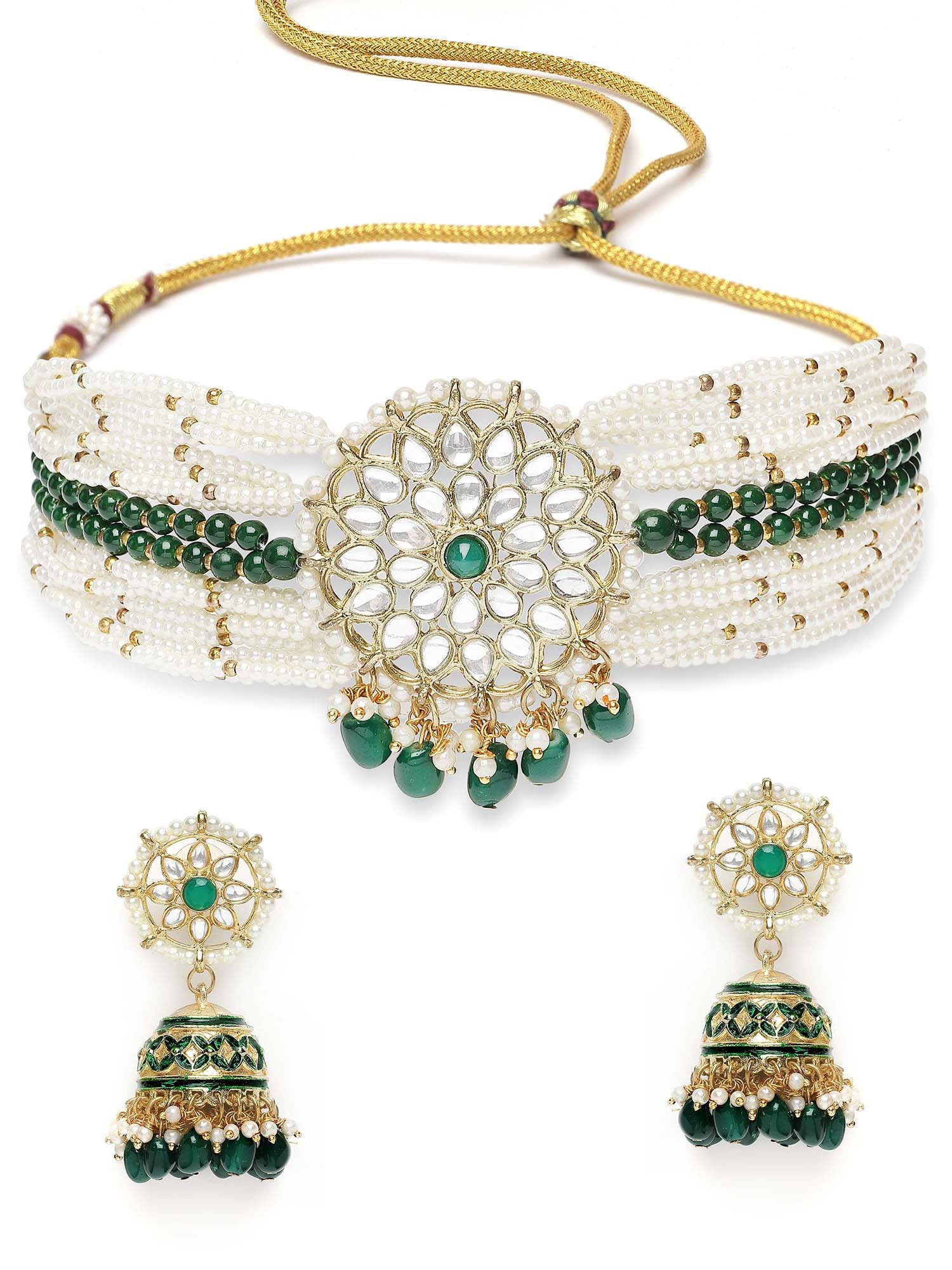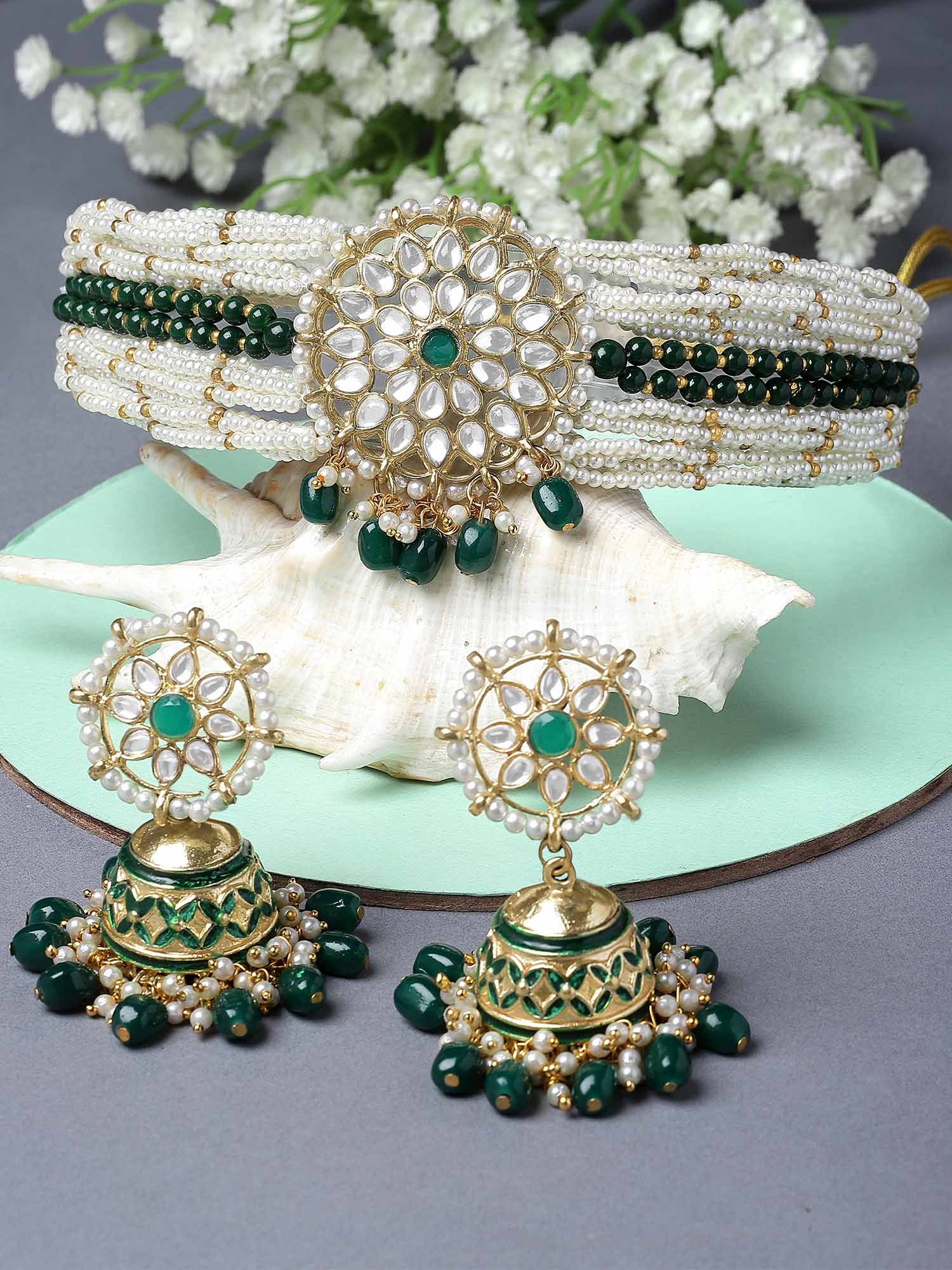 Karatcart Gold Plated Green Beads and Pearl Beaded Kundan Choker Necklace Set for Women