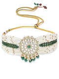 A harmonious blend of elegance and vibrant color. This exquisite choker features radiant green beads paired with lustrous pearls and intricate Kundan detailing, all set against a luxurious gold-plated base. The combination of green beads and pearls creates a striking contrast, while the Kundan accents add a touch of sophistication.