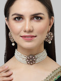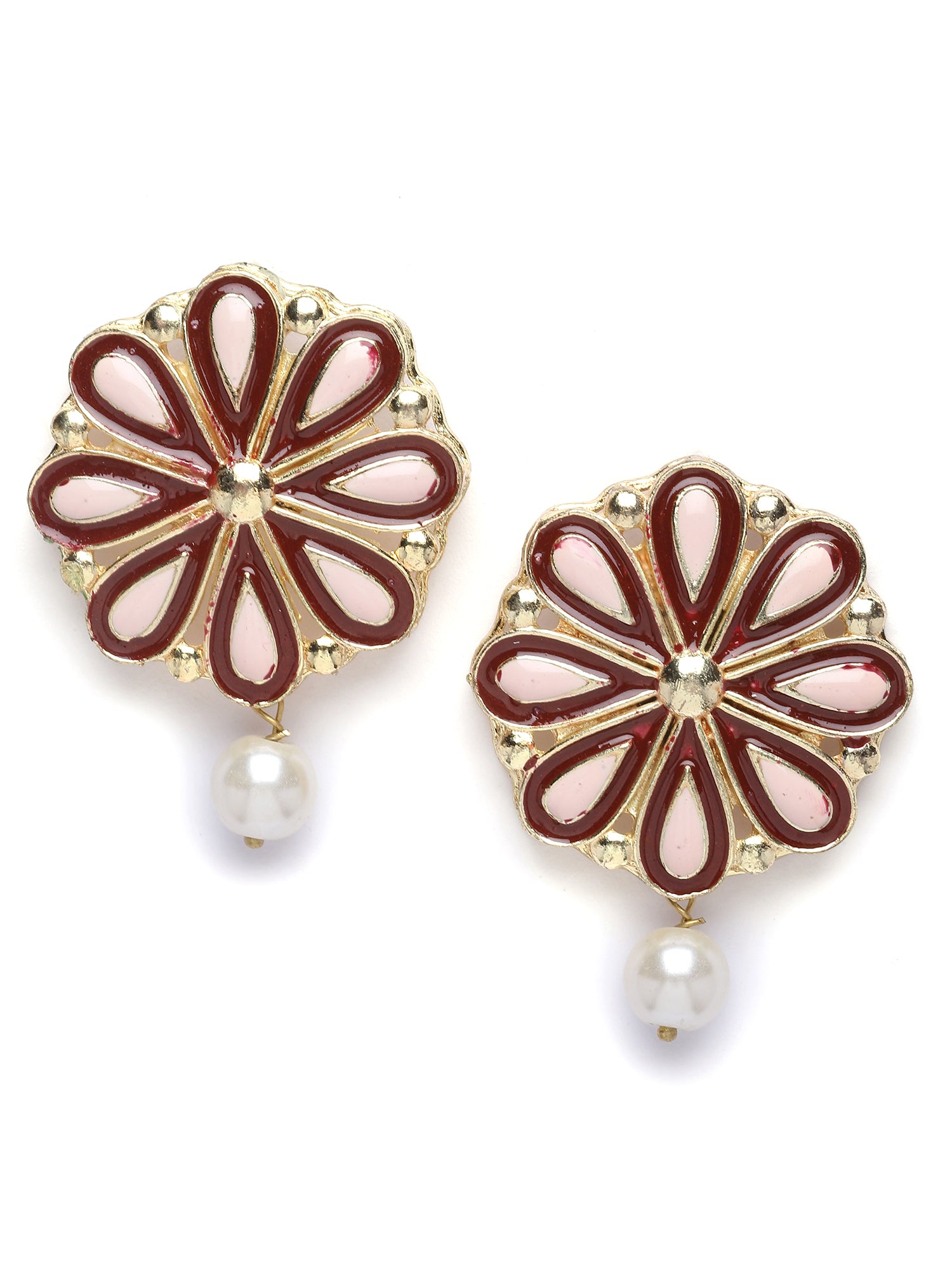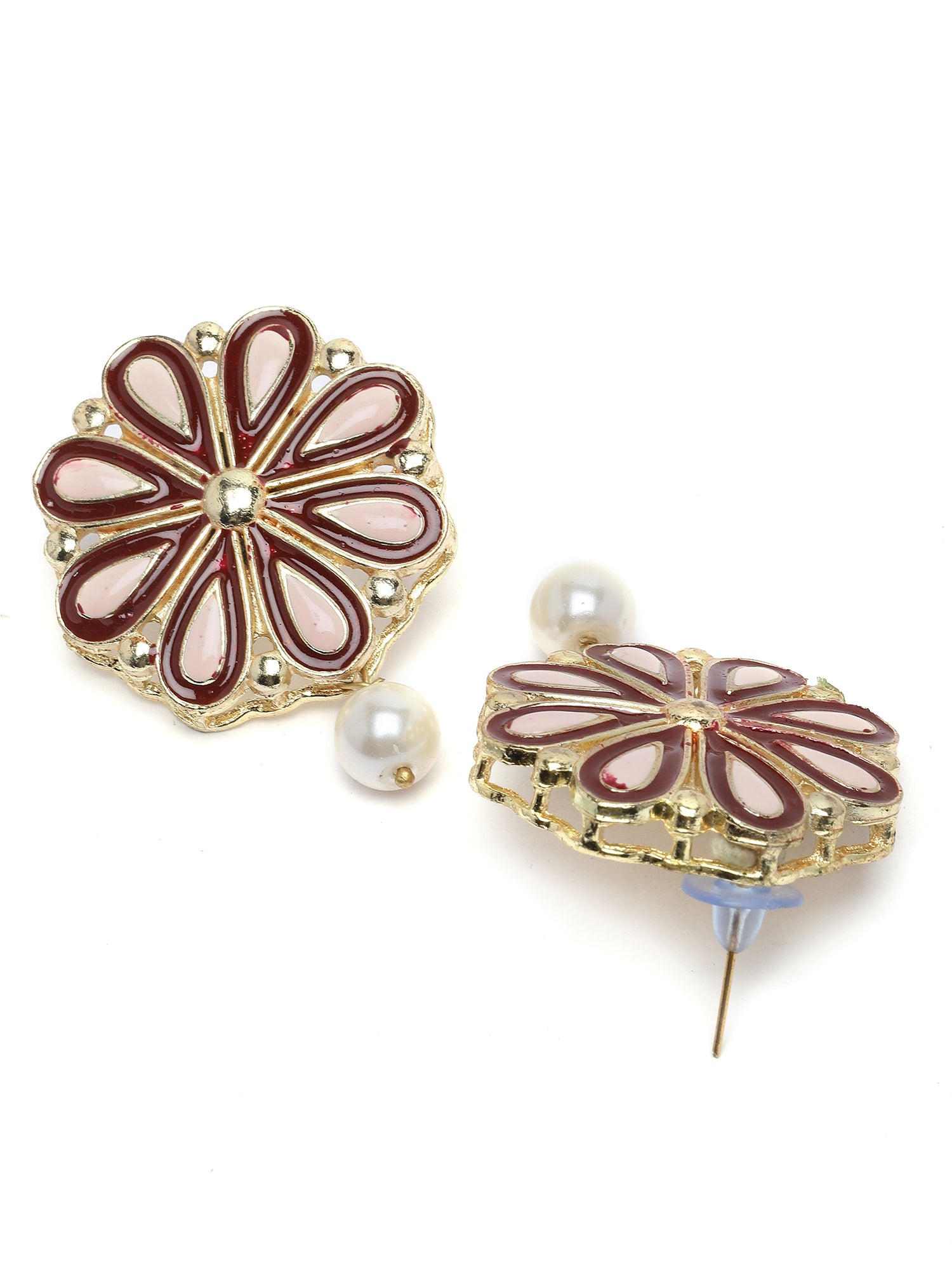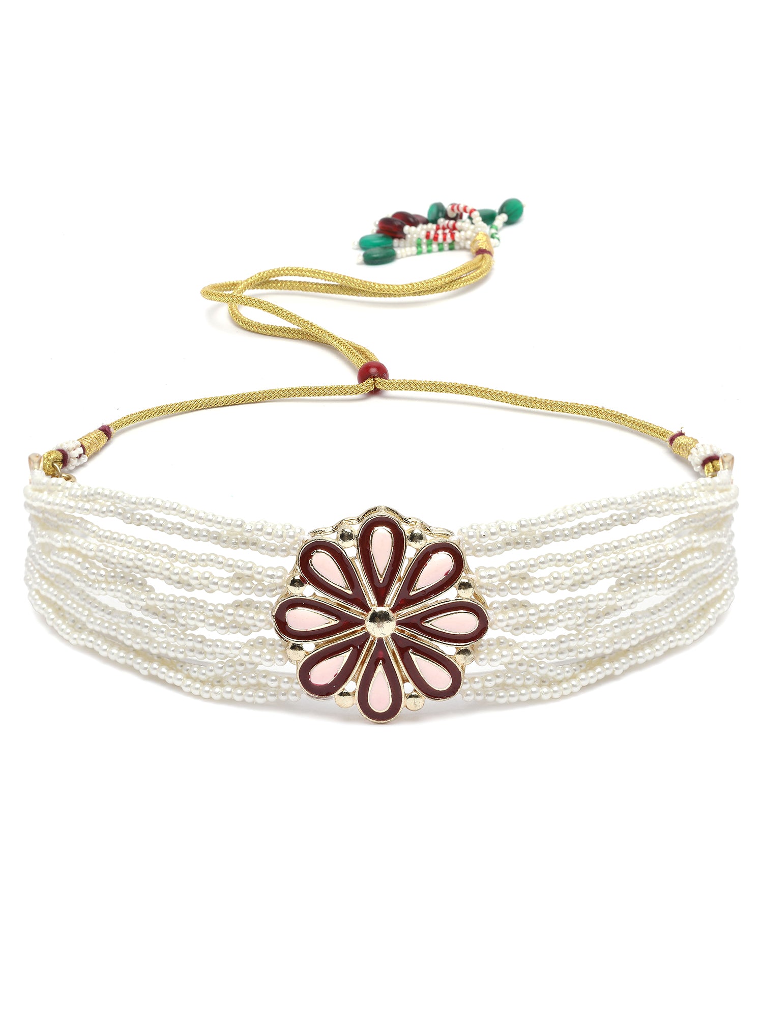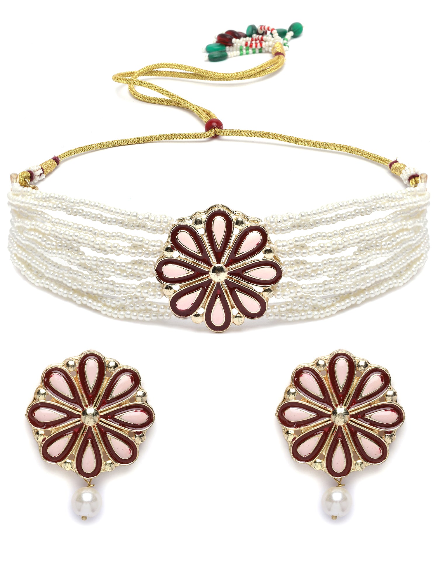 Karatcart Gold Plated Maroon Meena Floral Pearl Beaded Kundan Choker Necklace Set for Women