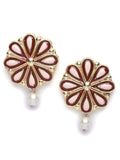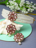 Introducing the Maroon Floral Design Beaded Pearl Choker, a luxurious and intricate piece of jewelry that beautifully combines tradition with elegance. This exquisite choker set features a stunning maroon Meena floral design, accentuated by the rich gold plating that adds a touch of opulence.