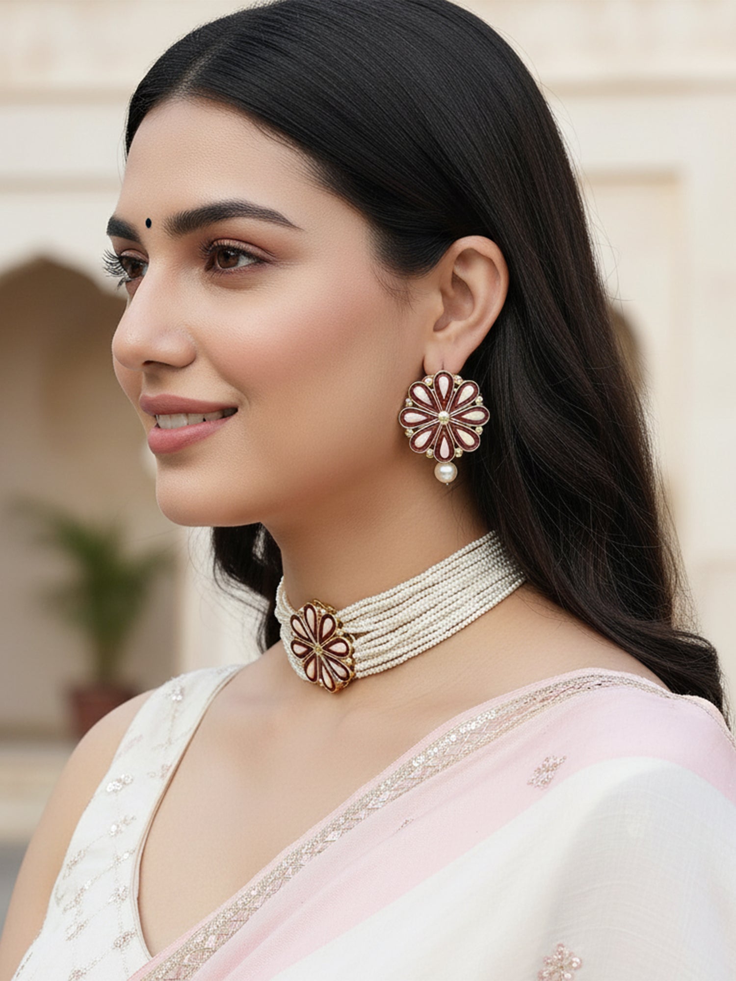 The choker is adorned with delicate pearl beads, which complement the intricate Kundan work, creating a perfect harmony of color and texture. The floral motifs in the maroon Meena work give the necklace a timeless appeal, making it an ideal choice for festive occasions, weddings, or special events.