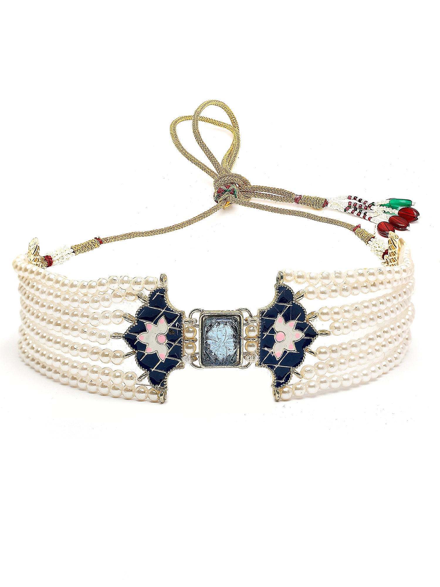 The Karatcart Gold Plated Blue Meena Kundan Choker Necklace Set is a perfect blend of tradition and elegance. Designed with intricate Meenakari craftsmanship, this choker features beautifully carved blue stones set against a radiant gold-plated finish. The delicate pearl embellishments add a touch of grace, making it a timeless piece that enhances your ethnic charm. This lightweight yet statement-making choker sits comfortably around the neck, offering a regal and sophisticated appeal. The Indian ethnic essence of this designer piece is complemented by its contemporary structure, making it ideal for both festive occasions and grand celebrations. The vibrant enamel detailing and luxurious Kundan work reflect the richness of heritage jewelry while maintaining a modern, fashionable aesthetic. Whether paired with a traditional saree or an elegant lehenga, this choker set ensures you stand out effortlessly. Its easy-to-wear and comfortable design makes it perfect for long hours, while its classic yet trendy appeal makes it a must-have in any jewelry collection. Adorn yourself with this exquisite Meena Kundan Choker and let your style speak of refined sophistication.