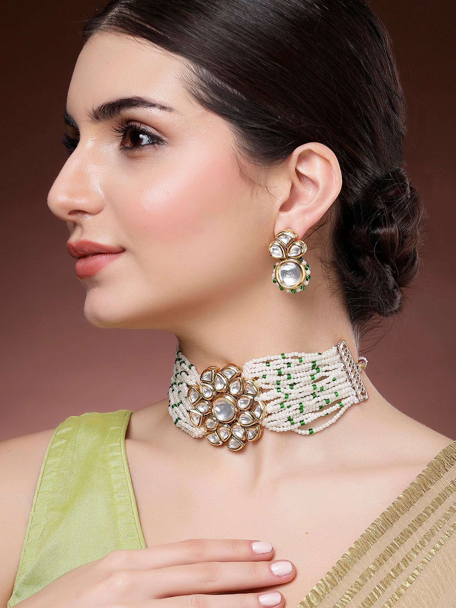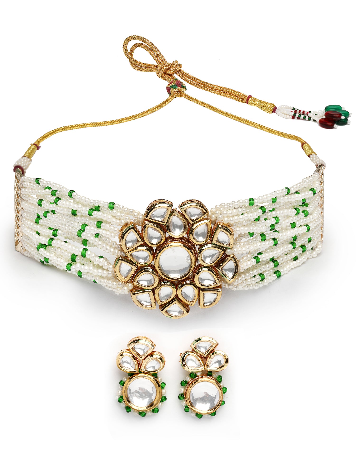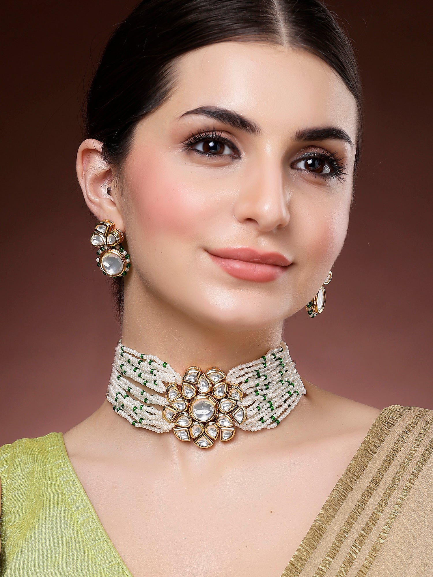 Karatcart Green Beads Polki Kundan Floral Design Choker Necklace Set for Women