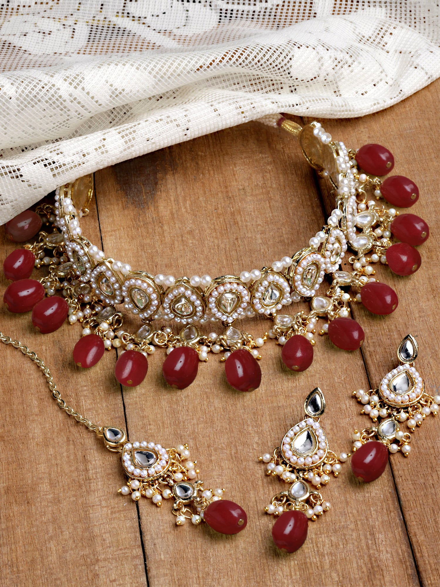 Karatcart Gold Plated Red Tumble Choker Necklace Set for Women