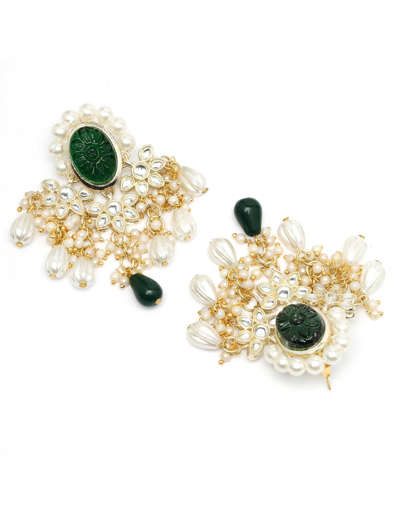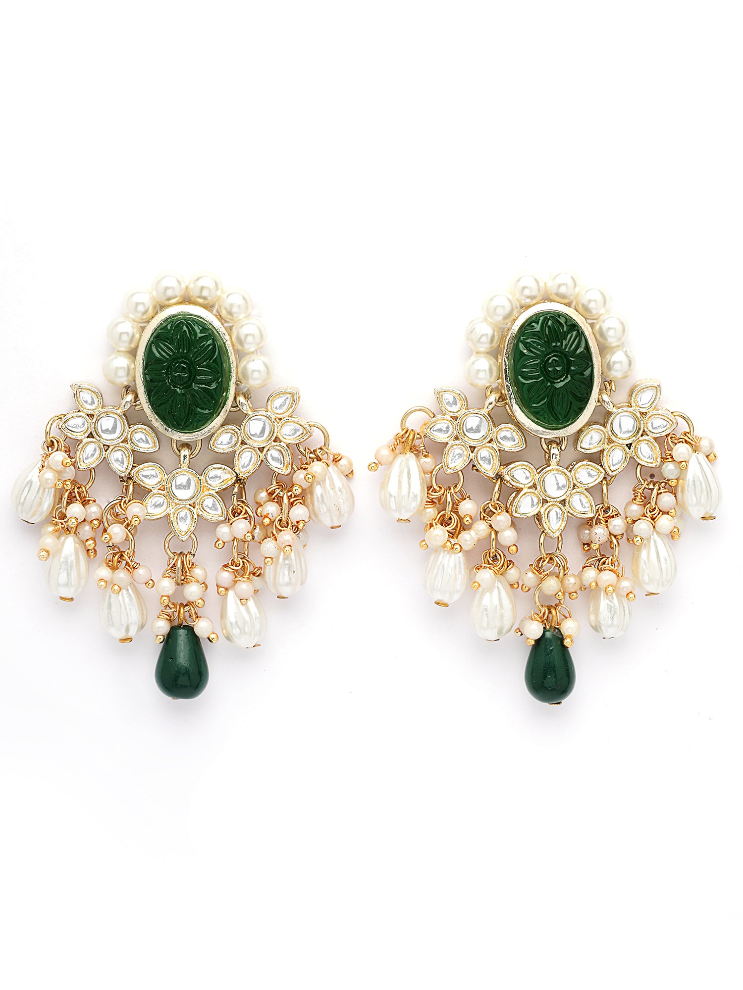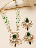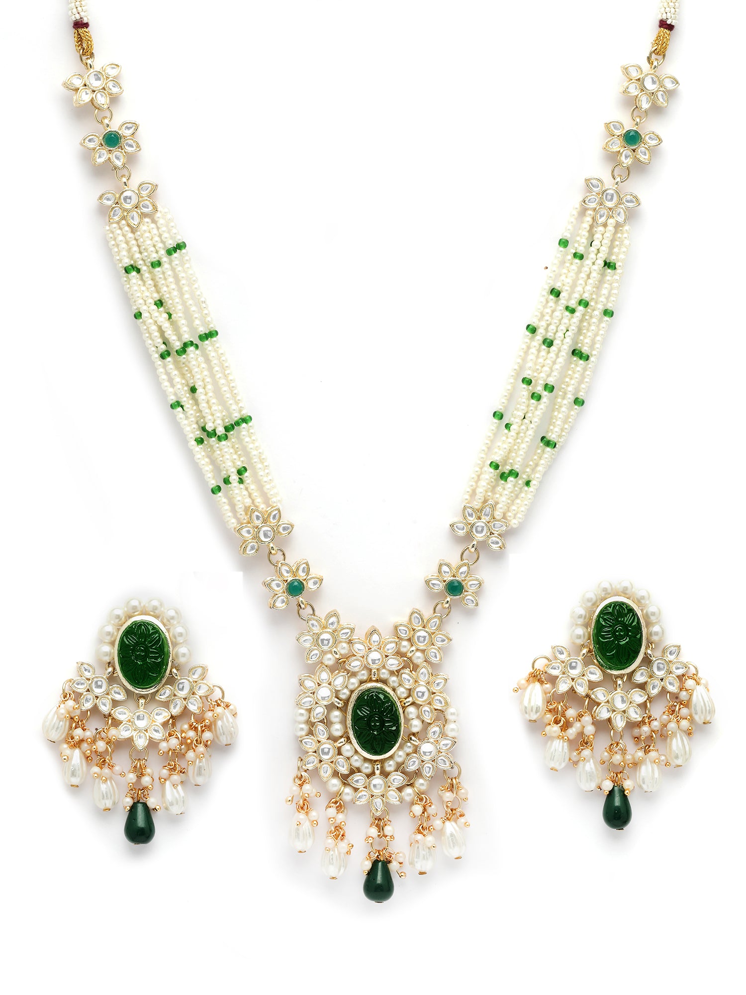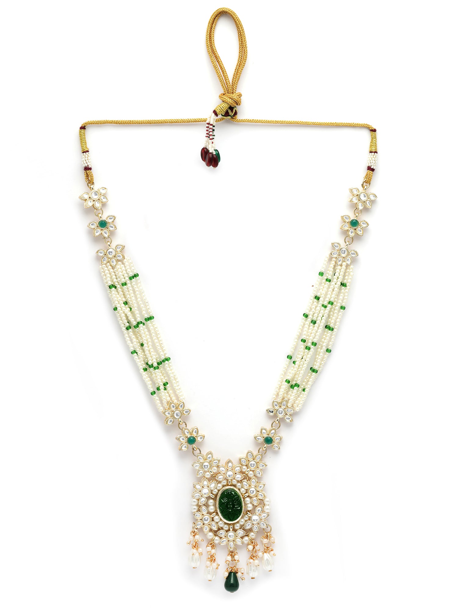 KARATCART Ethnic Gold Plated Green Carved Stone and Kundan Pearl Beaded Necklace Set for Women