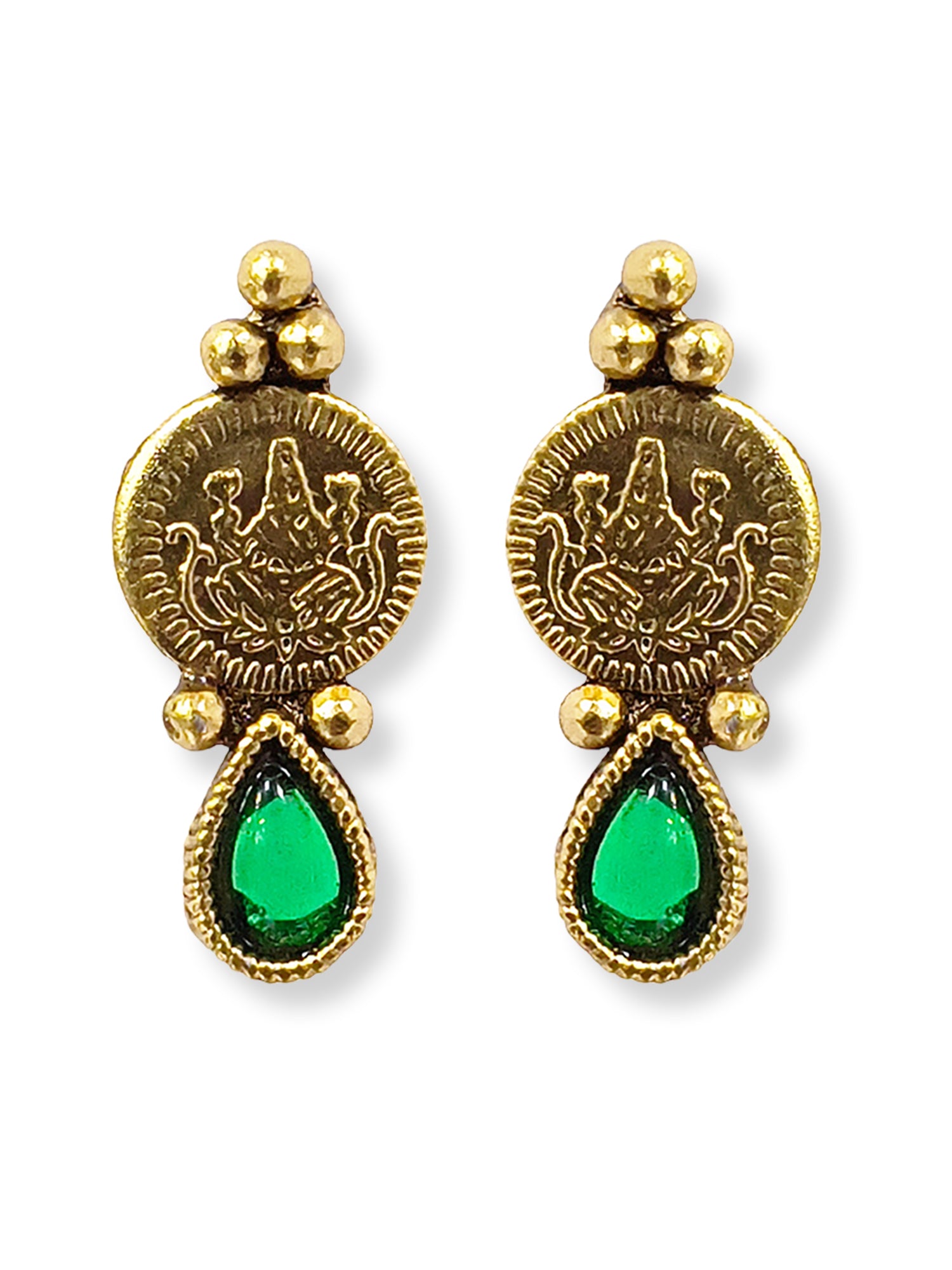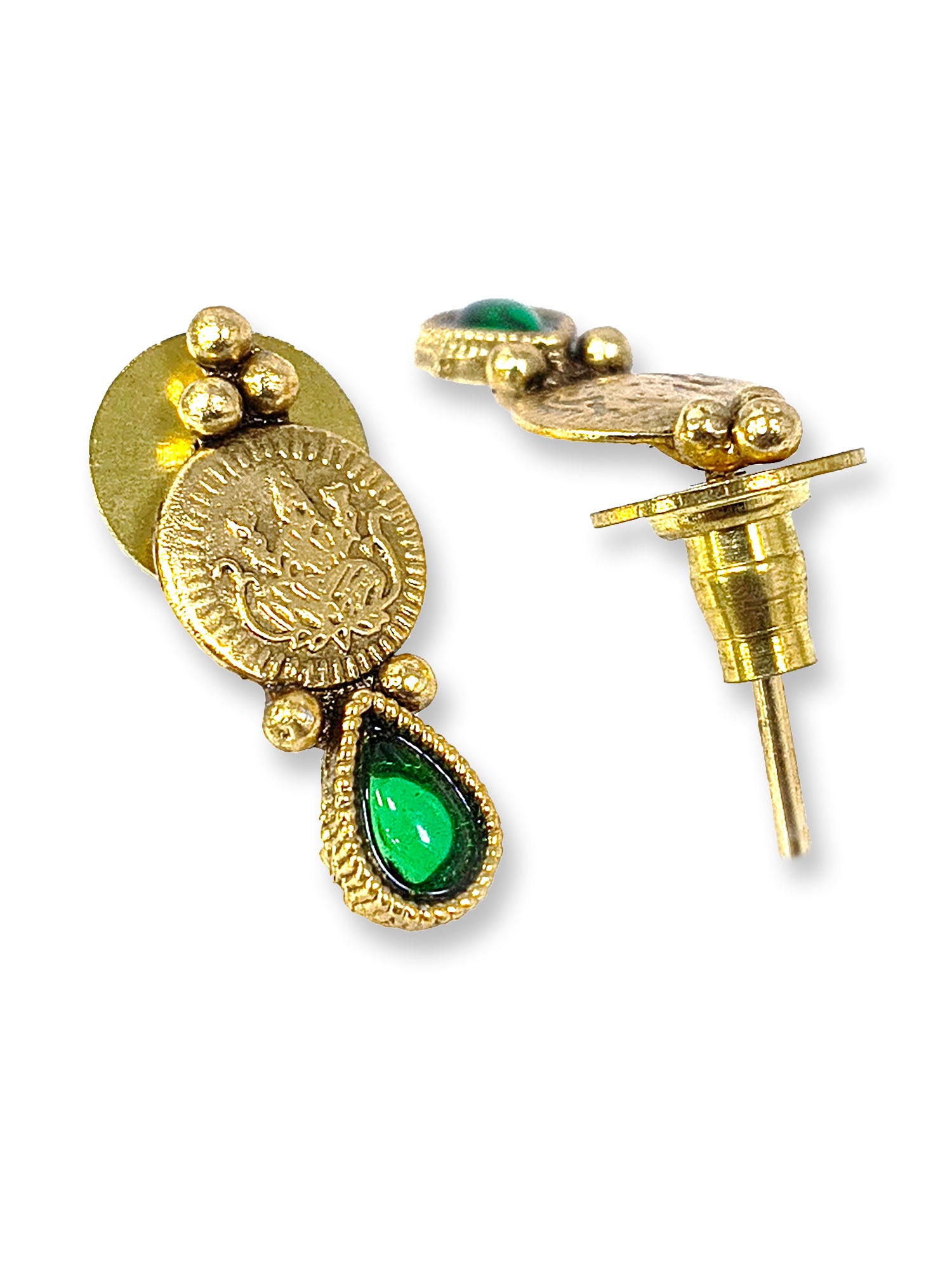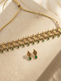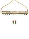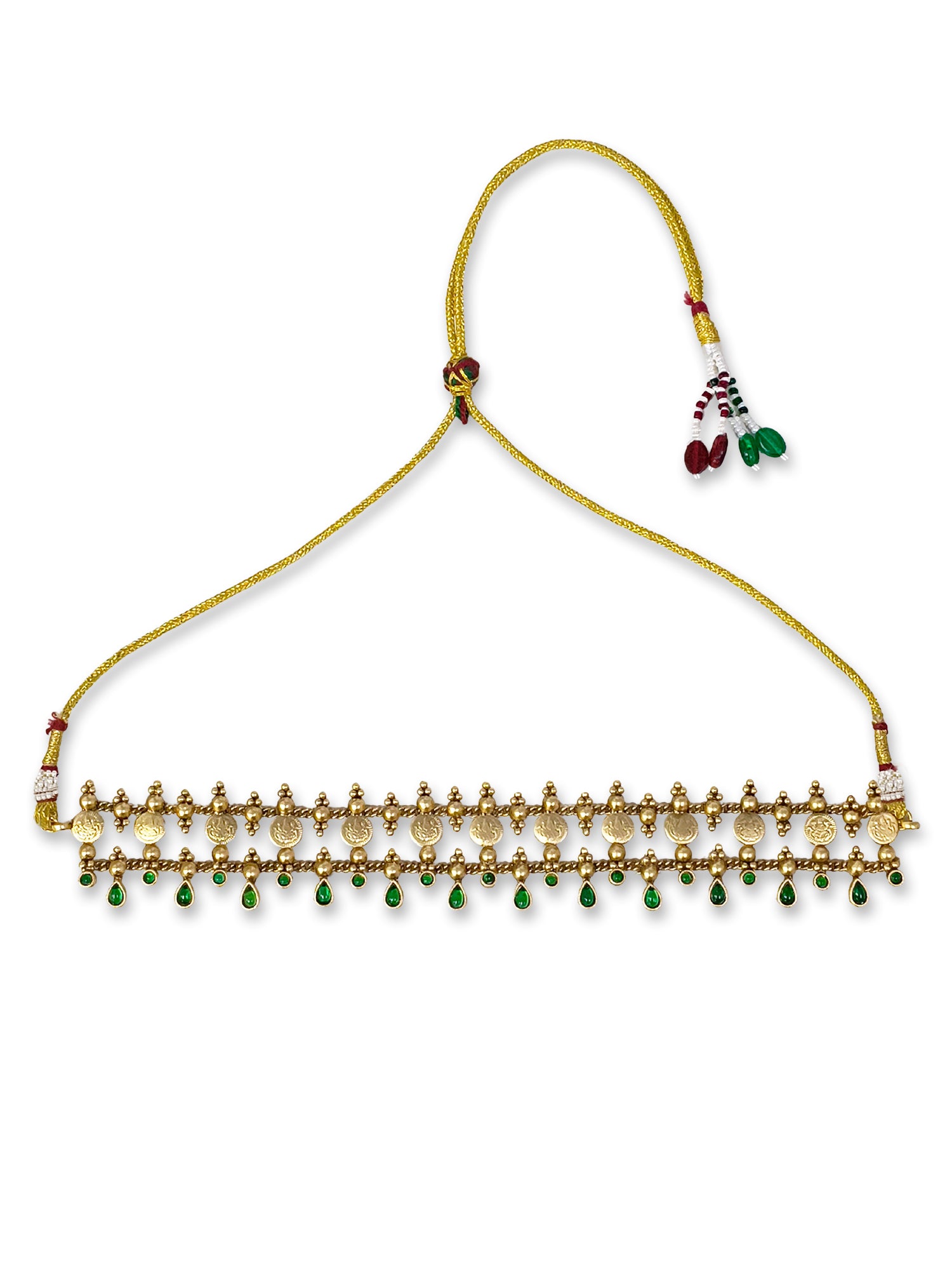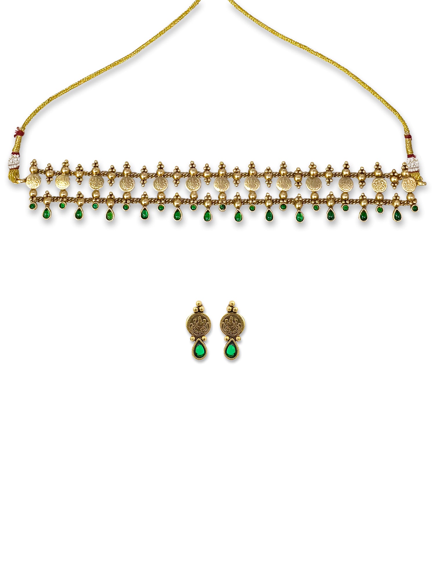 KARATCART Traditional Temple Coin Design Green Stone Gold-Plated Choker Jewellery Set for Women