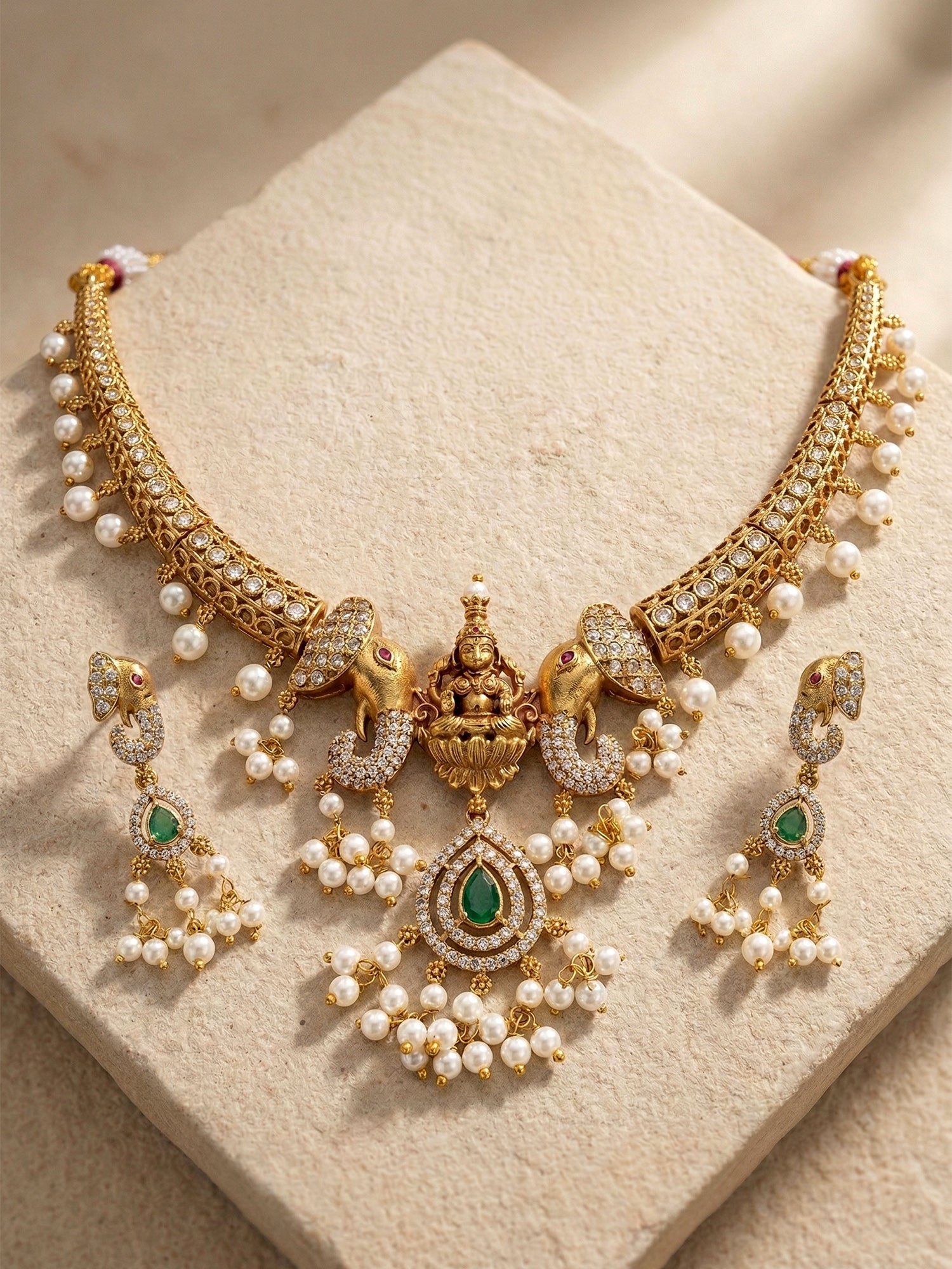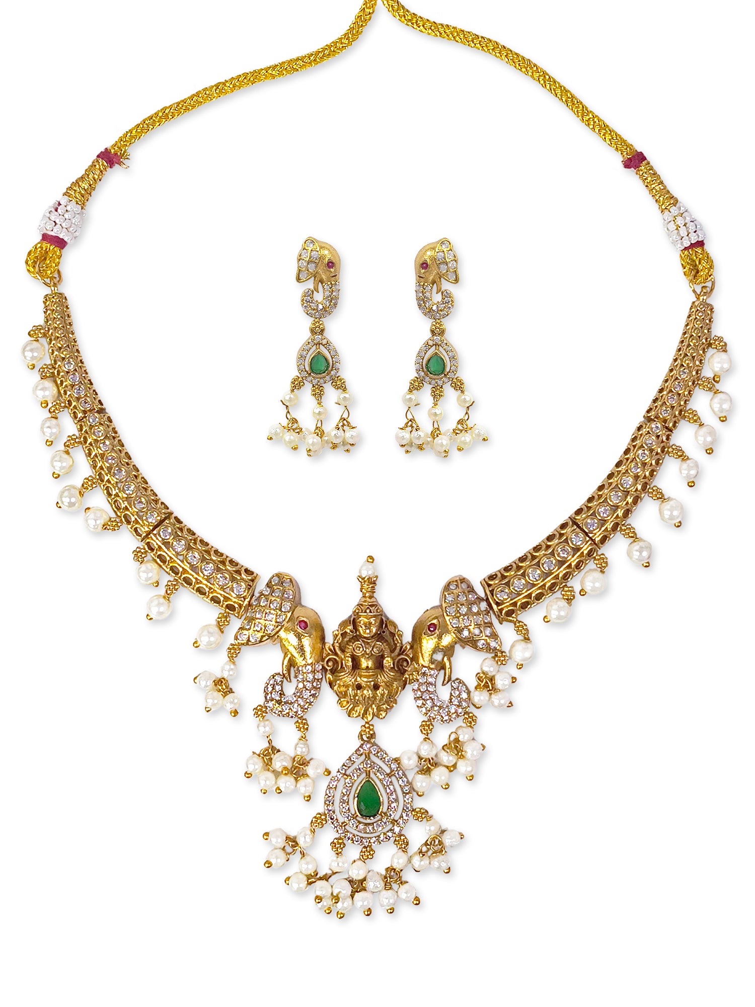 KARATCART South Indian Temple Style Lakshmi Mata American Diamond Gold-Plated Jewellery Set