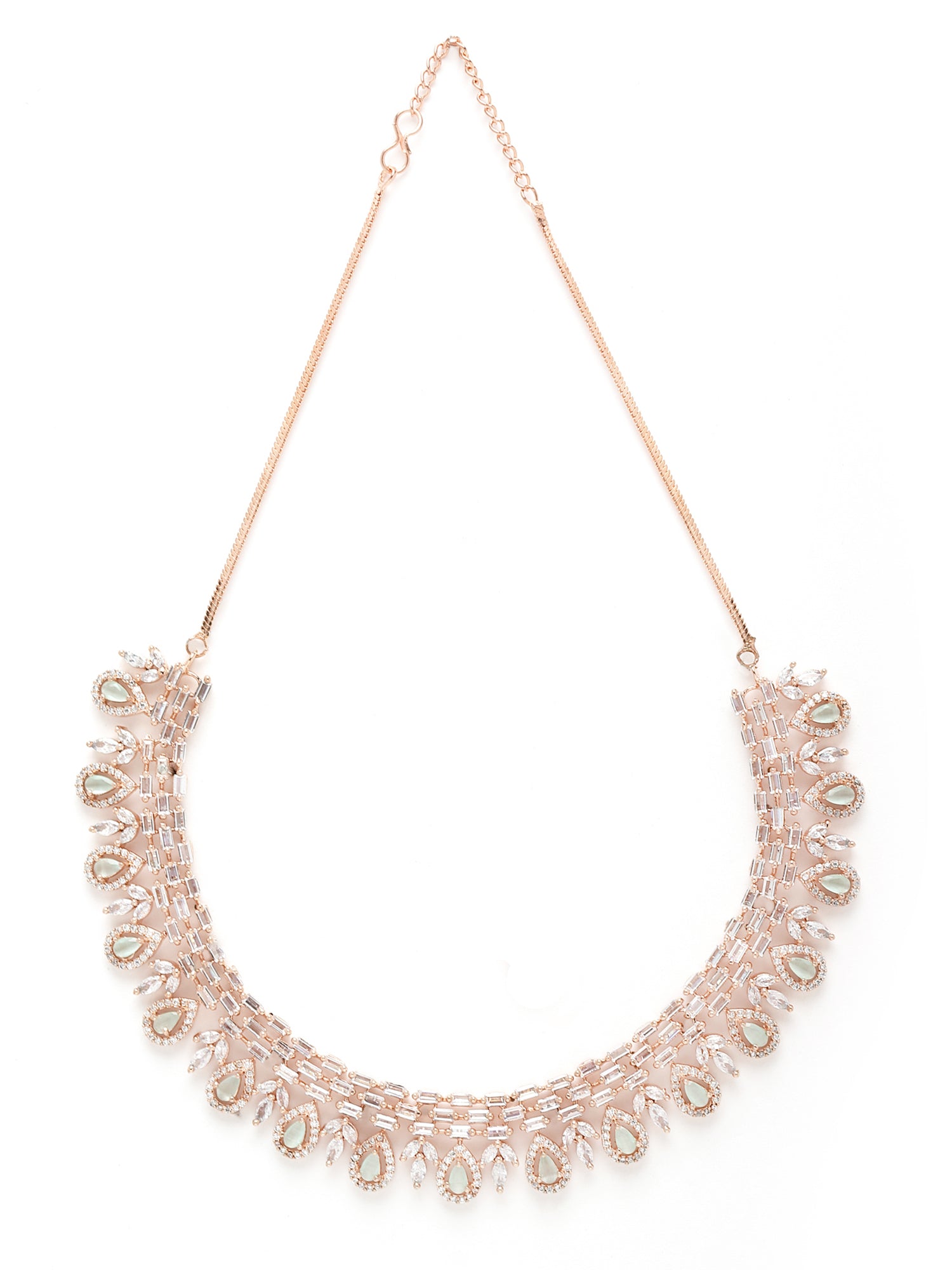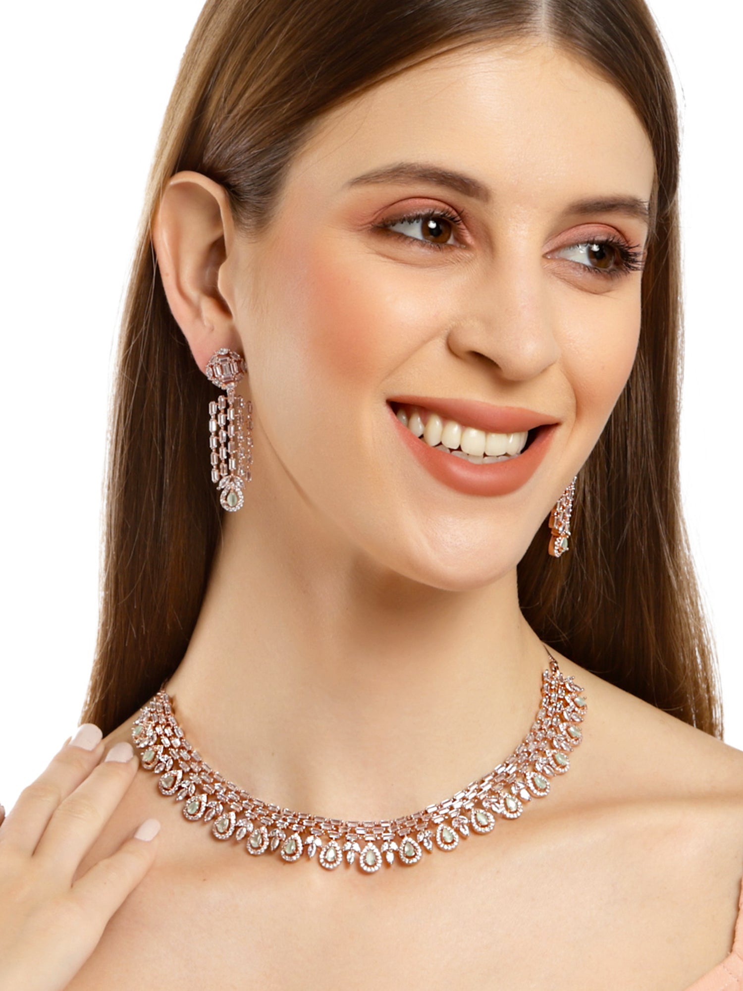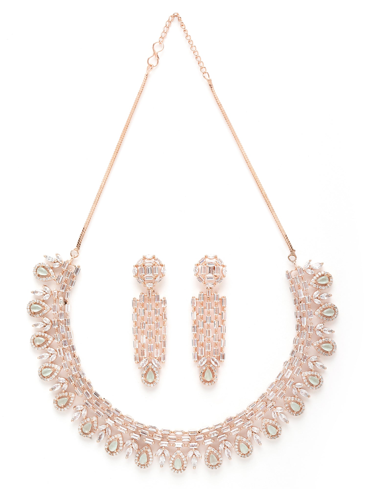 - Rose Gold Plated Lime Green Cubic Zirconia Studded Necklace Set For Women. It is made with High-Quality AAA Cubic zirconia. Perfect for Weddings, Parties, Festivals, and Traditional Occasions.