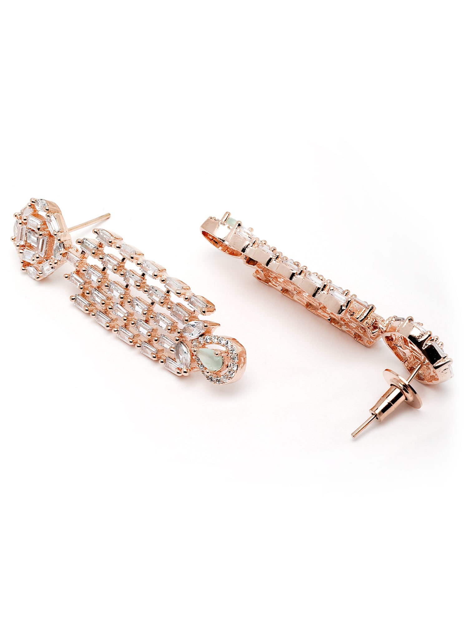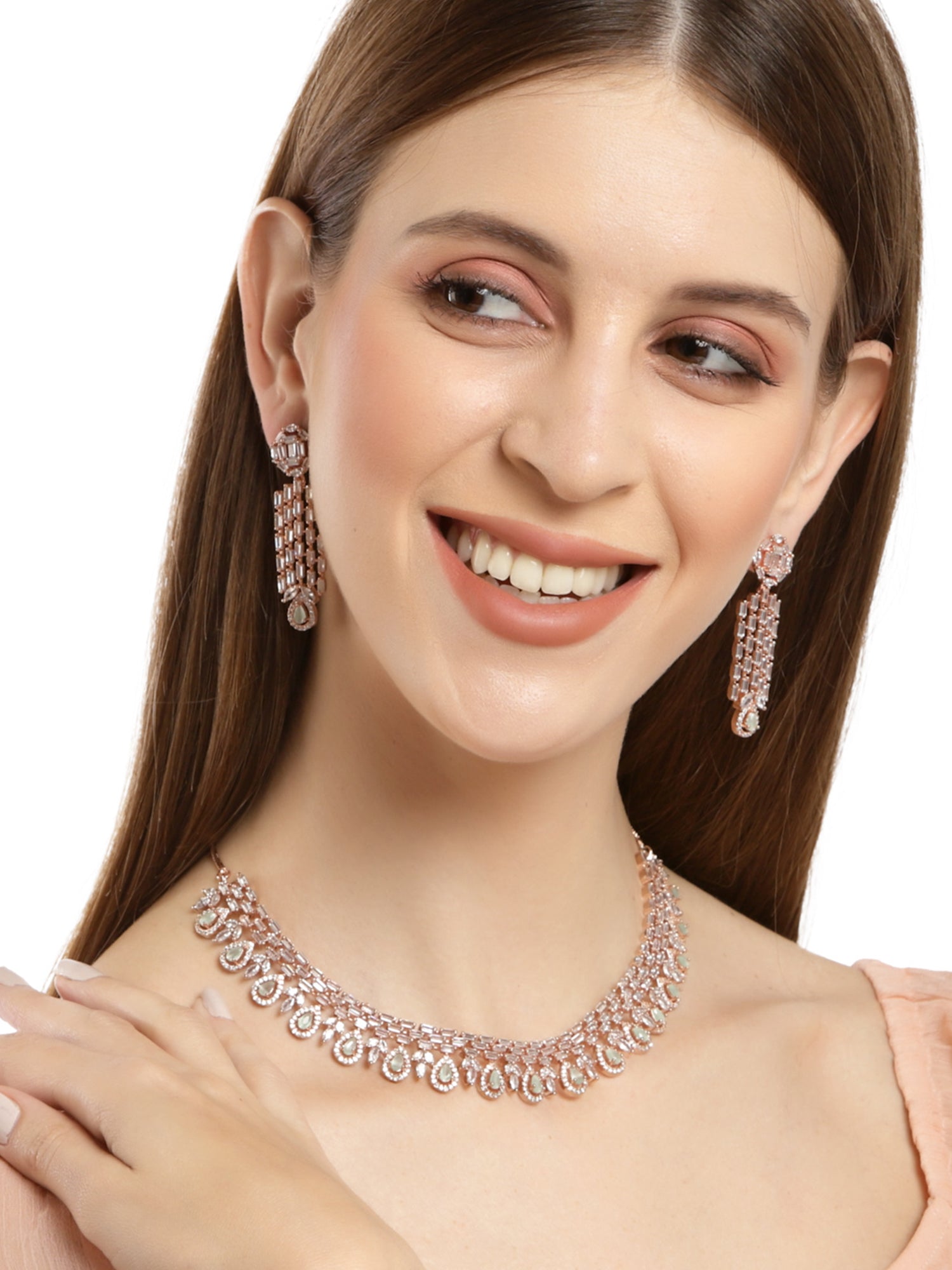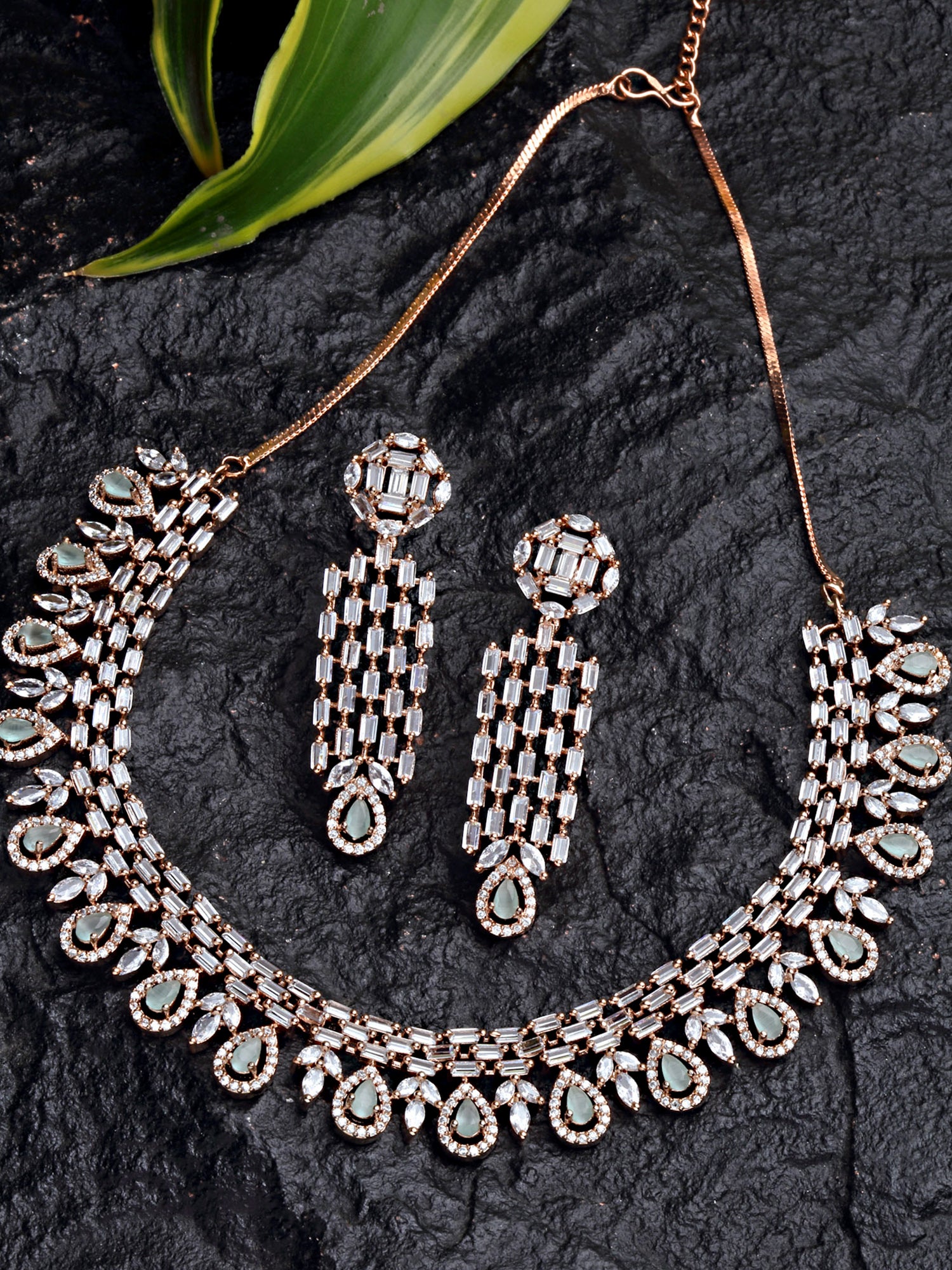 - Rose Gold Plated Lime Green Cubic Zirconia Studded Necklace Set For Women. It is made with High-Quality AAA Cubic zirconia. Perfect for Weddings, Parties, Festivals, and Traditional Occasions.