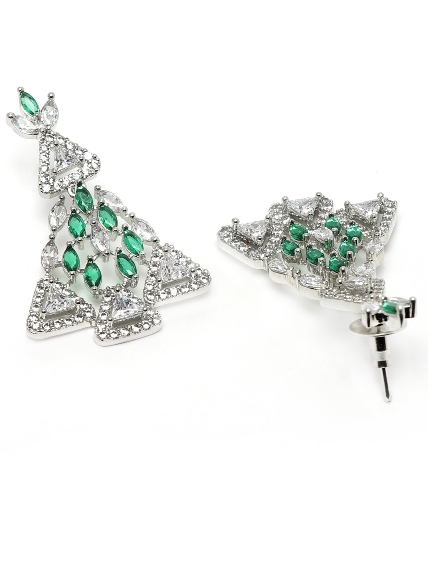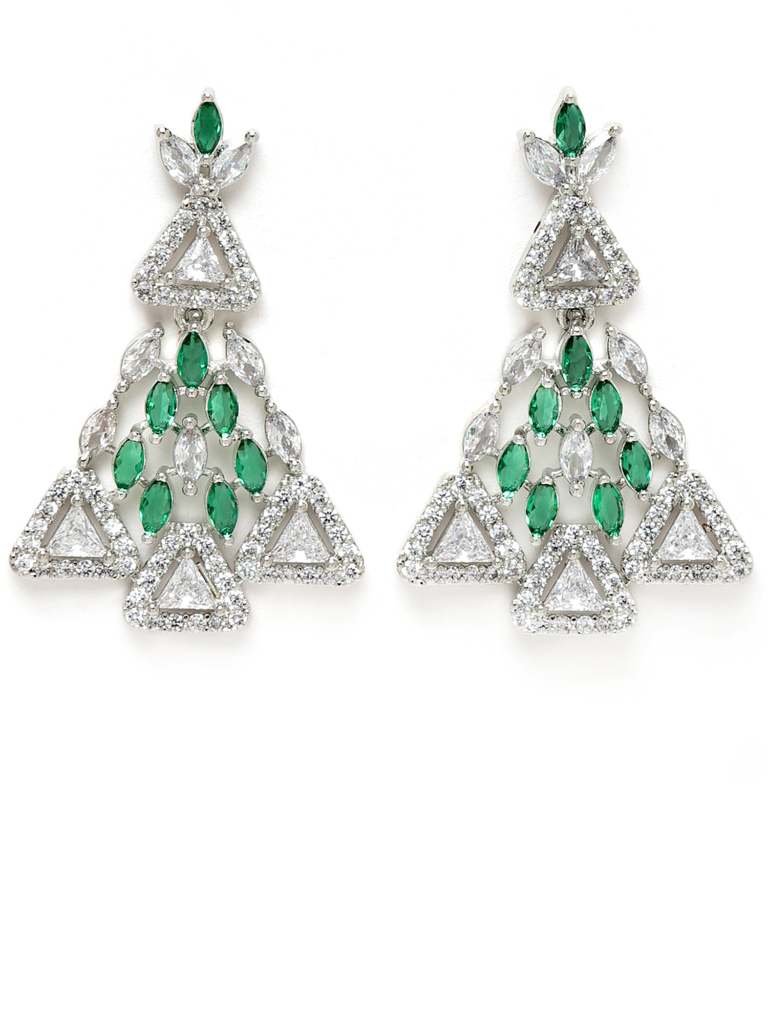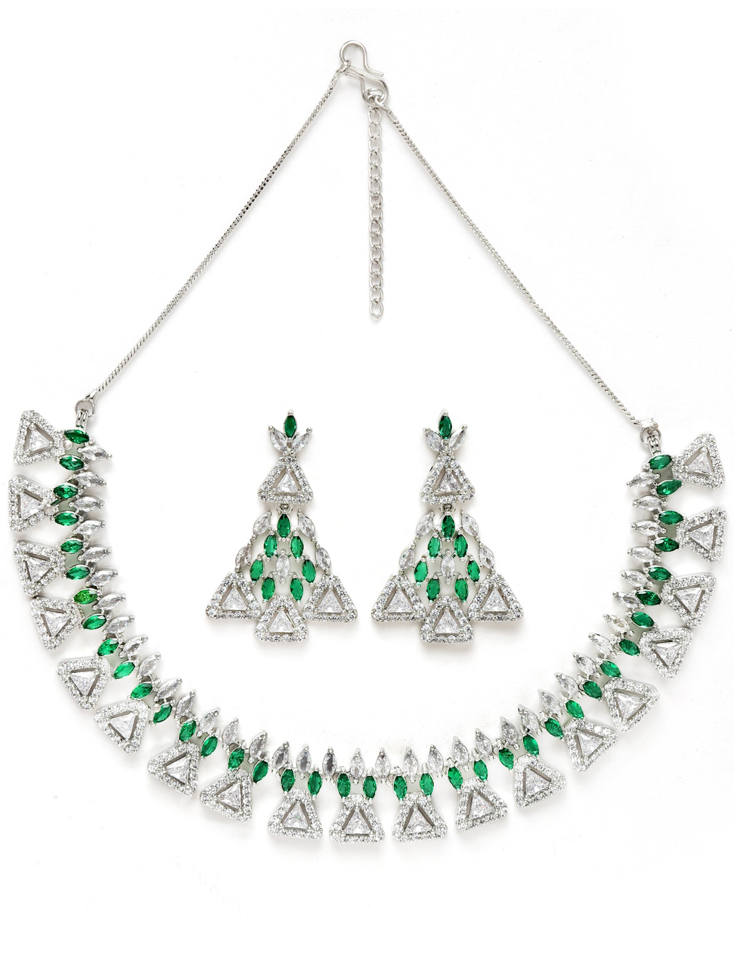 - Karatcart Silver Plated Triangle Shape Green Cubic Zirconia Studded Necklace Set for Women. It is made with high-quality Kundan Stones which makes them very skin-friendly. Perfect for Weddings, Parties, Festivals, and Traditional Occasions. Gracefully pair Saree, Kurti, or any Indo-western outfit to enhance your look. These are made from toxic-free materials which are Anti-Allergic and Safe for the skin.