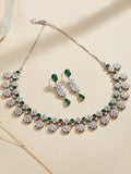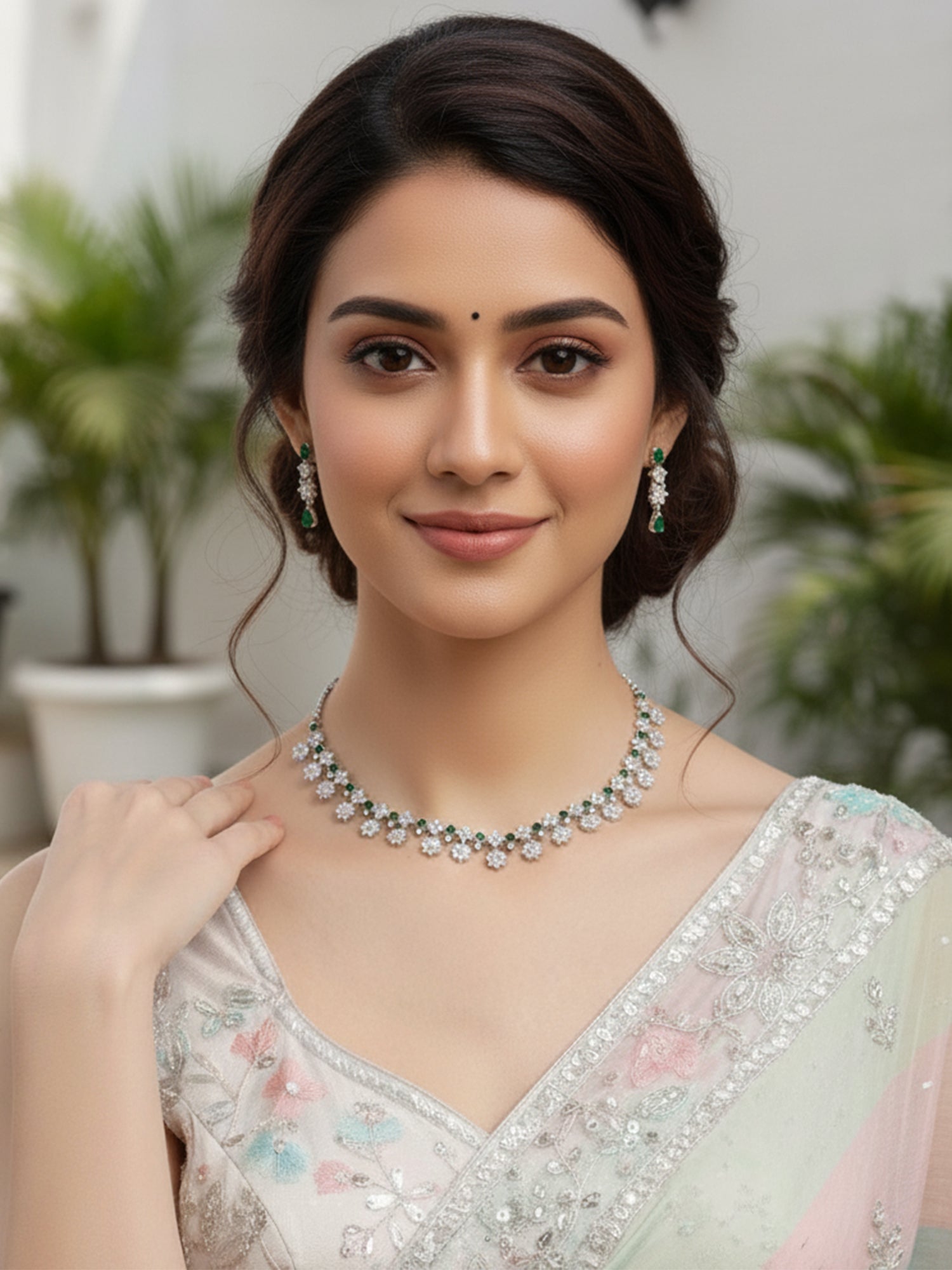 - Karatcart Silver Plated Star Shape Green Cubic Zirconia Studded Necklace Set for Women. It is made with high-quality Kundan Stones which makes them very skin-friendly. Perfect for Weddings, Parties, Festivals, and Traditional Occasions. Gracefully pair Saree, Kurti, or any Indo-western outfit to enhance your look. These are made from toxic-free materials which are Anti-Allergic and Safe for the skin.