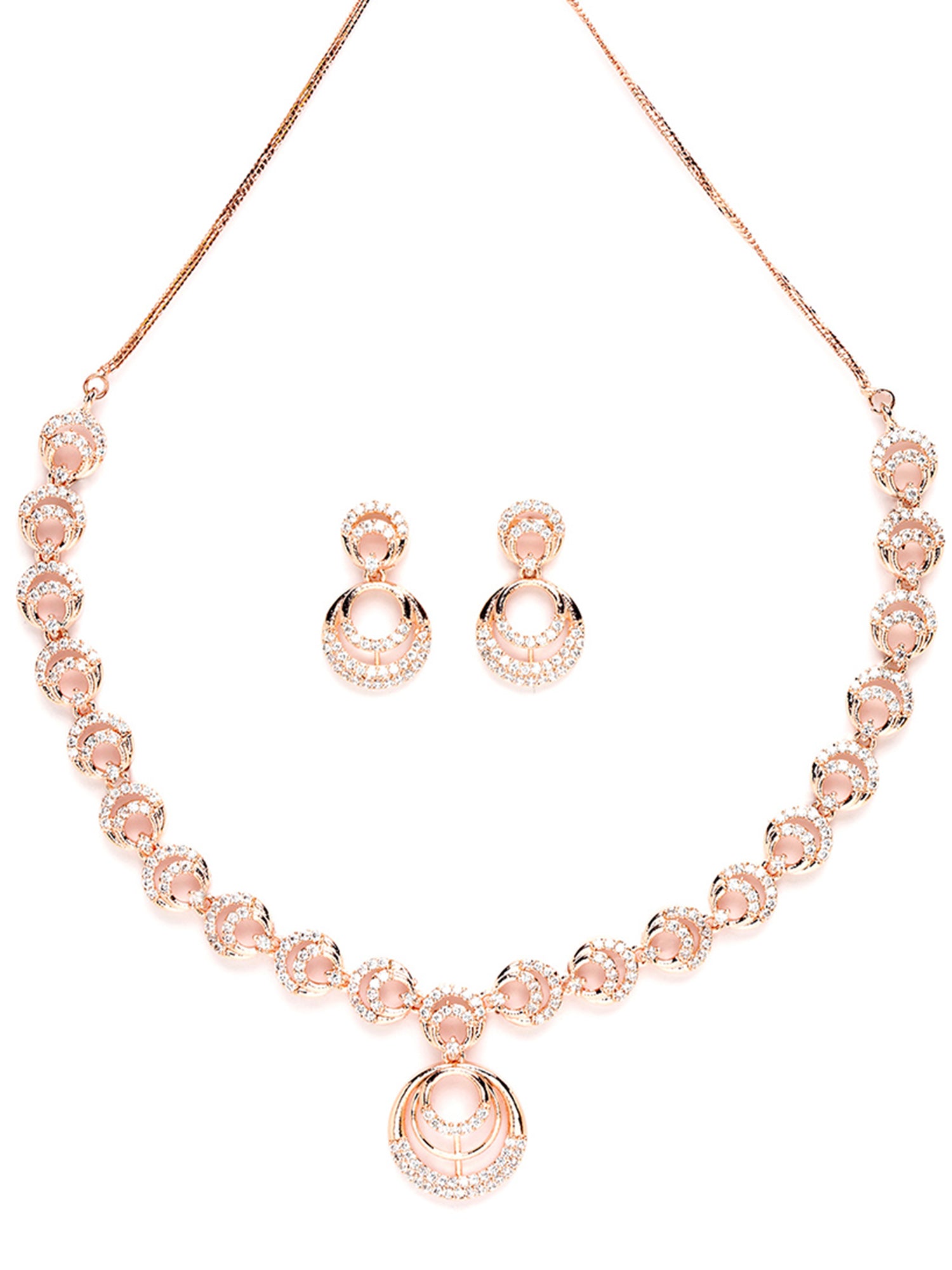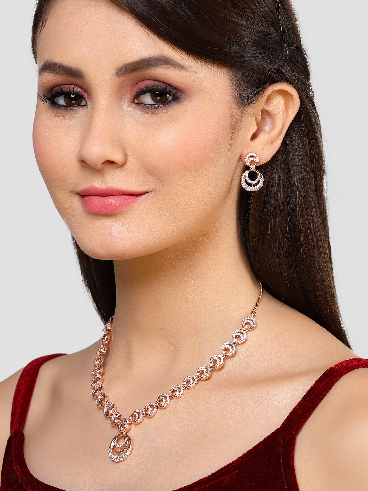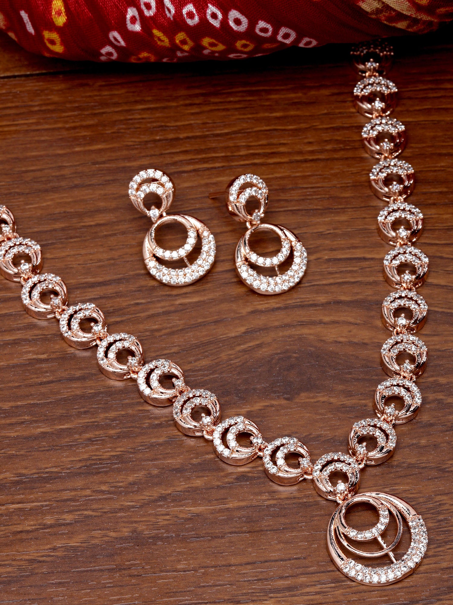 - This is a Rose Gold Jewellery Set by Brand Karatcart which has American Diamond stones.This is Rose Gold Plated. We at KARATCART understand your desire to look the best on any day & we thrive in making any day an occasion. Every individual at Karatcart carries a passion for jewellery and it reflects in our beautiful designs as well as in our breathtaking craftsmanship. We create unique jewellery so you can make heads turn..