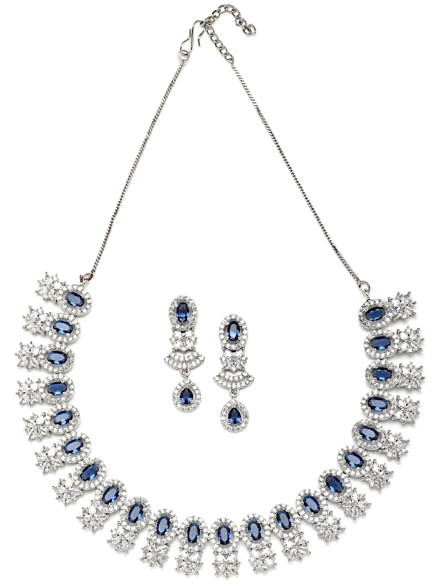 - This is a Blue Jewellery Set by Brand Karatcart which has American Diamond stones.This is Silver Plated. We at KARATCART understand your desire to look the best on any day & we thrive in making any day an occasion. Every individual at Karatcart carries a passion for jewellery and it reflects in our beautiful designs as well as in our breathtaking craftsmanship. We create unique jewellery so you can make heads turn..