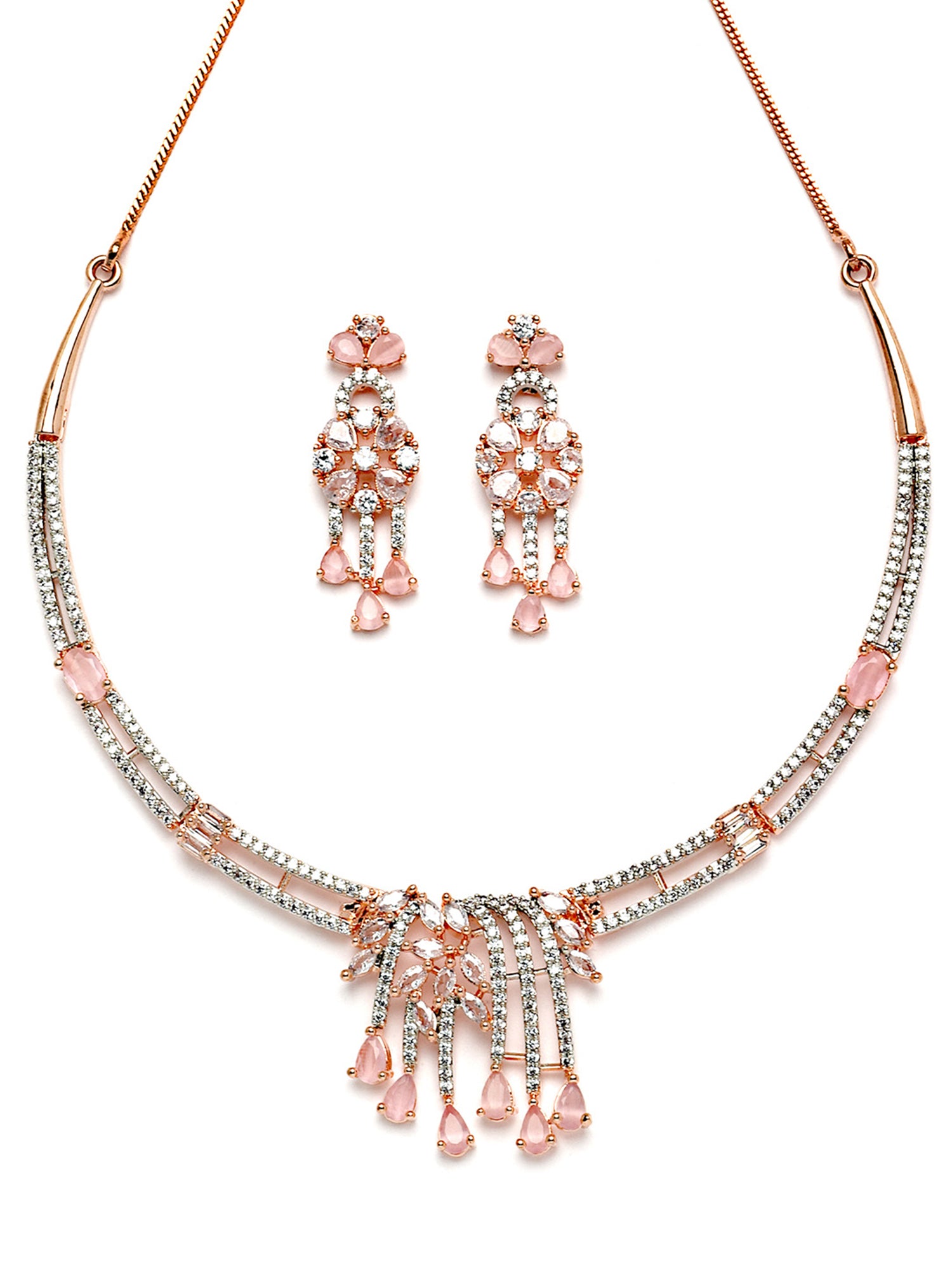 - This is a Rose Gold Jewellery Set by Brand Karatcart which has American Diamond stones.This is Rose Gold Plated. We at KARATCART understand your desire to look the best on any day & we thrive in making any day an occasion. Every individual at Karatcart carries a passion for jewellery and it reflects in our beautiful designs as well as in our breathtaking craftsmanship. We create unique jewellery so you can make heads turn..