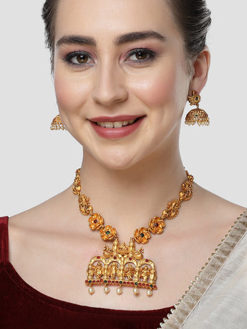 - This is a Gold Jewellery Set by Brand Karatcart which has Temple stones.This is Gold Plated. We at KARATCART understand your desire to look the best on any day & we thrive in making any day an occasion. Every individual at Karatcart carries a passion for jewellery and it reflects in our beautiful designs as well as in our breathtaking craftsmanship. We create unique jewellery so you can make heads turn..