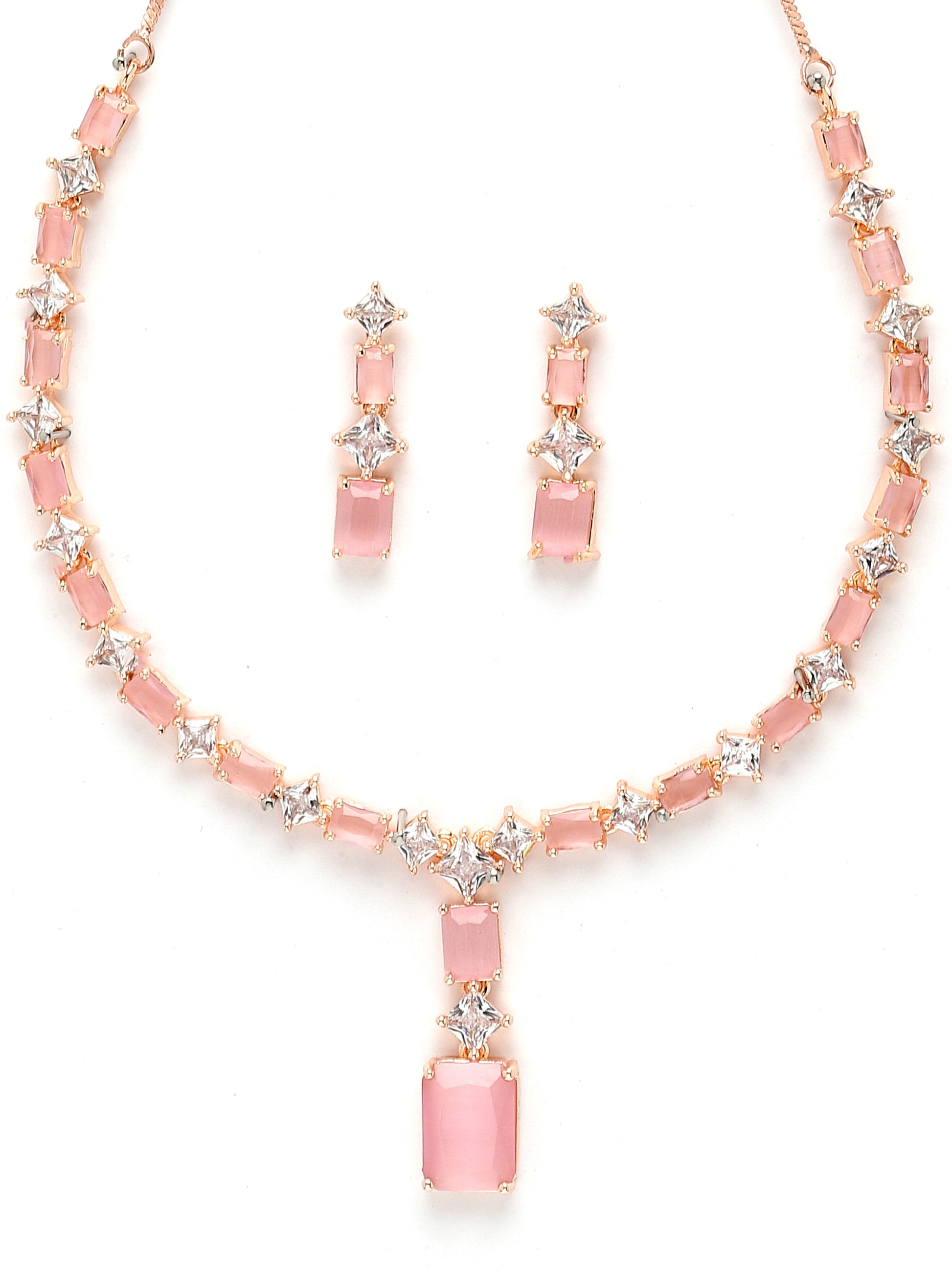 - This is a Pink Jewellery Set by Brand Karatcart which has American Diamond stones.This is Rose Gold Plated. We at KARATCART understand your desire to look the best on any day & we thrive in making any day an occasion. Every individual at Karatcart carries a passion for jewellery and it reflects in our beautiful designs as well as in our breathtaking craftsmanship. We create unique jewellery so you can make heads turn..
