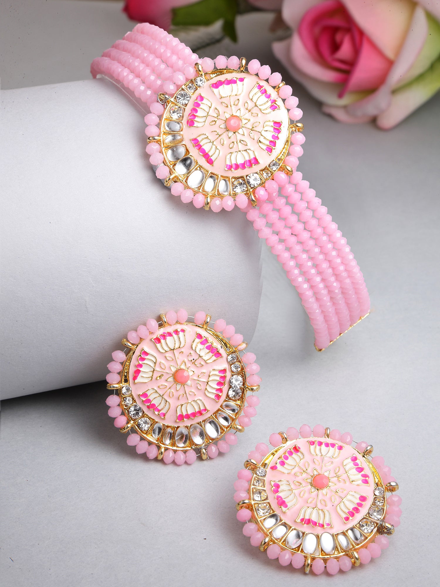 - This is a Pink Jewellery Set by Brand Karatcart which has Enamel stones.This is Gold Plated. We at KARATCART understand your desire to look the best on any day & we thrive in making any day an occasion. Every individual at Karatcart carries a passion for jewellery and it reflects in our beautiful designs as well as in our breathtaking craftsmanship. We create unique jewellery so you can make heads turn..