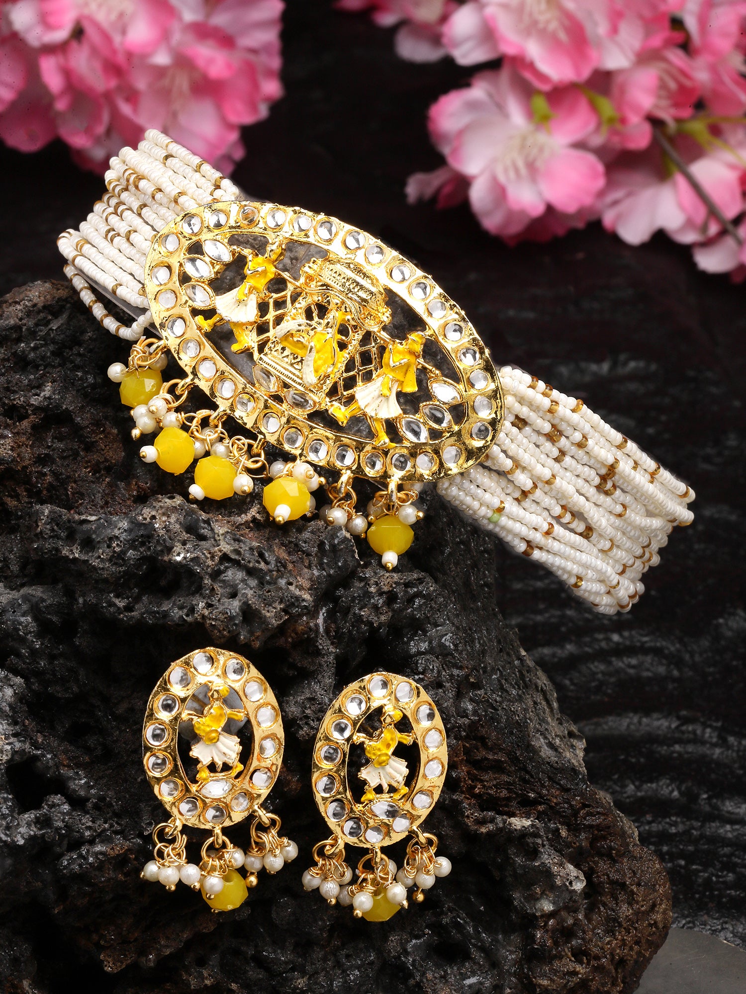 - This is a Yellow Jewellery Set by Brand Karatcart which has Kundan stones.This is Gold Plated. We at KARATCART understand your desire to look the best on any day & we thrive in making any day an occasion. Every individual at Karatcart carries a passion for jewellery and it reflects in our beautiful designs as well as in our breathtaking craftsmanship. We create unique jewellery so you can make heads turn..