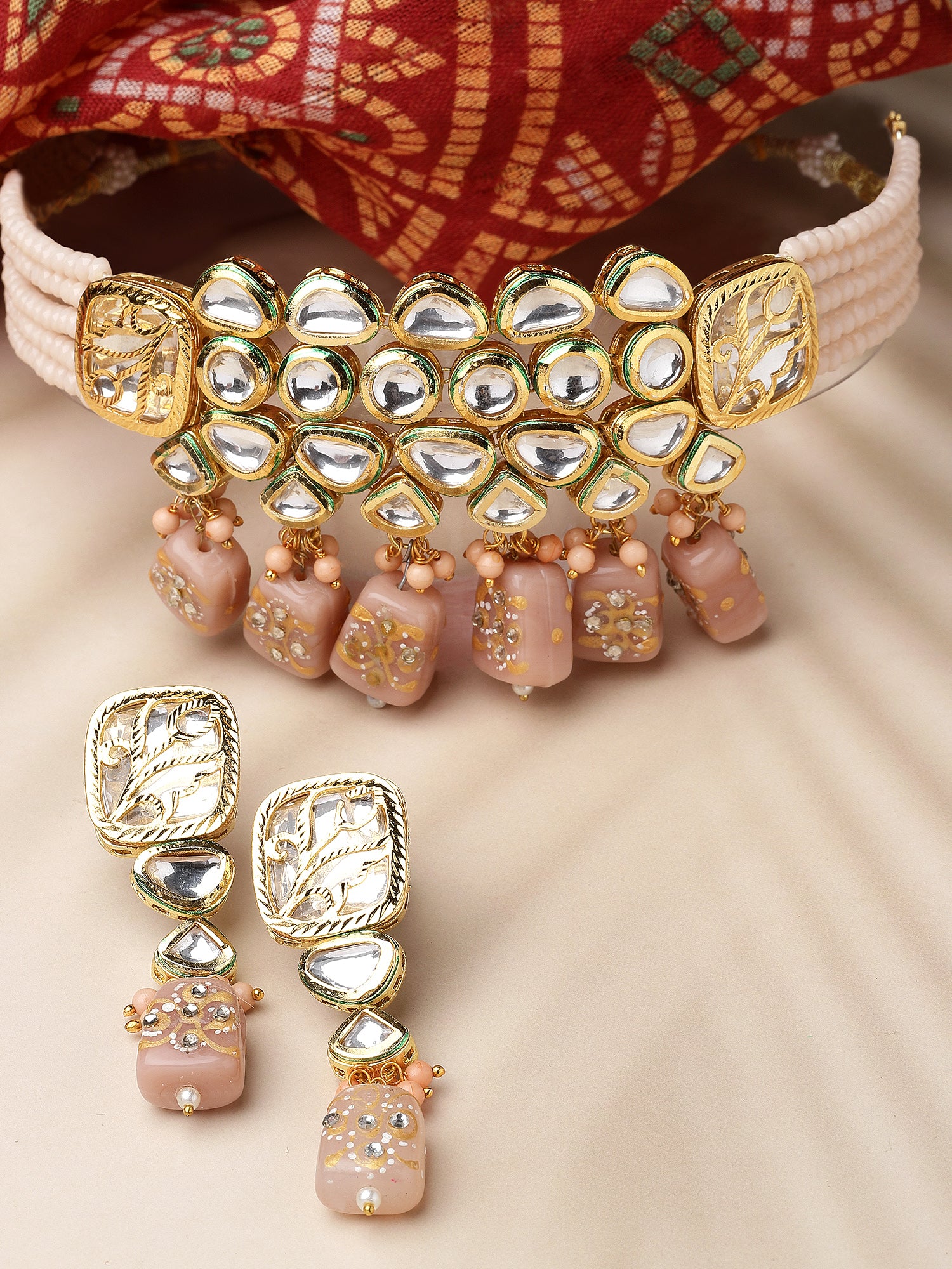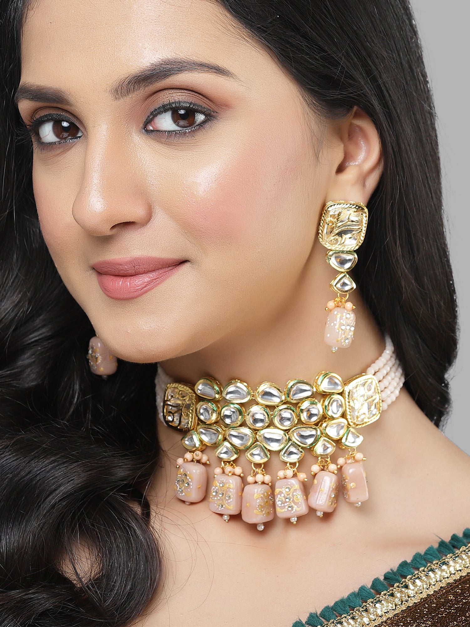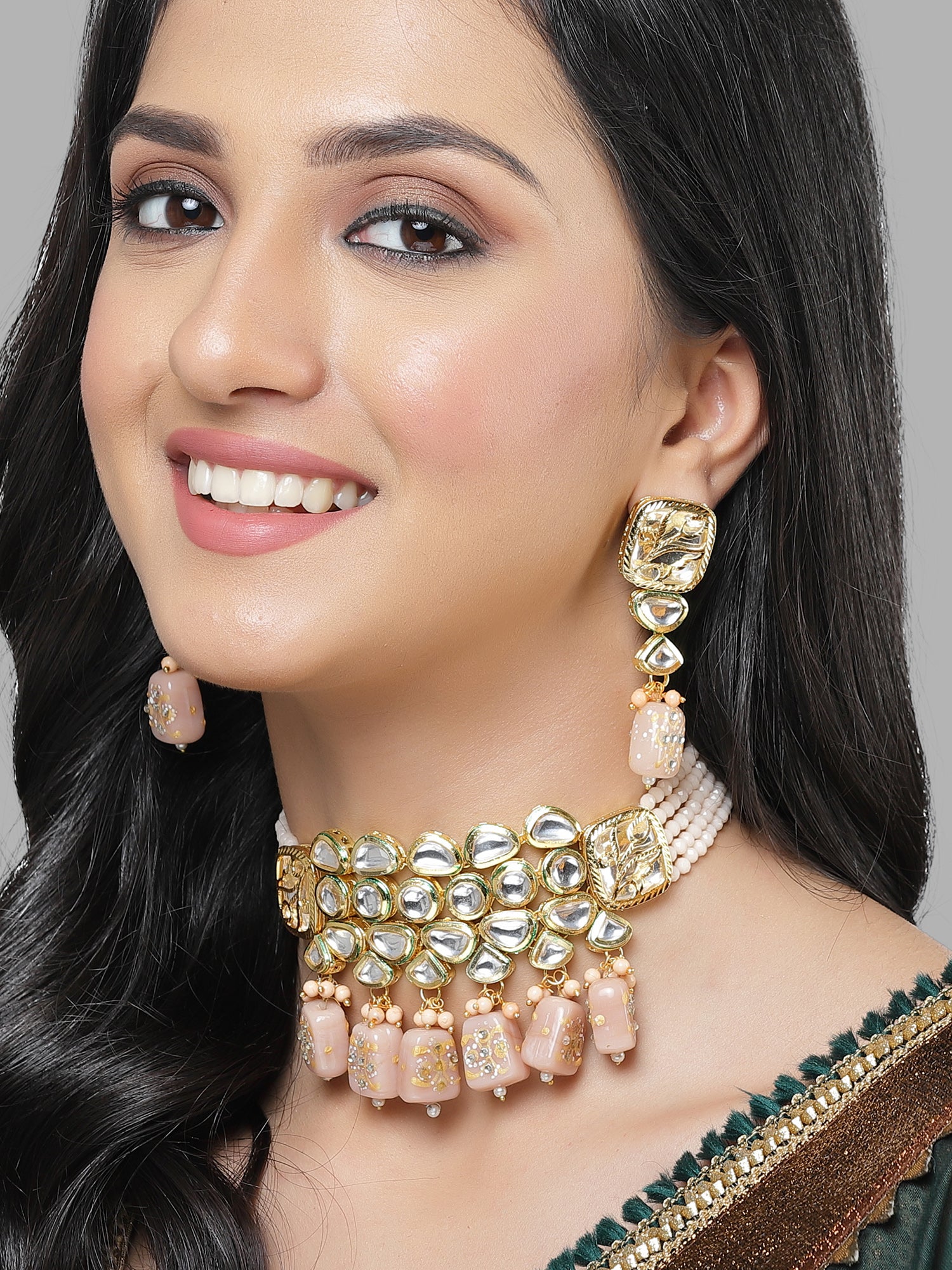 Karatcart Gold Plated Peach Tumble and Polki Kundan Choker Necklace Set for Women. Our products are designed with high-quality material and these products are enhanced with plating that are skin-friendly & with love to reach your heart.