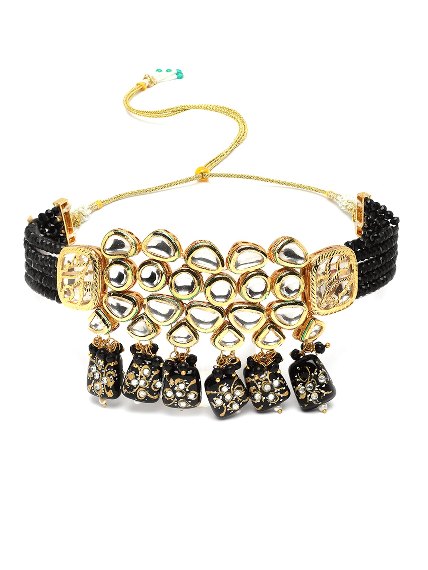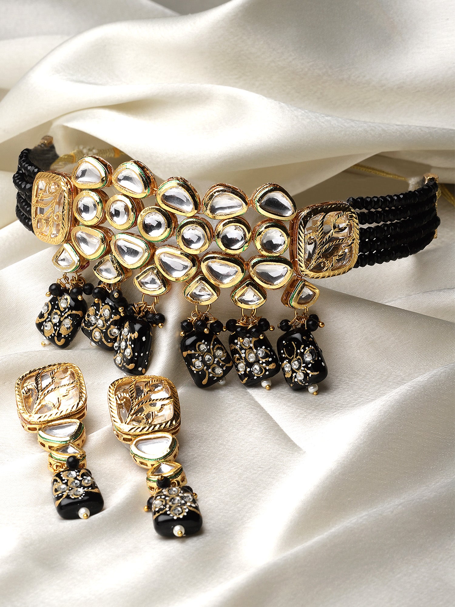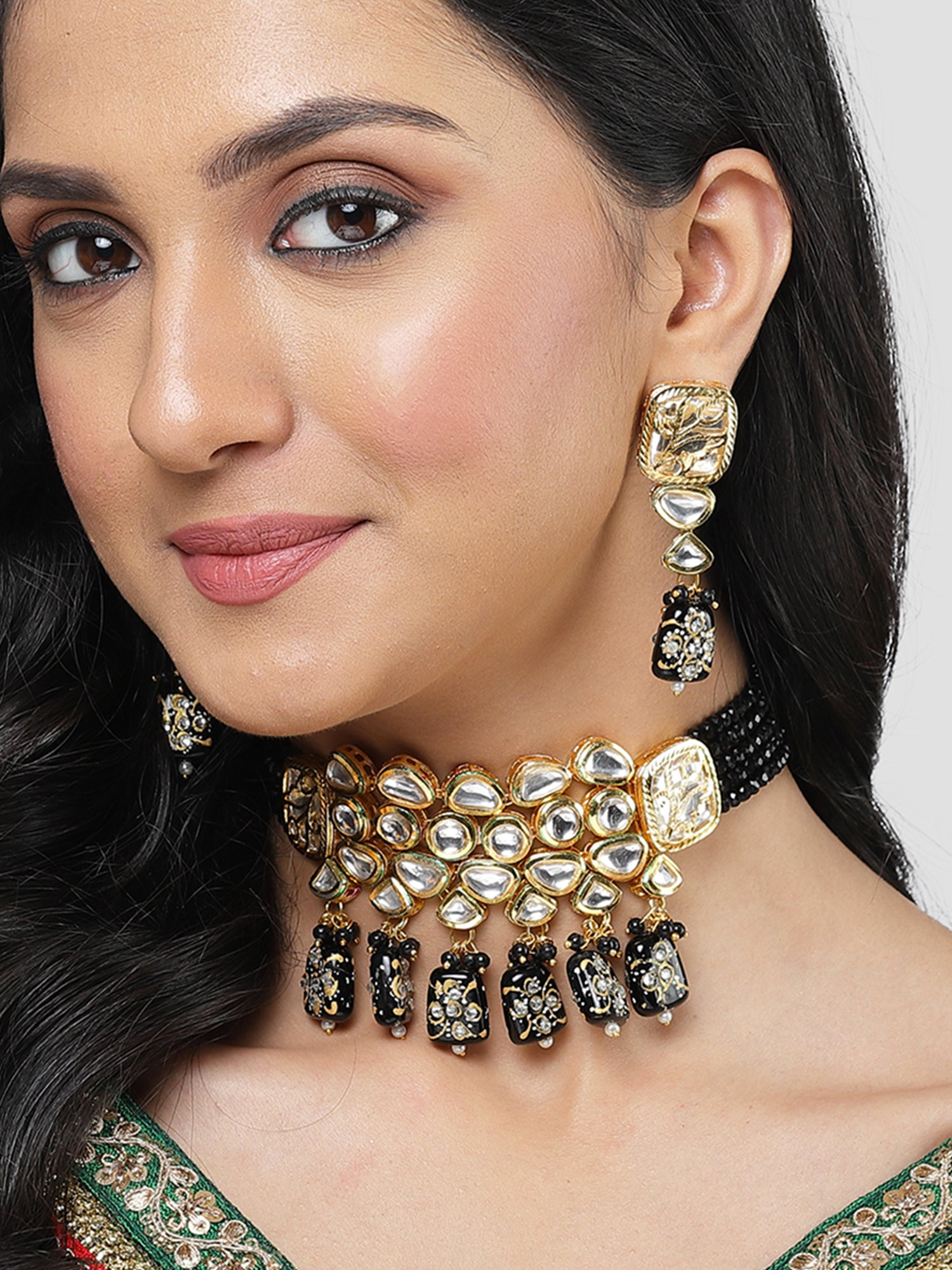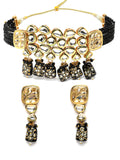 Karatcart Gold Plated Black Tumble and Polki Kundan Choker Necklace Set for Women