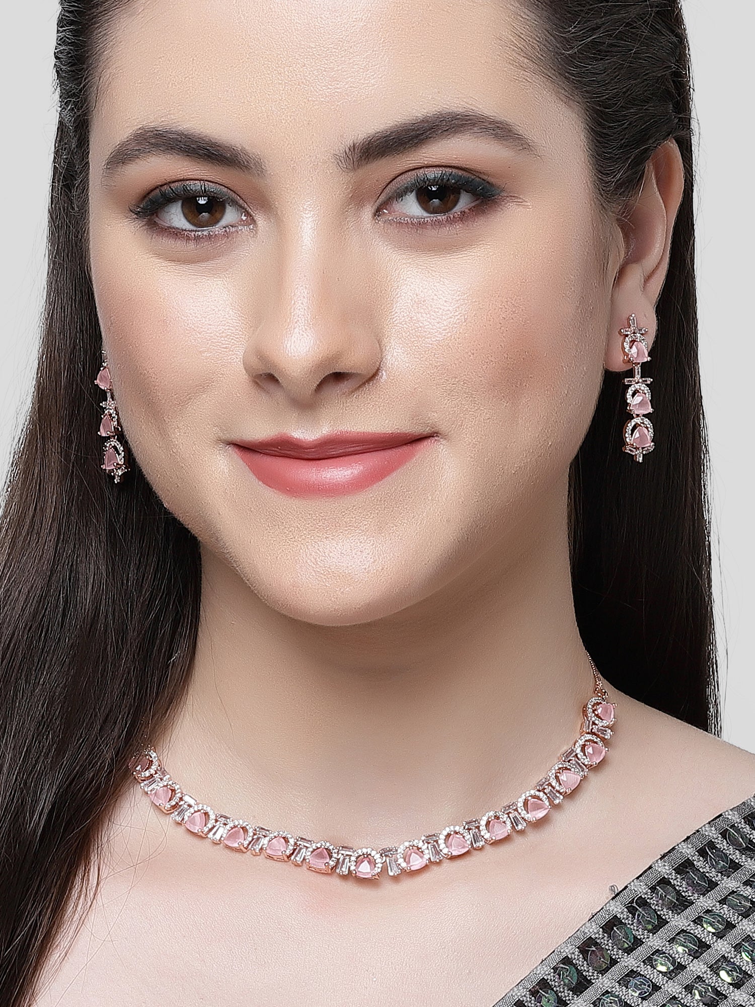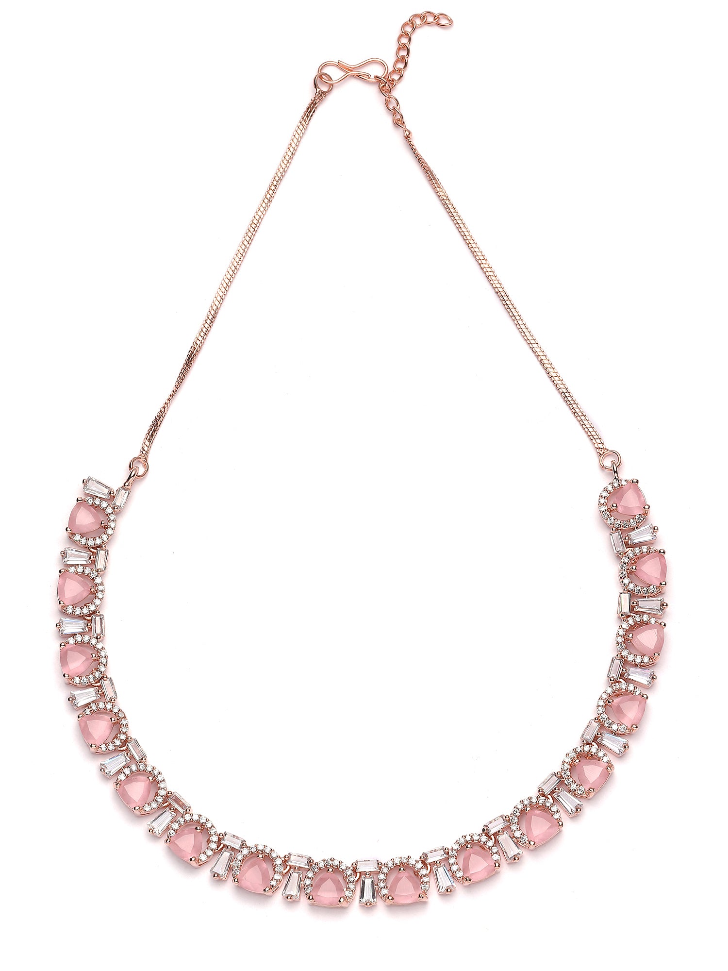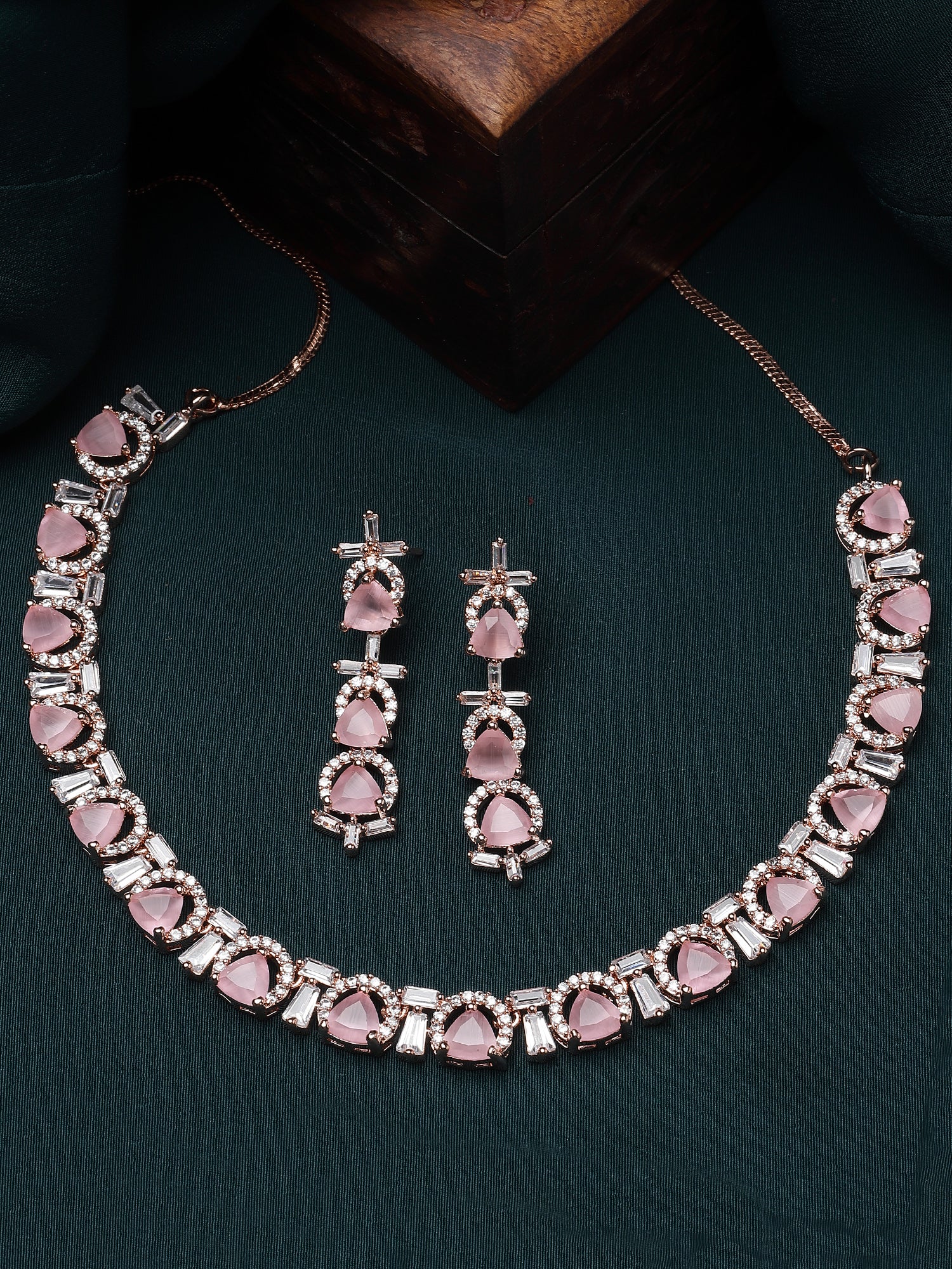 Karatcart Rose Gold Plated Pink Triangular Cubic Zirconia Studded Necklace Set for Women