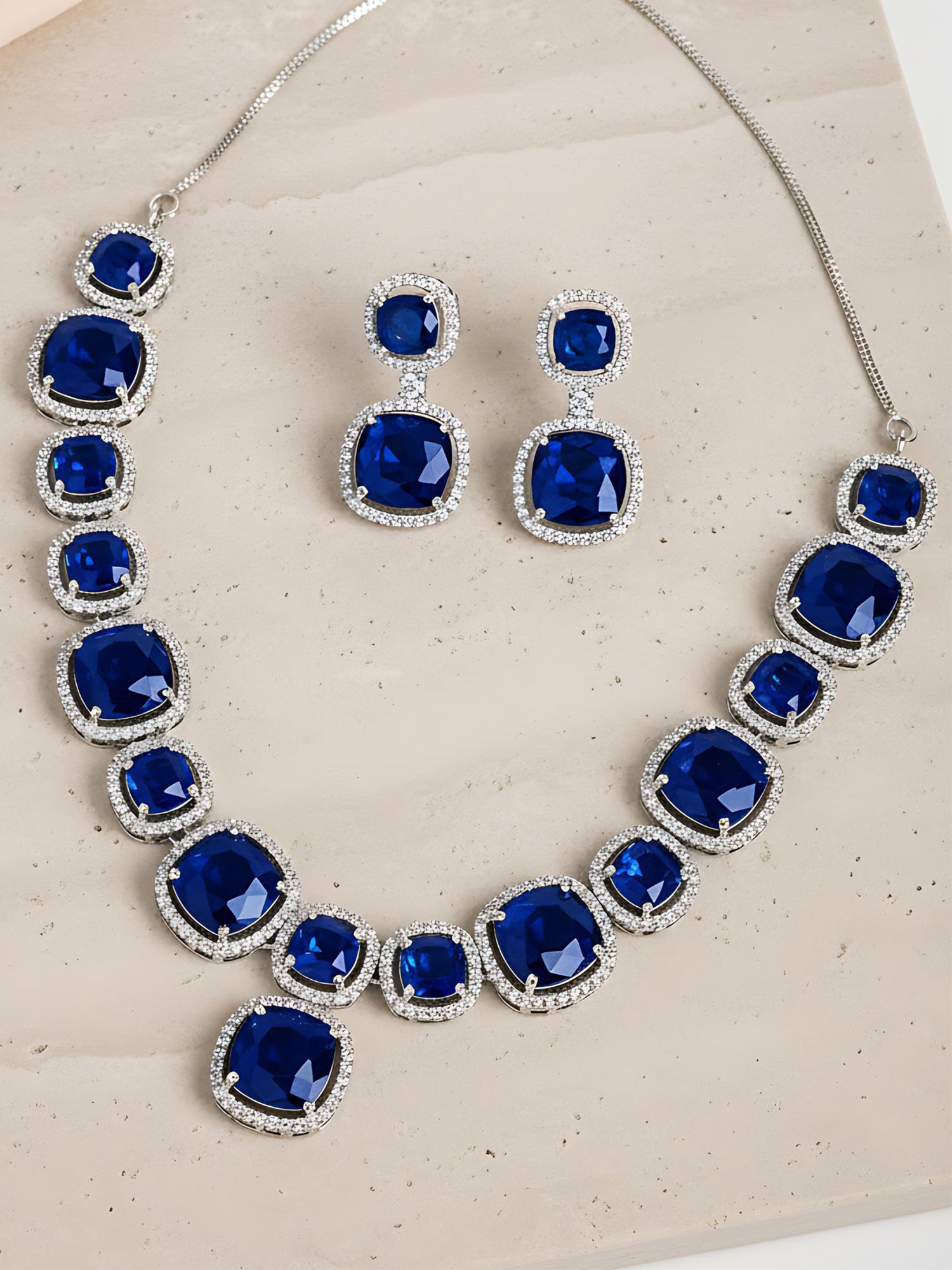 - This is a Blue Jewellery Set by Brand Karatcart which has American Diamond stones.This is Silver Plated. We at KARATCART understand your desire to look the best on any day & we thrive in making any day an occasion. Every individual at Karatcart carries a passion for jewellery and it reflects in our beautiful designs as well as in our breathtaking craftsmanship. We create unique jewellery so you can make heads turn..