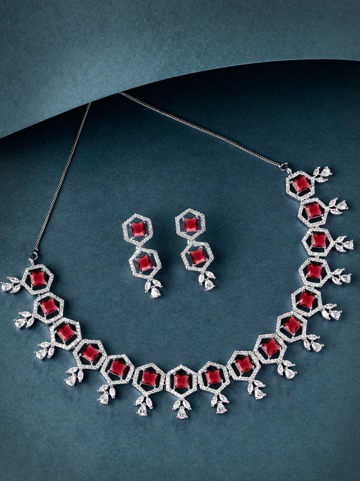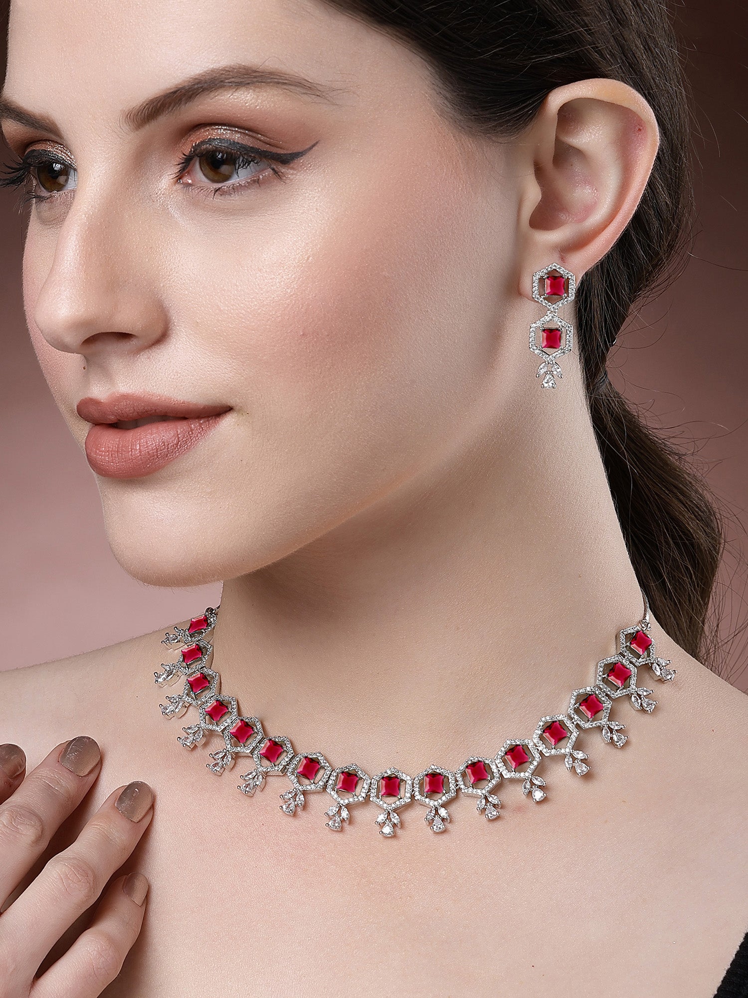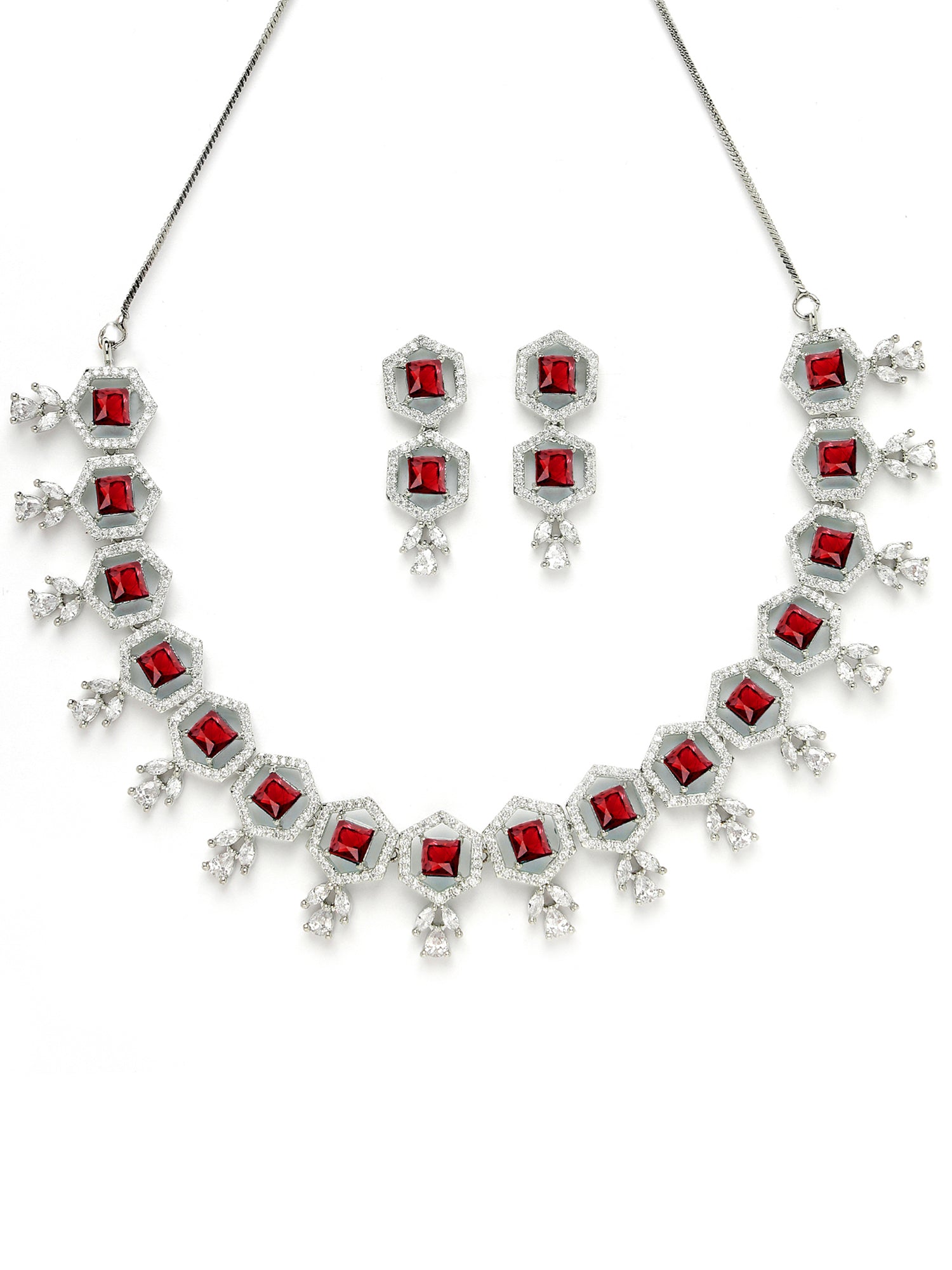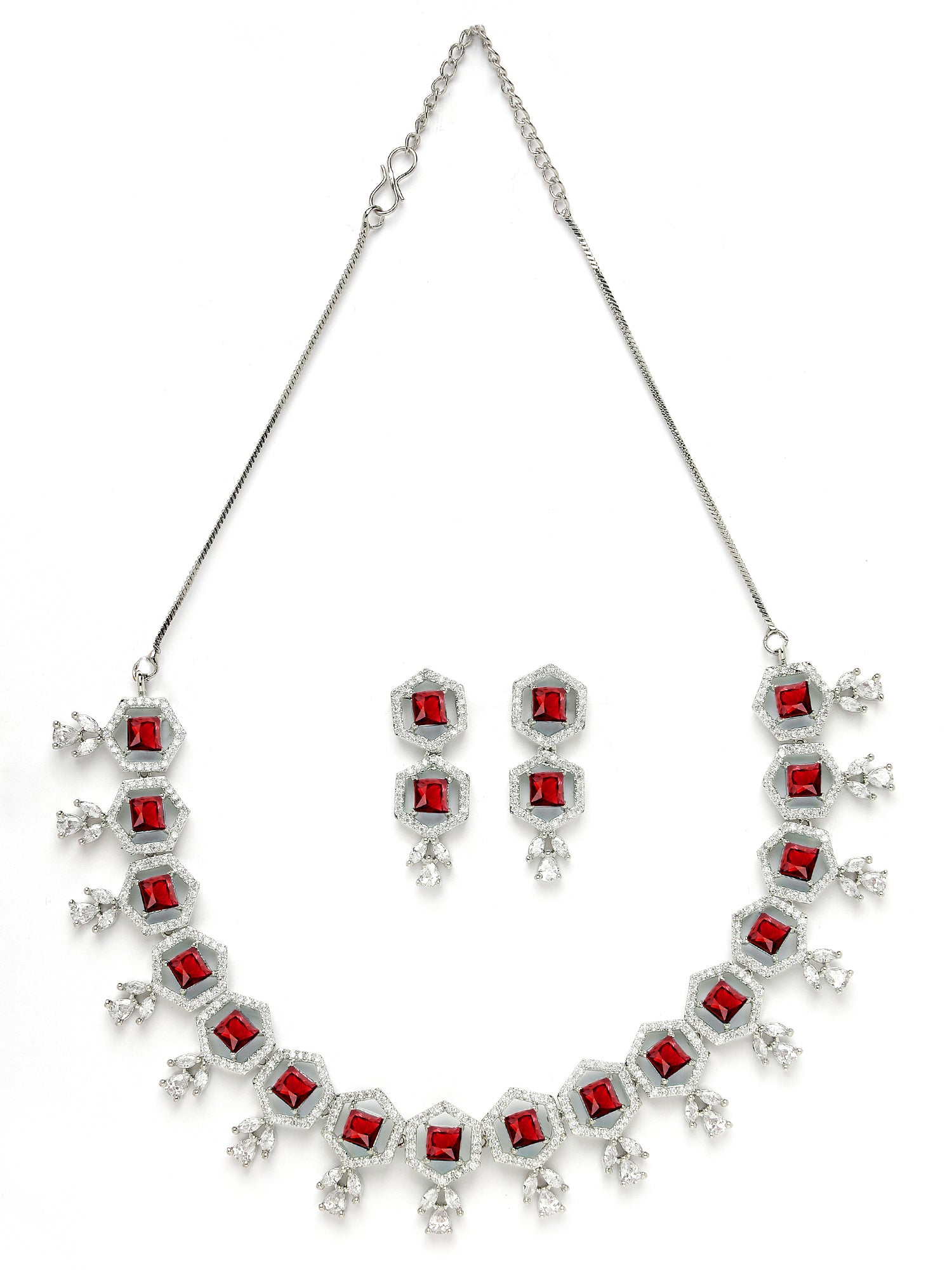 - This is a Red Jewellery Set by Brand Karatcart which has American Diamond stones.This is Silver Plated. We at KARATCART understand your desire to look the best on any day & we thrive in making any day an occasion. Every individual at Karatcart carries a passion for jewellery and it reflects in our beautiful designs as well as in our breathtaking craftsmanship. We create unique jewellery so you can make heads turn..