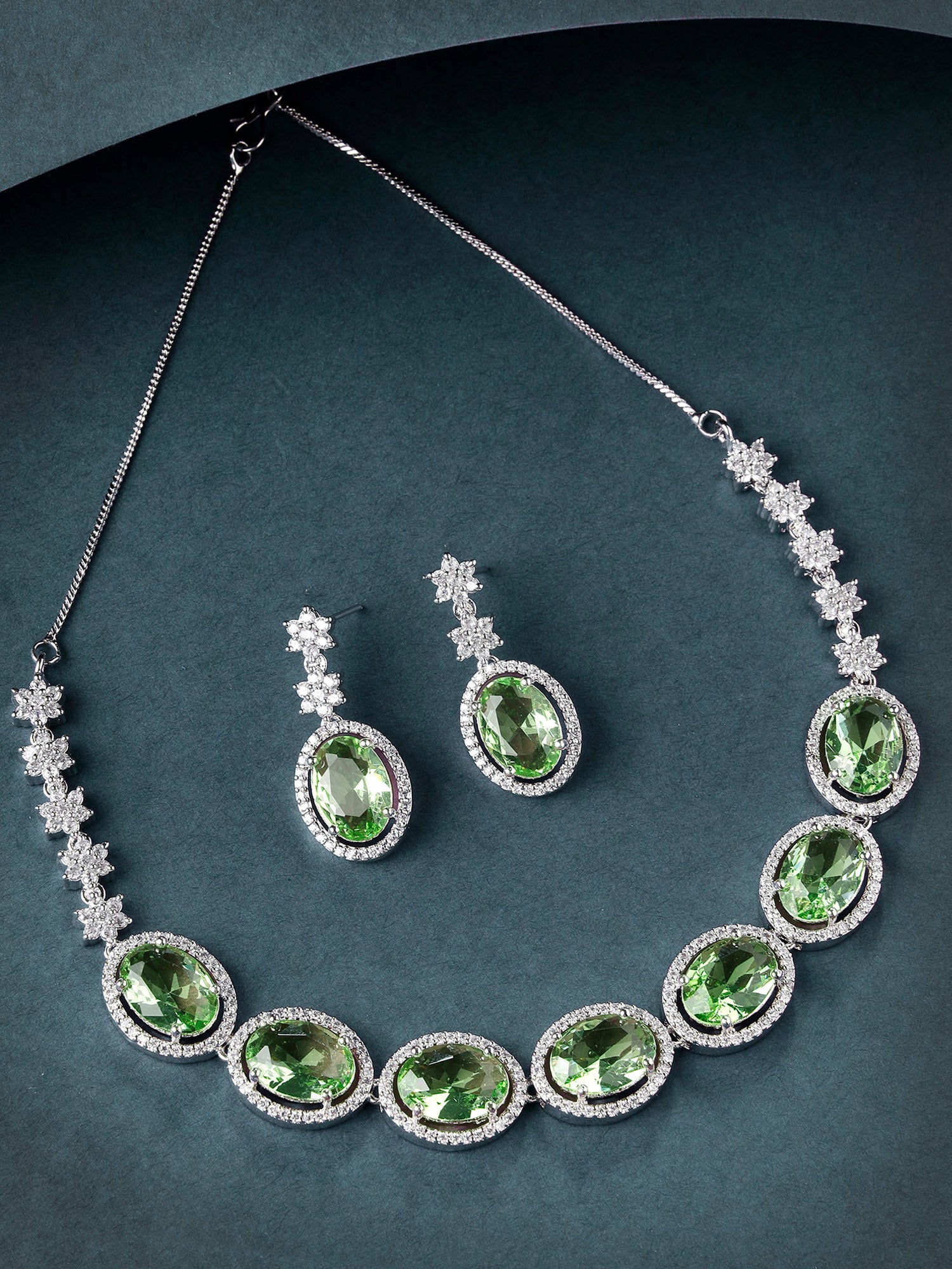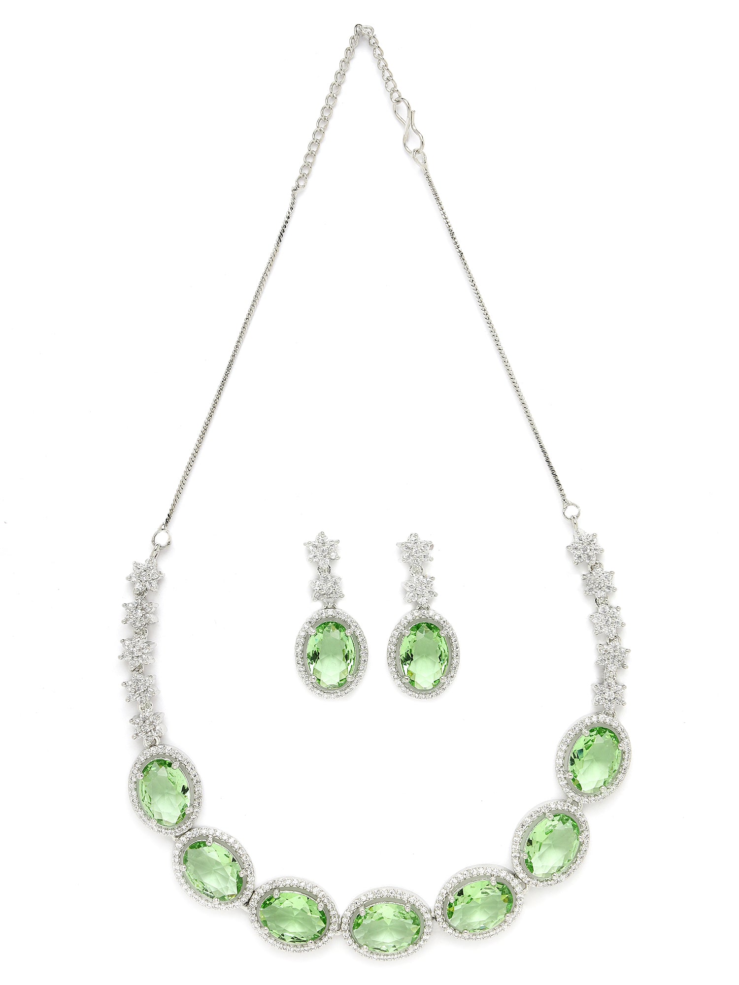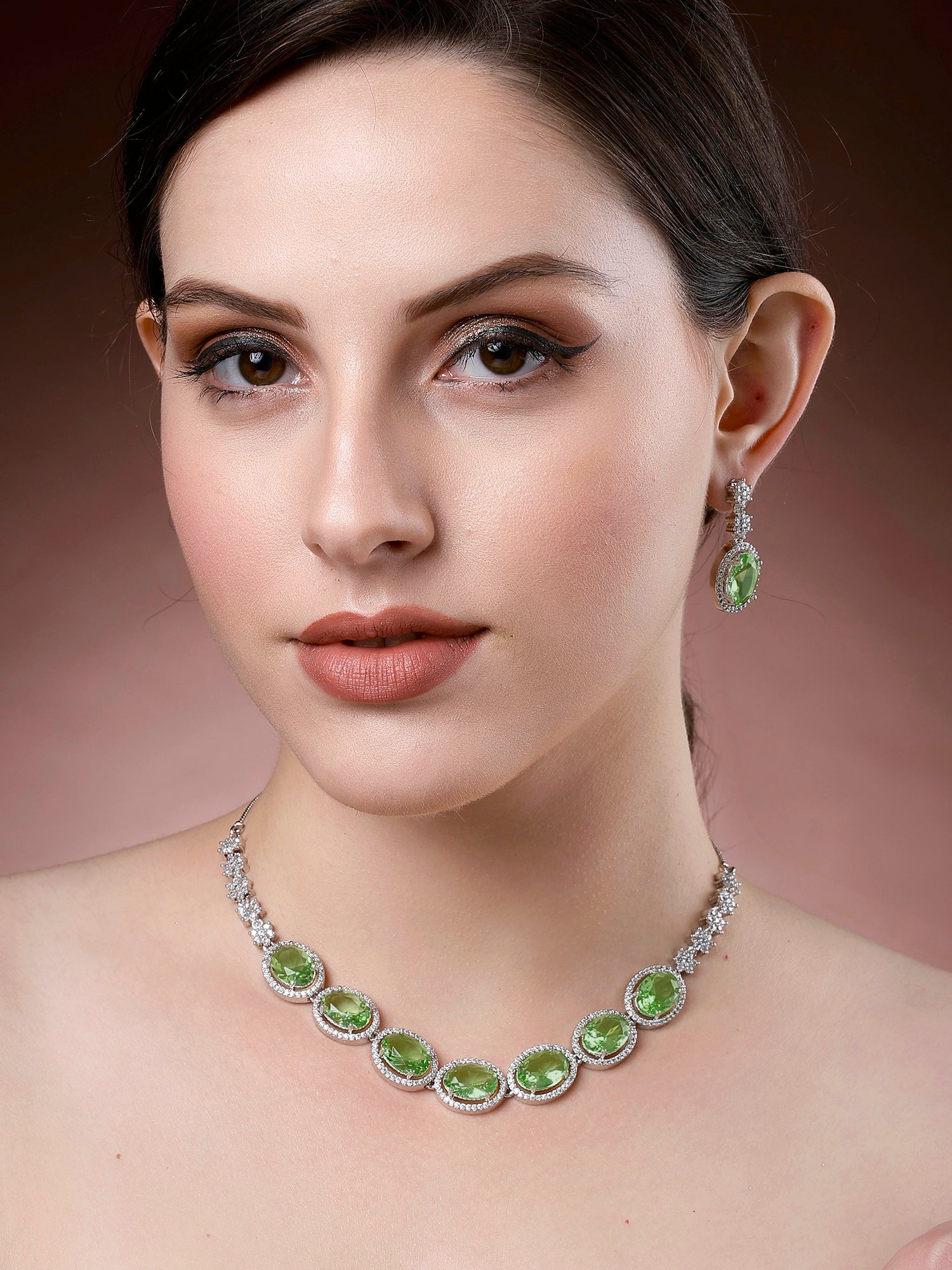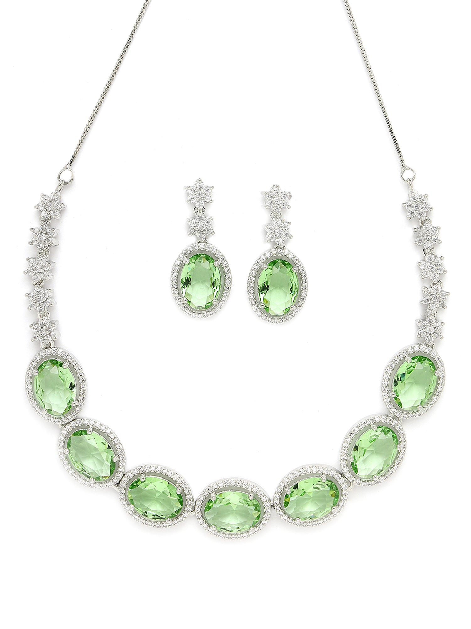 - This is a Lime Green Jewellery Set by Brand Karatcart which has American Diamond stones.This is Silver Plated. We at KARATCART understand your desire to look the best on any day & we thrive in making any day an occasion. Every individual at Karatcart carries a passion for jewellery and it reflects in our beautiful designs as well as in our breathtaking craftsmanship. We create unique jewellery so you can make heads turn..