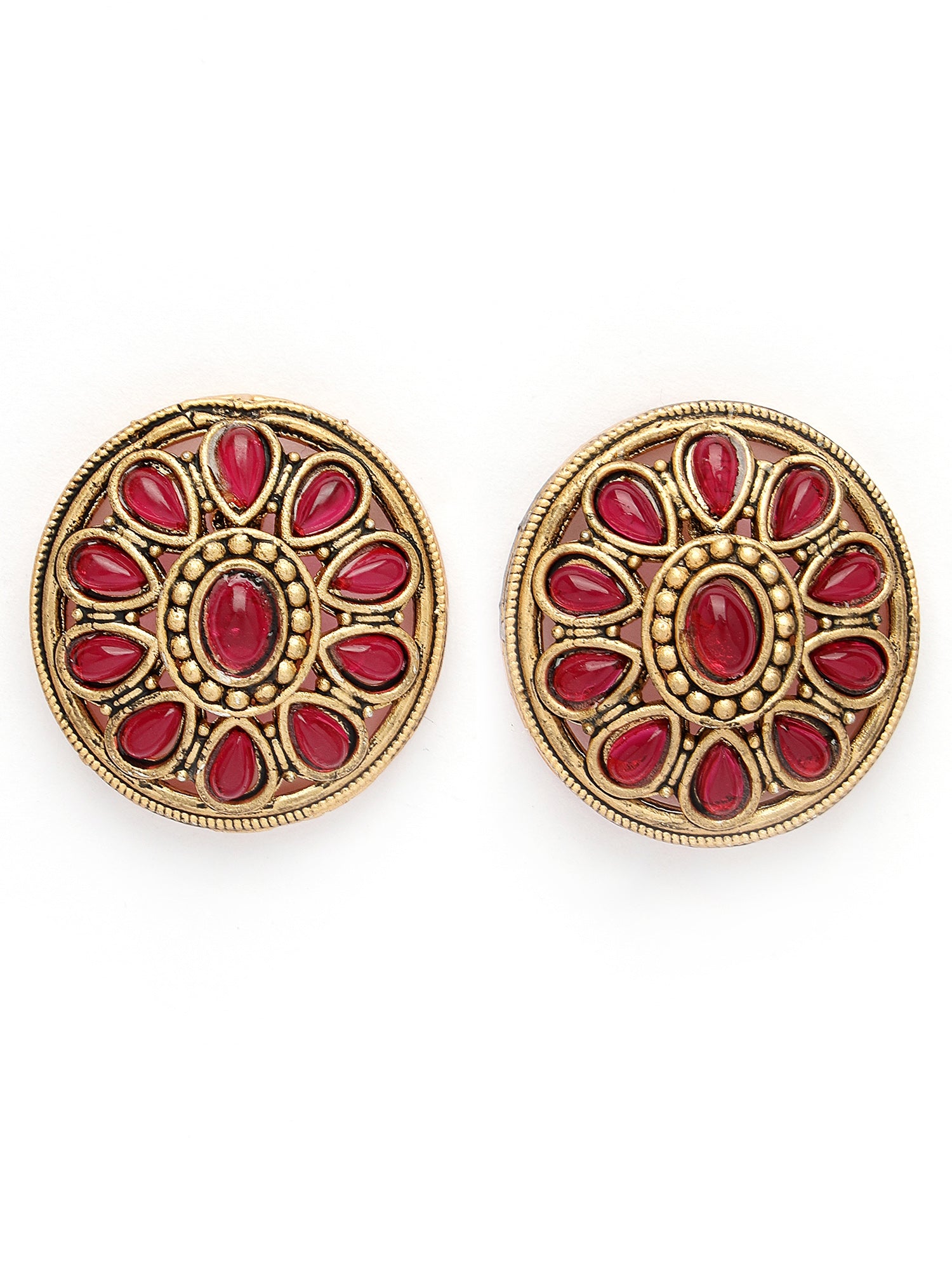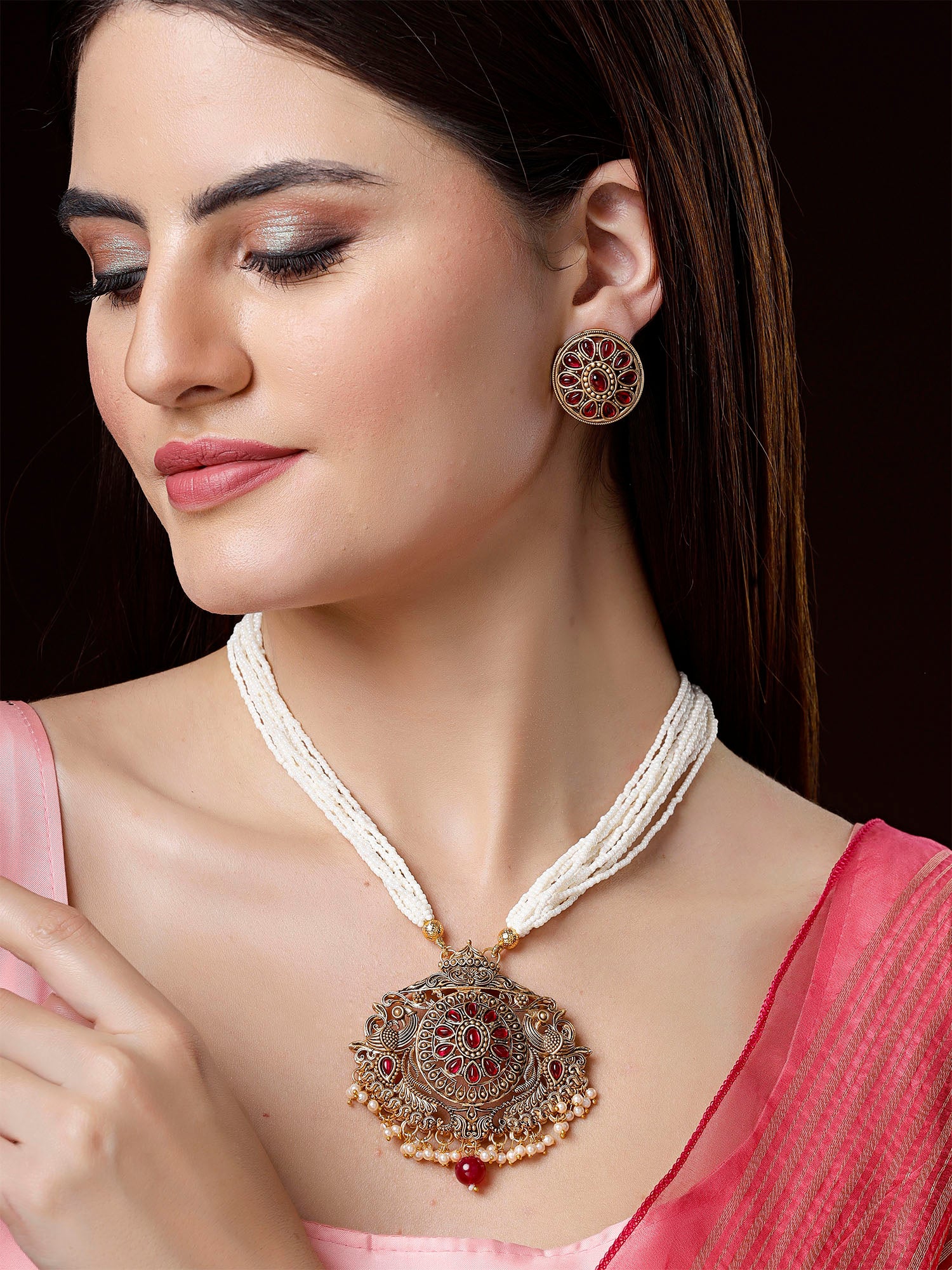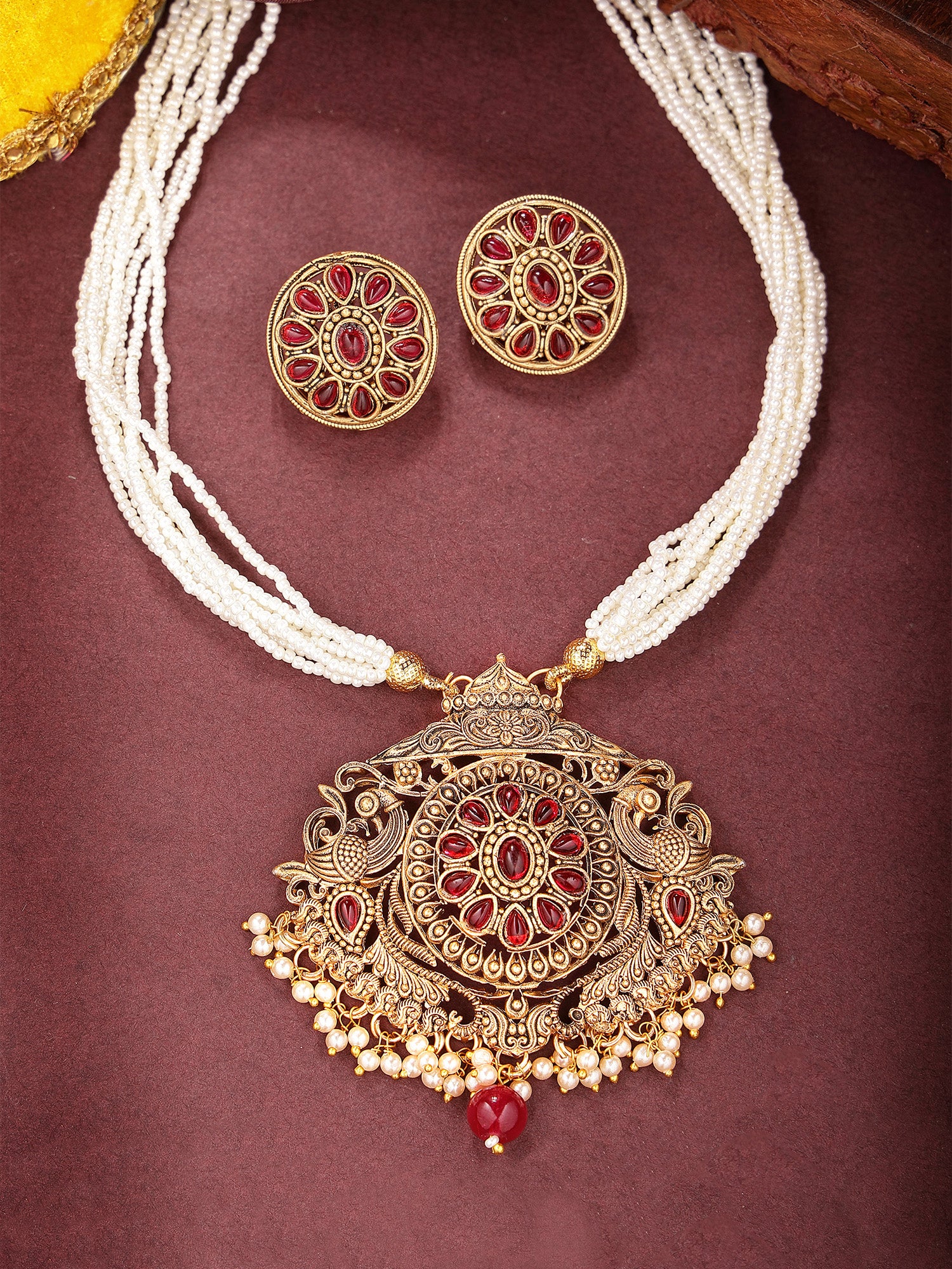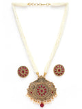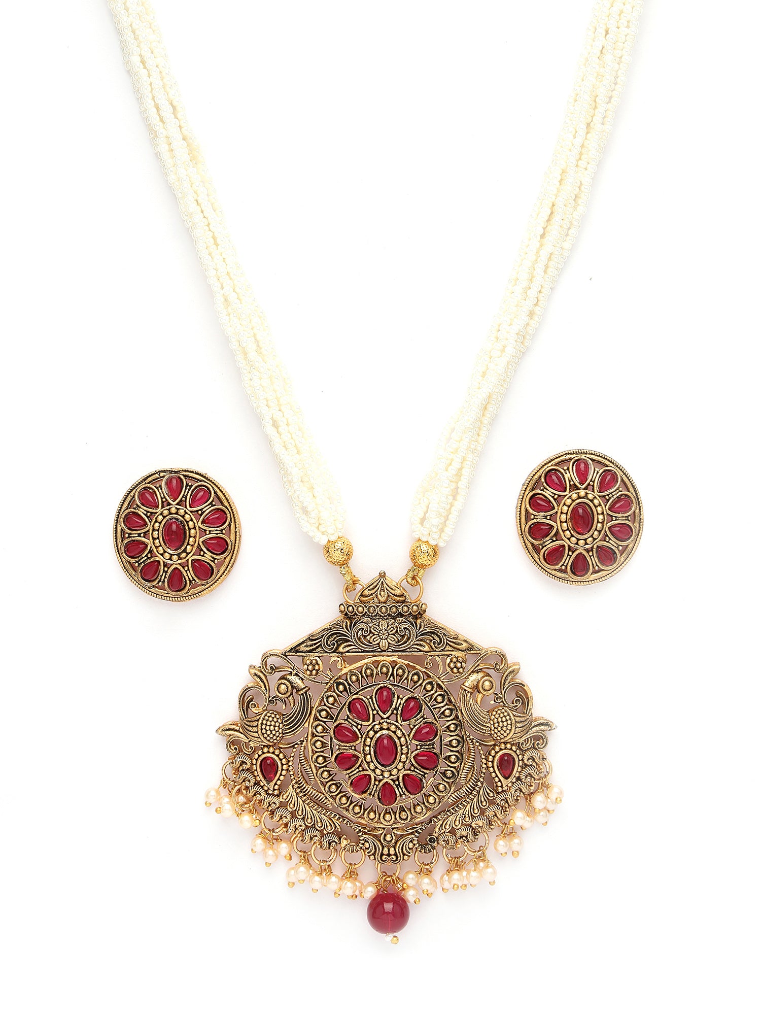 Karatcart Gold Plated Traditional Red Stone Chakra Long Temple Jewellery Set for Women. Our products are designed with high-quality material and these products are enhanced with plating that are skin-friendly & with love to reach your heart.