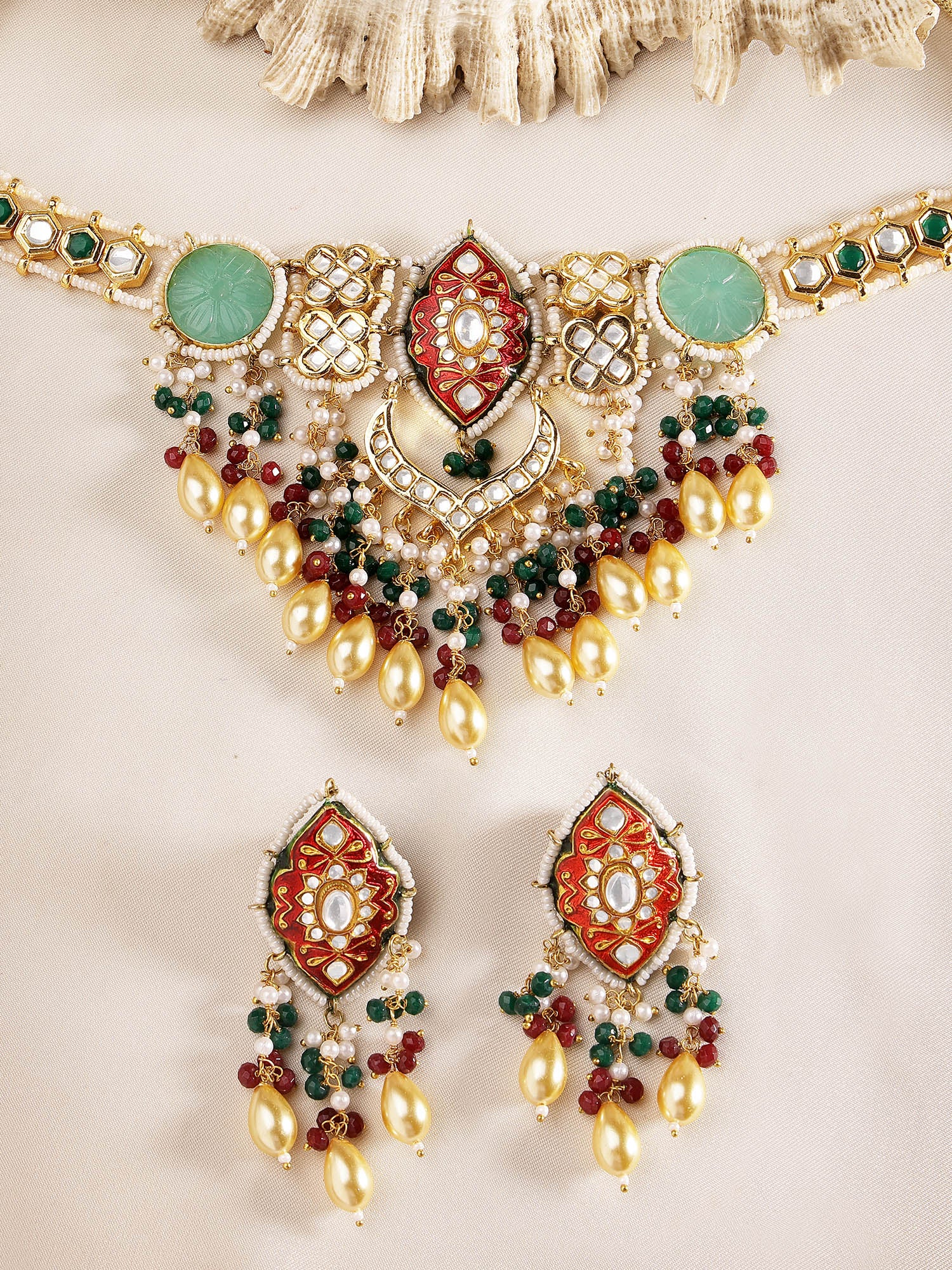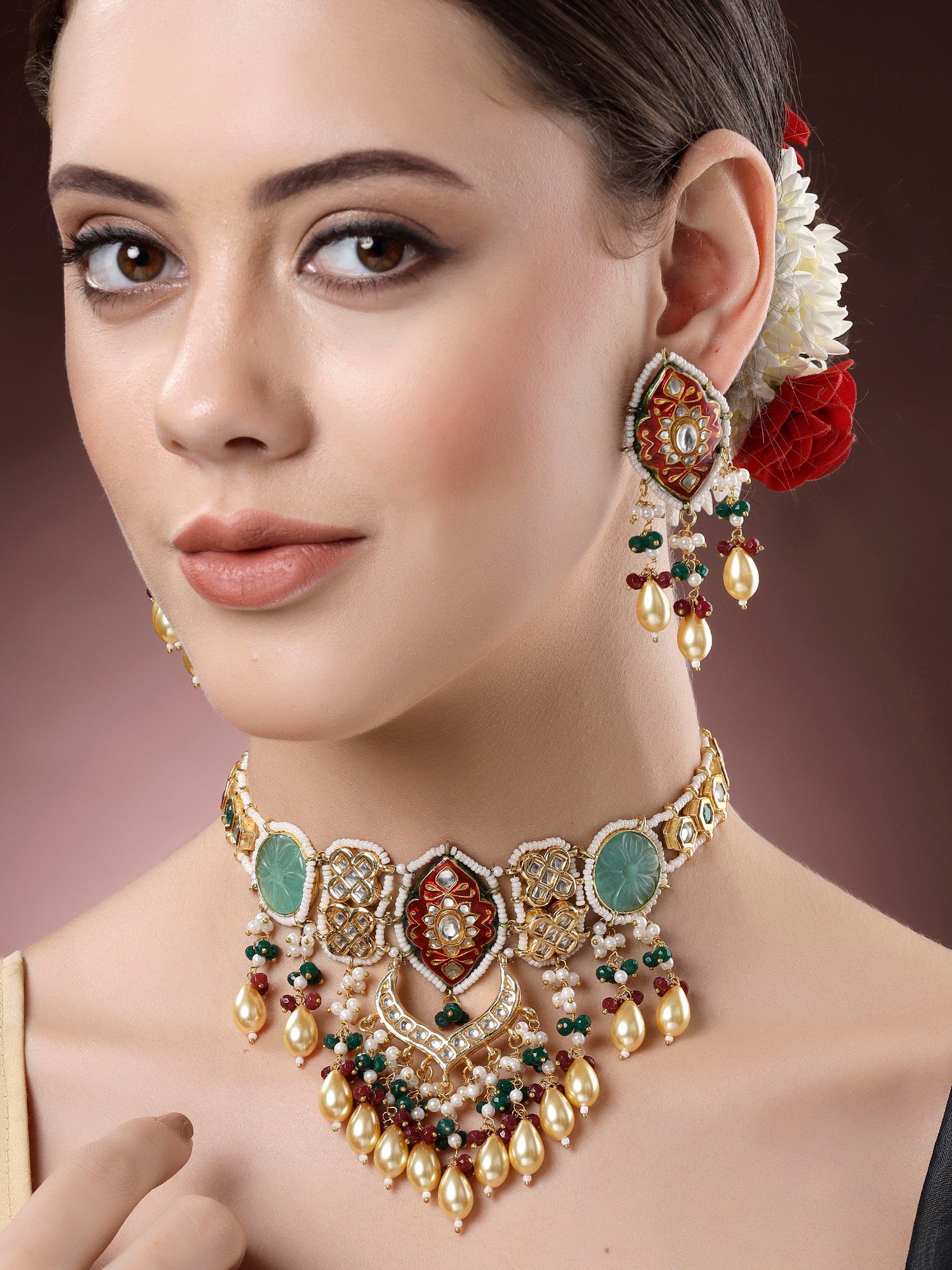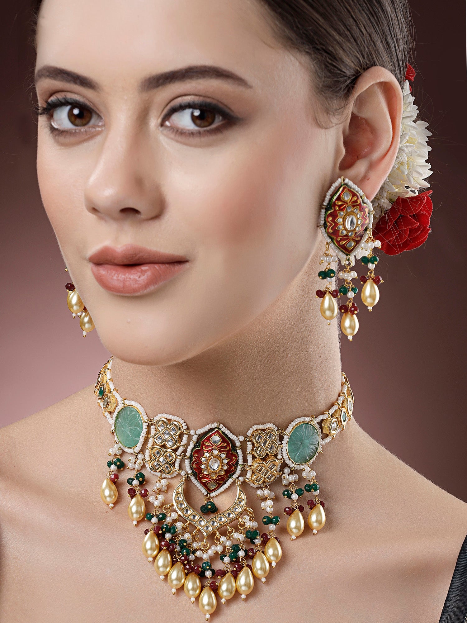 Karatcart Gold Plated Red Meena Green Carved Stone Polki Kundan Choker Necklace for Women