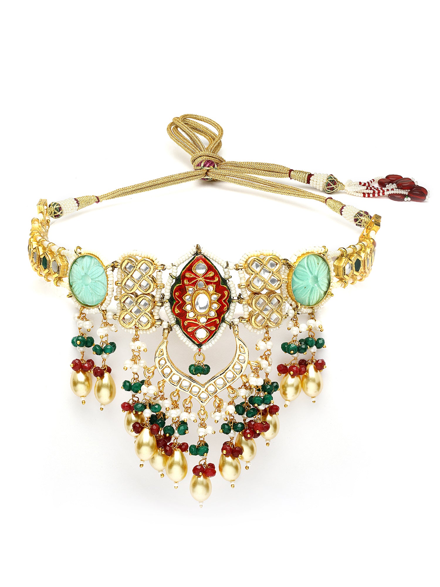 Karatcart Gold Plated Red Meena Green Carved Stone Polki Kundan Choker Necklace for Women. Our products are designed with high-quality material and these products are enhanced with plating that are skin-friendly & with love to reach your heart.