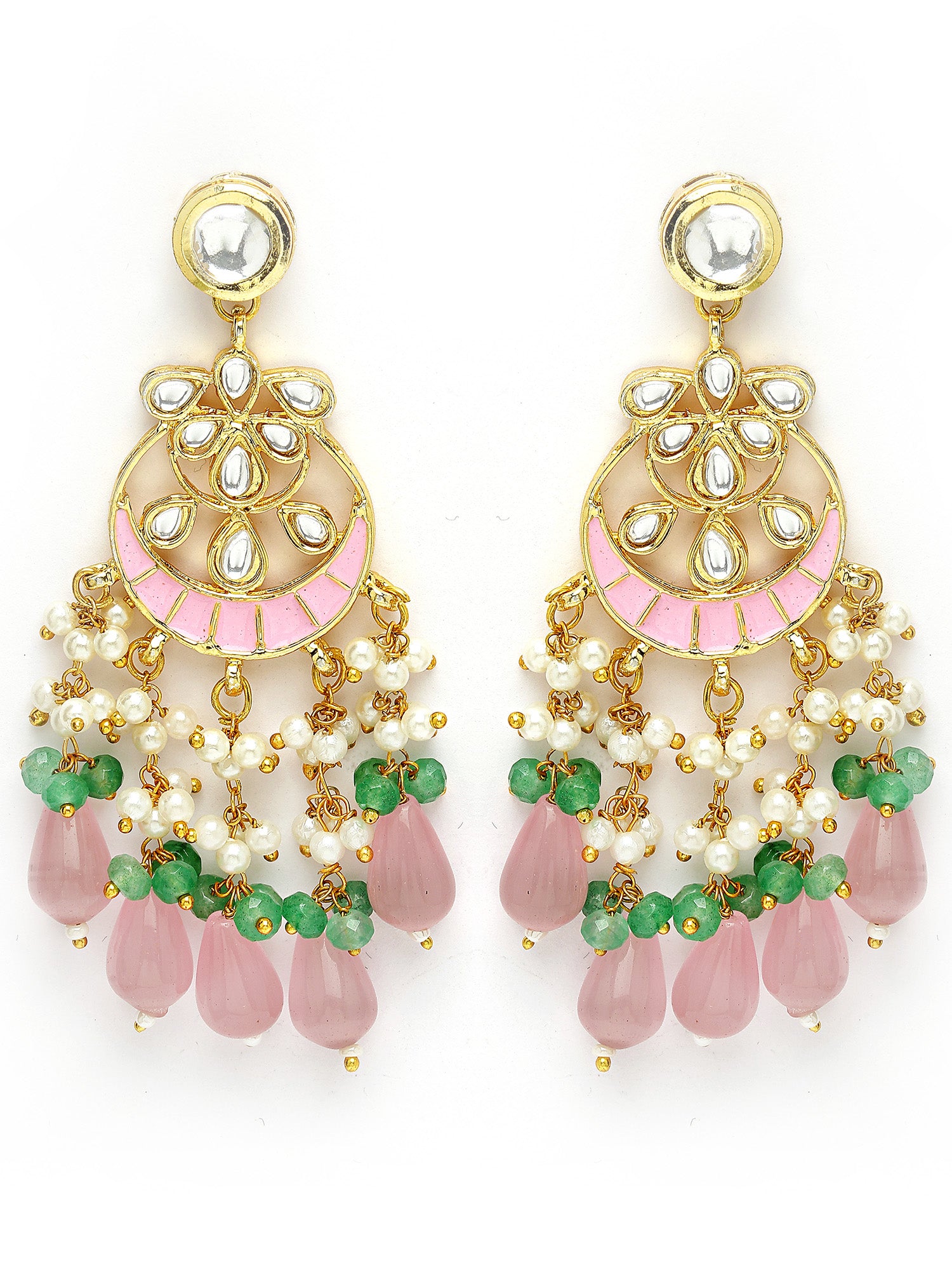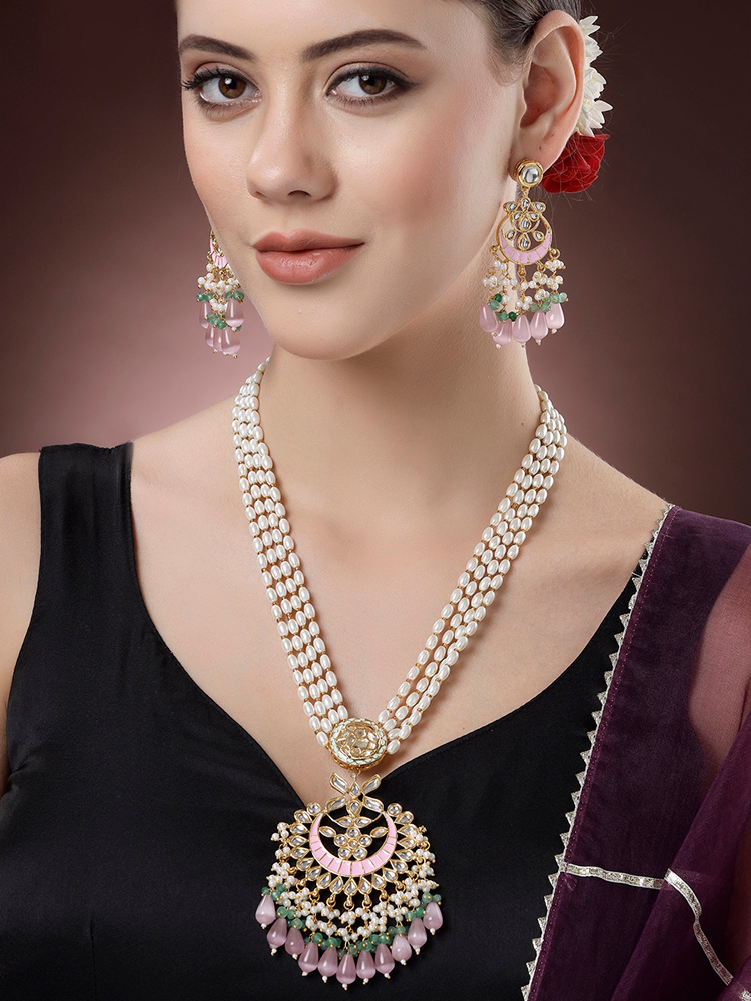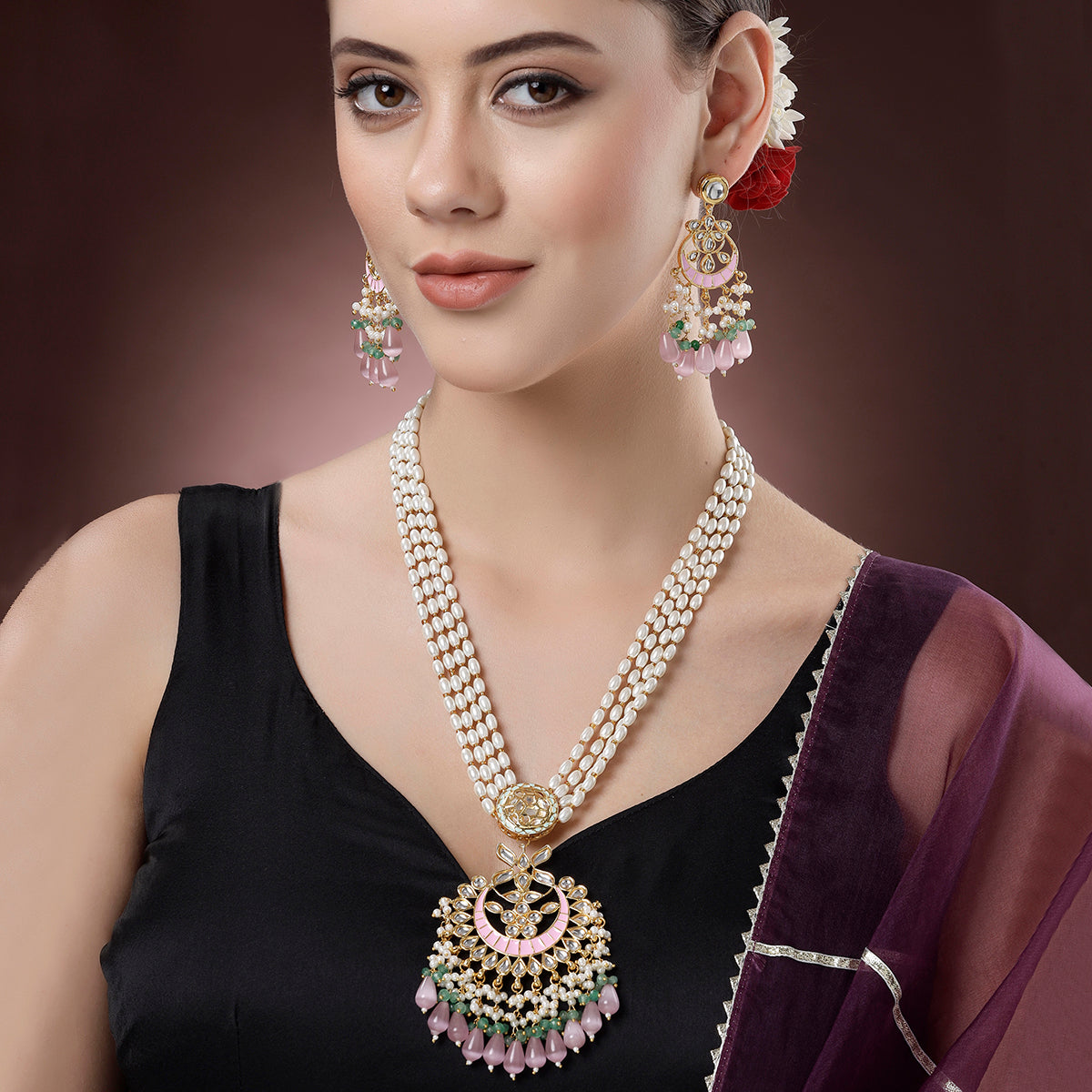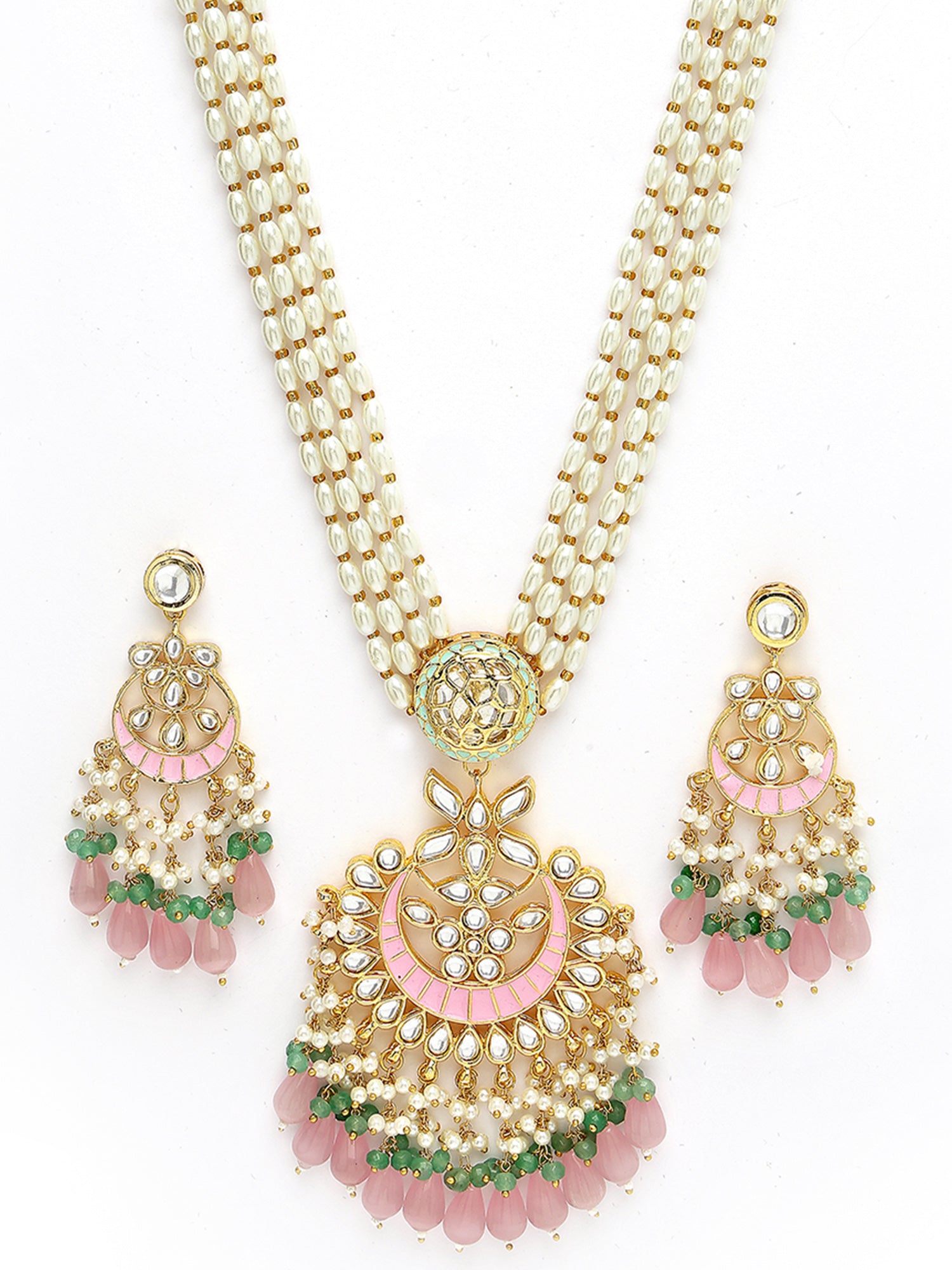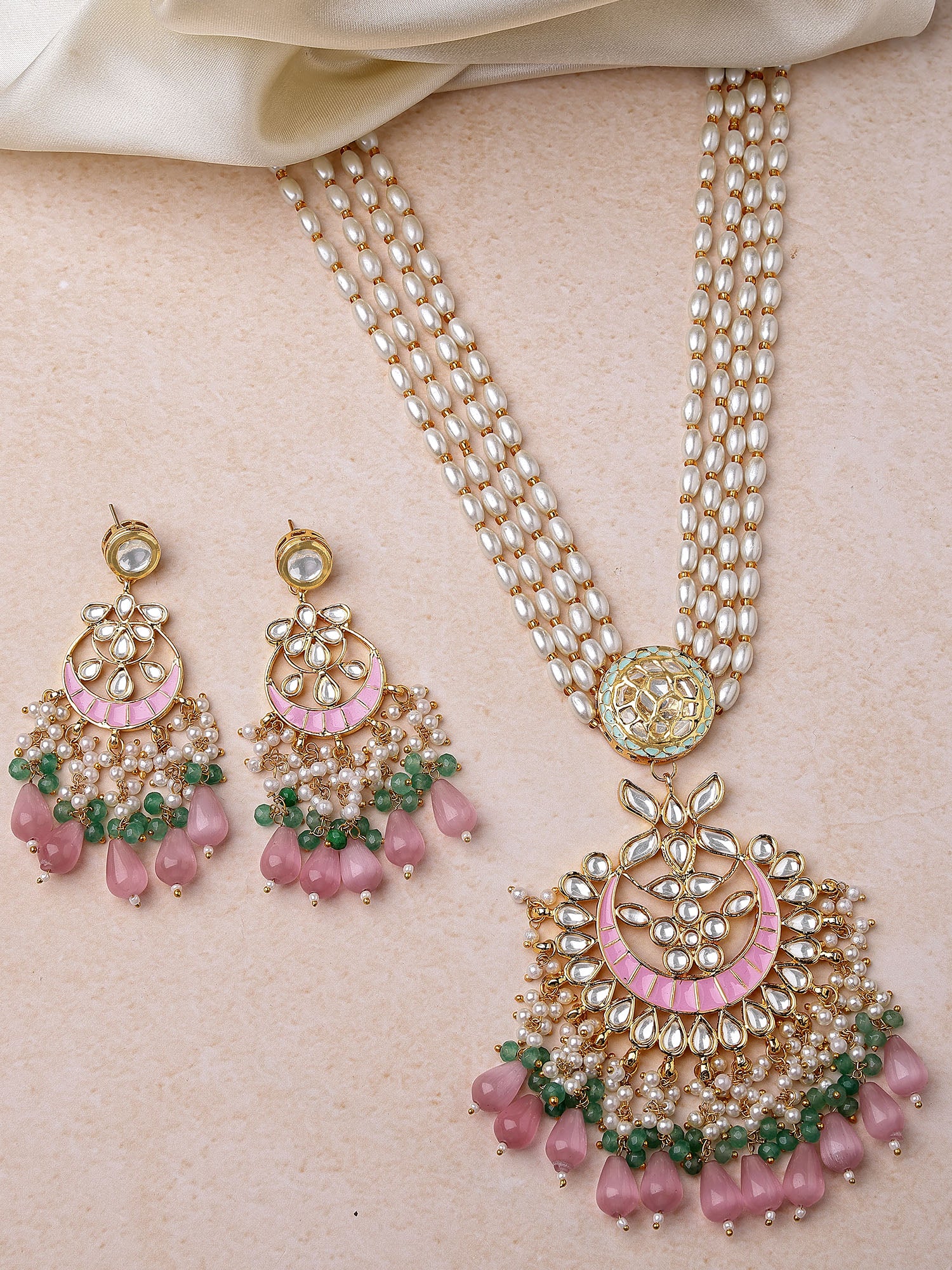 Karatcart Gold Plated Pink Meena Green Crystal Pearl Rani Haar Necklace for Women. Our products are designed with high-quality material and these products are enhanced with plating that are skin-friendly & with love to reach your heart.
