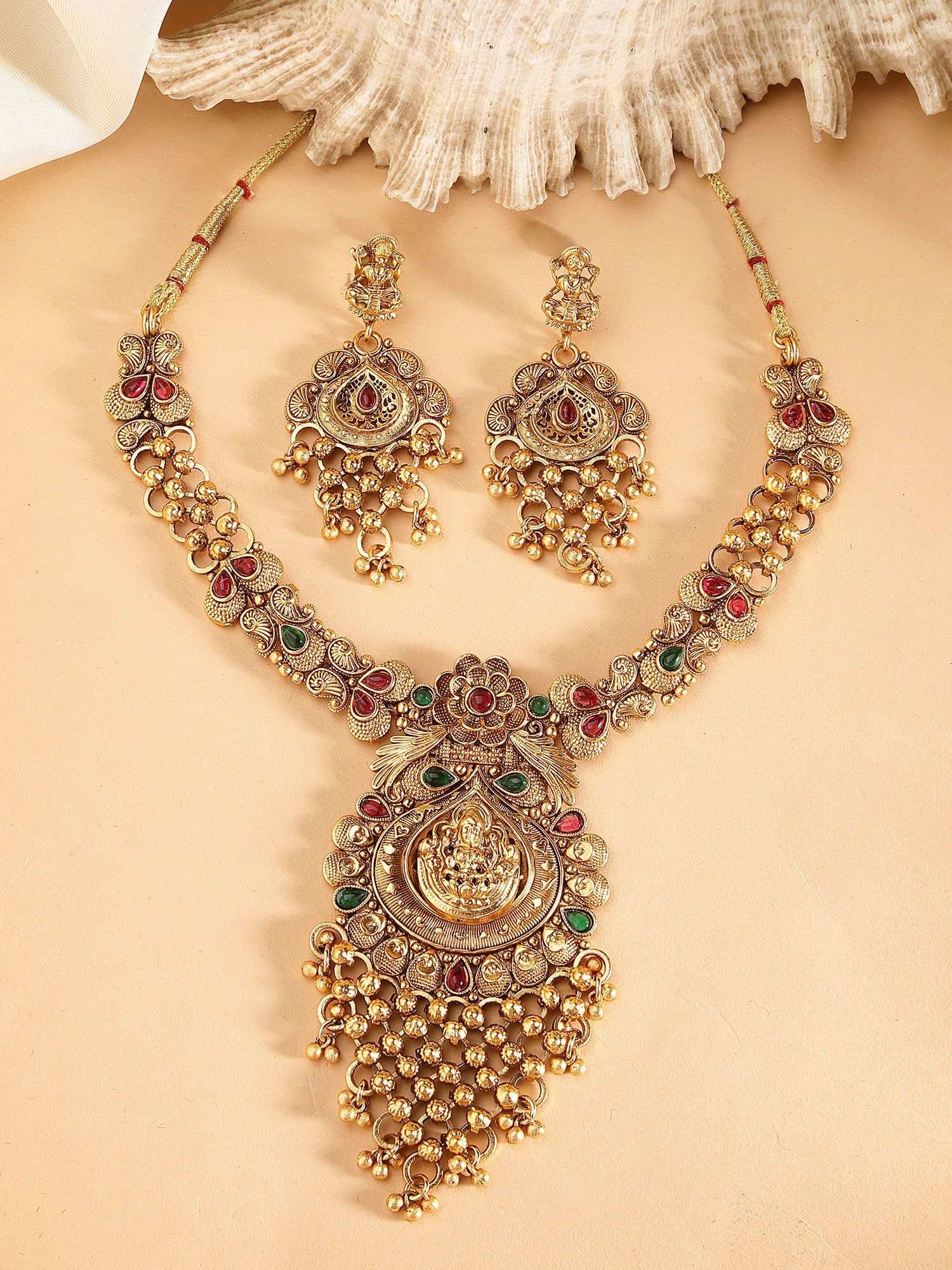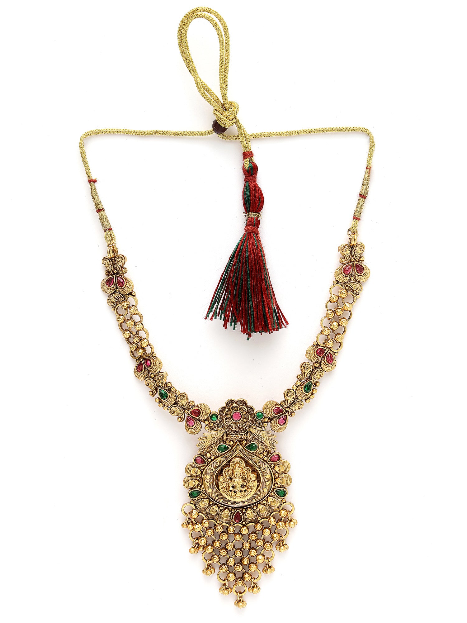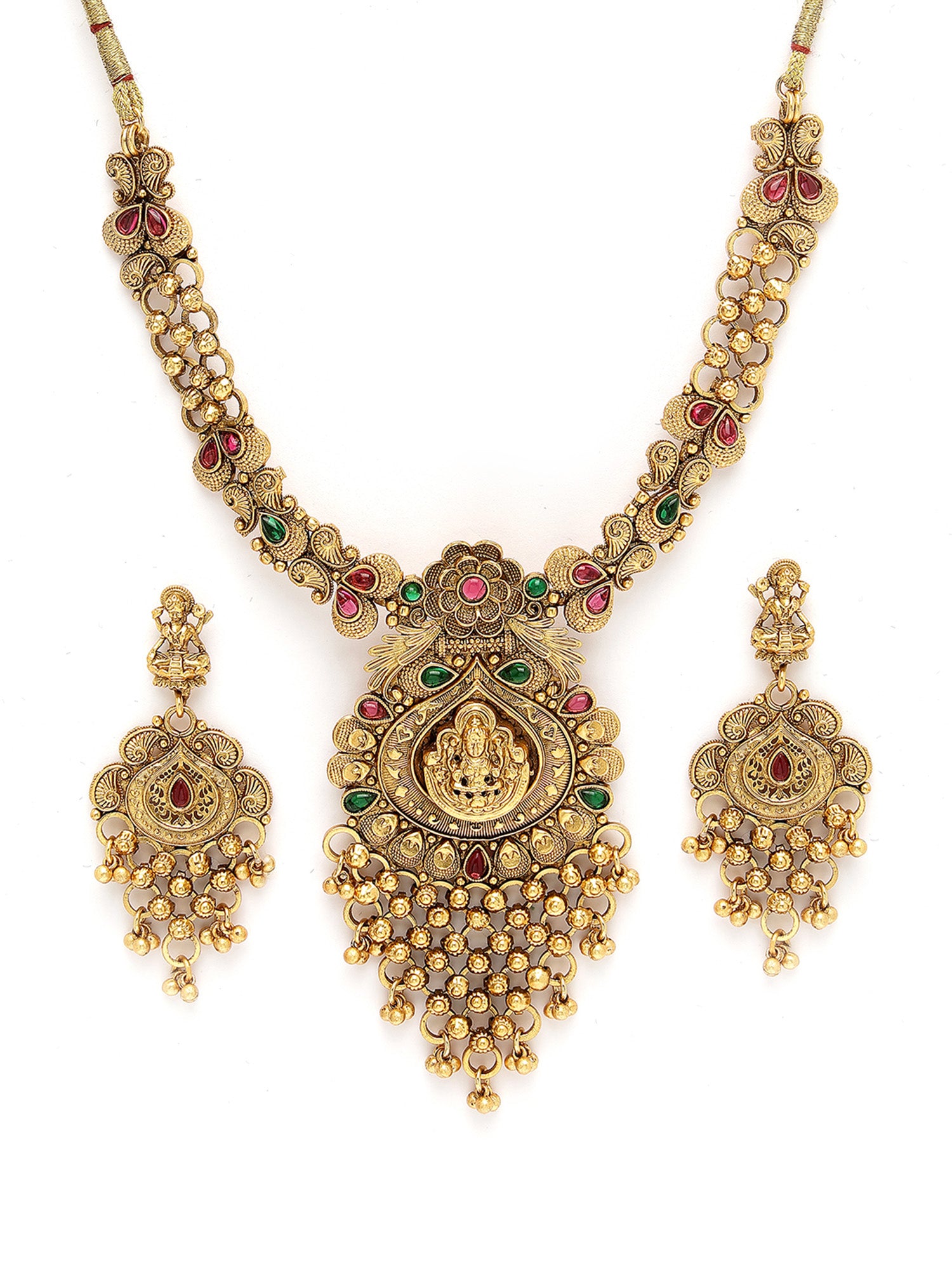 Karatcart Red and Green Stone Gold Plated Laxmi Mata Temple Jewellery Set for Women. Our products are designed with high-quality material and these products are enhanced with plating that are skin-friendly & with love to reach your heart.