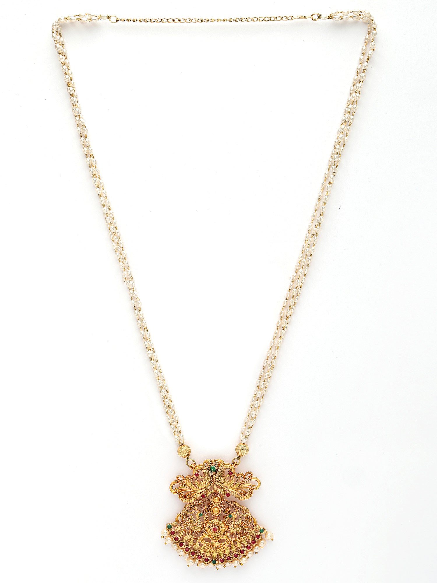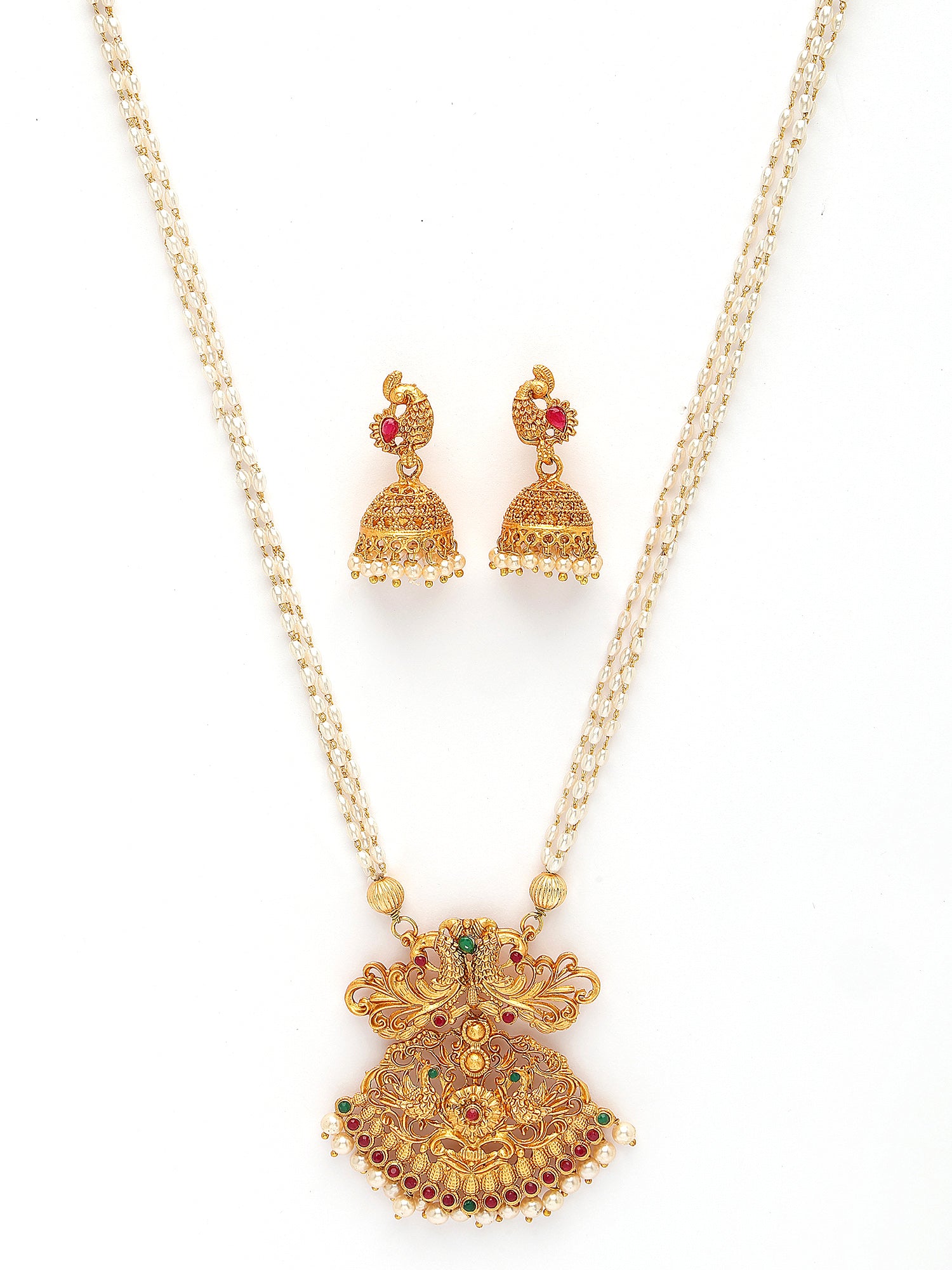 Karatcart Gold Plated Pearl Studded Peacock Design Temple Jewellery Set for Women. Our products are designed with high-quality material and these products are enhanced with plating that are skin-friendly & with love to reach your heart.