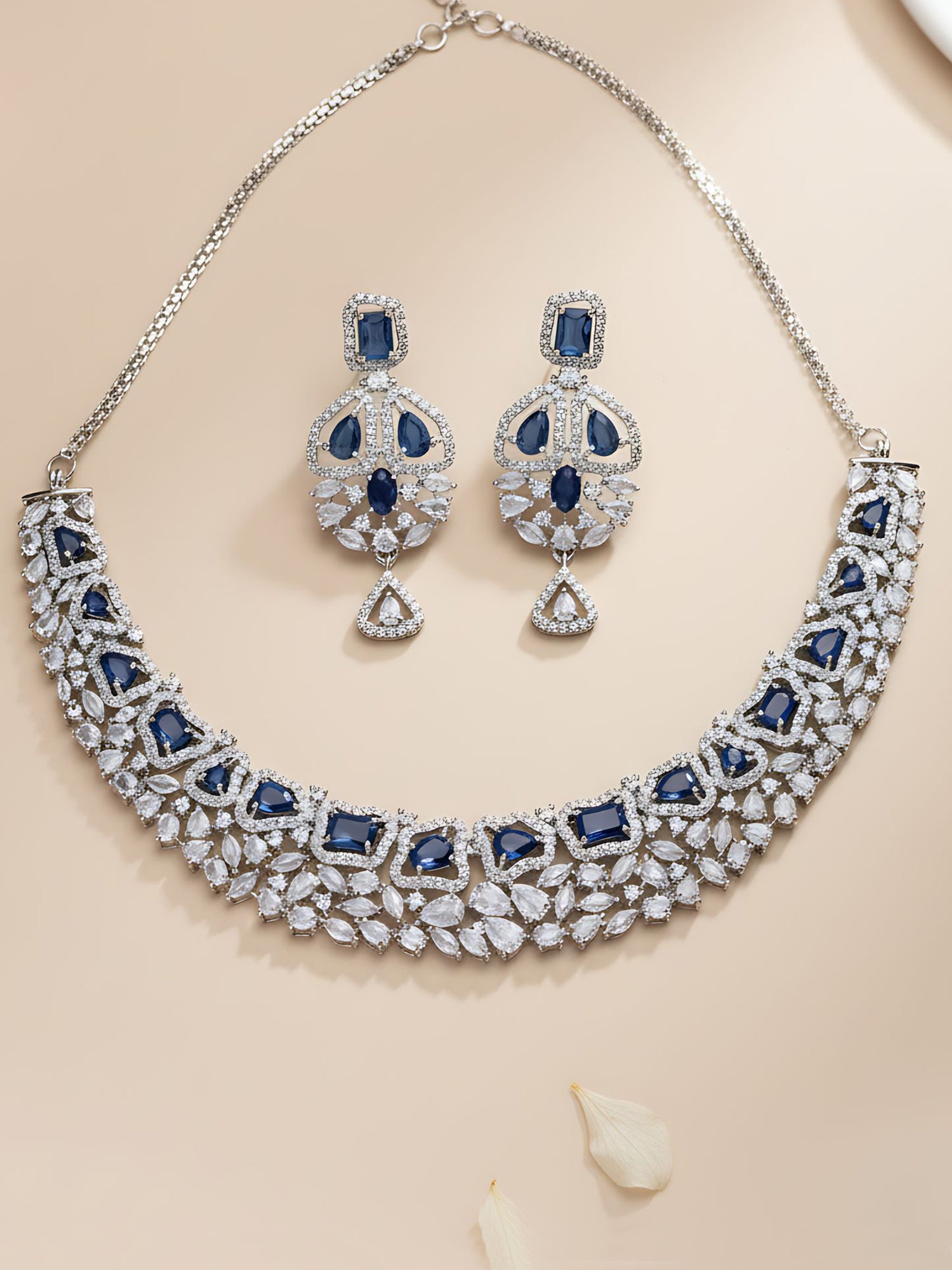 Karatcart Elegant Silver Plated Blue AD Necklace Set for Women. Our products are designed with high-quality material and these products are enhanced with plating that are skin-friendly & with love to reach your heart.
