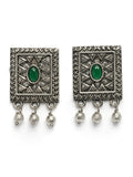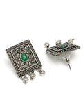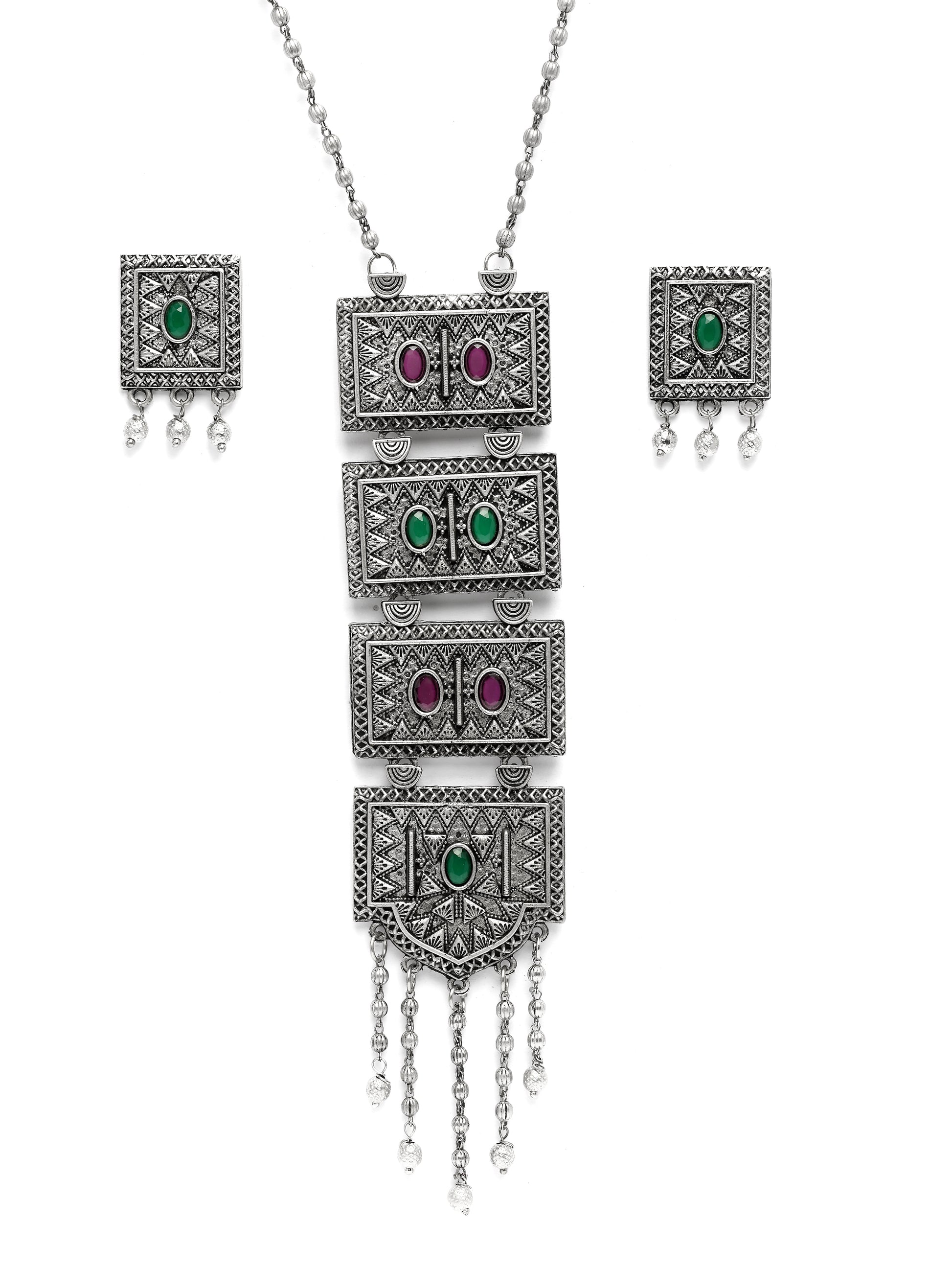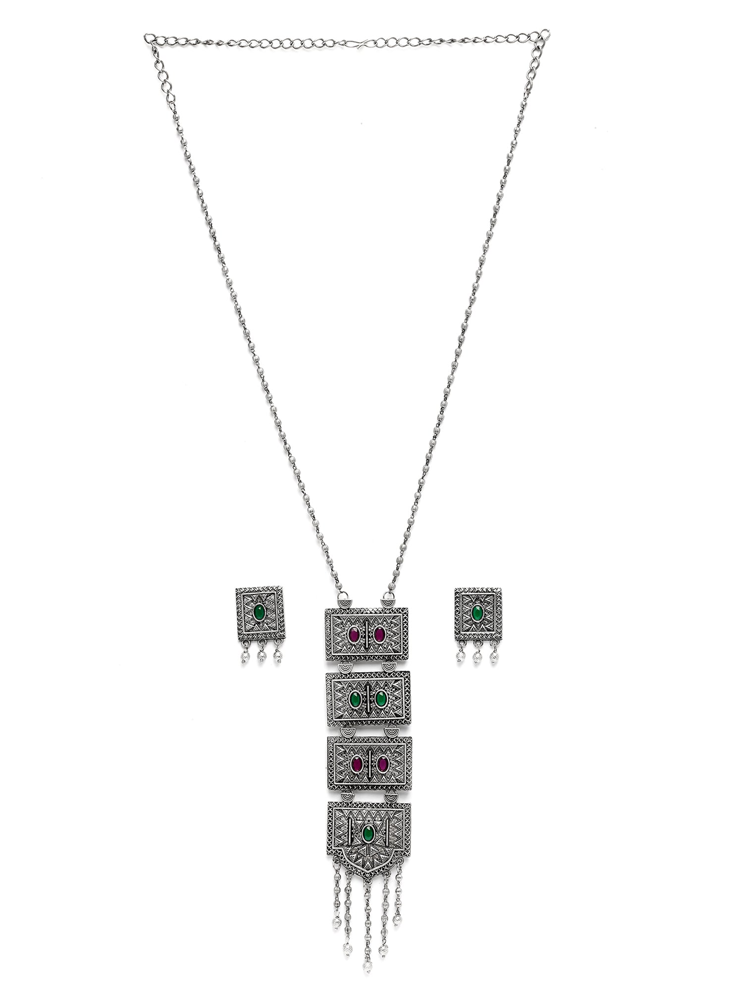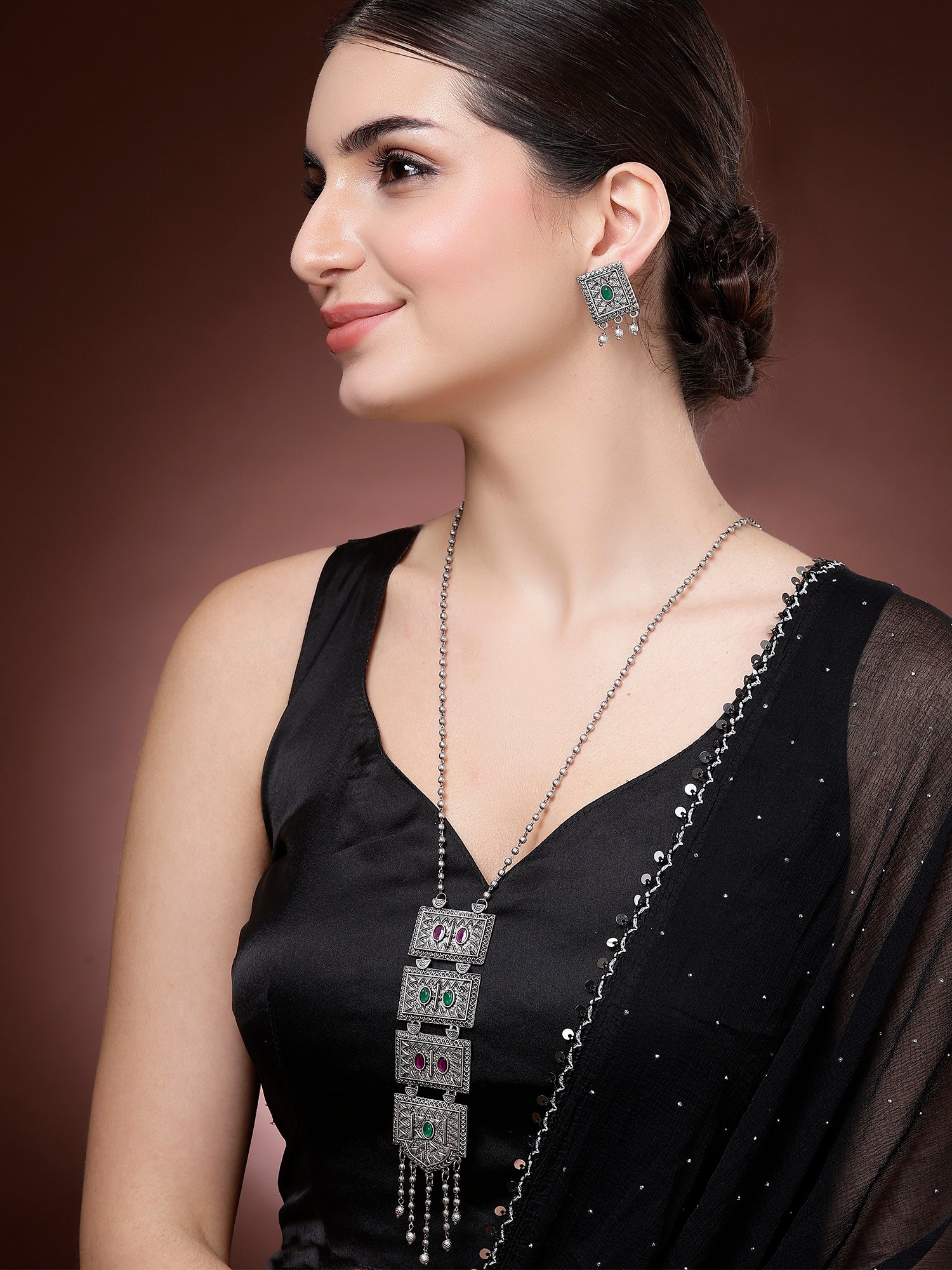 The Karatcart Oxidised Silver Engraved Necklace Set is a masterpiece that blends modern style with timeless elegance. Crafted in oxidised silver with intricate engraving, this set features a captivating mix of pink, green, and black hues, adding a sophisticated and chic touch to any outfit. The long chain is adorned with a rectangular-shaped pendant, beautifully balanced by crystal drops that provide a sparkle that catches the eye. The gold-plated accents on the pendant enhance its luxury, while the floral motifs and cross pendant give it a rich, bohemian vibe, making it perfect for both traditional and contemporary occasions. Whether worn casually with a simple outfit or as a statement piece at a party, this necklace set is versatile enough to be paired with both casual and formal attire. The delicate and lightweight design ensures comfort without compromising on style. Its unique, hand-engraved patterns and locket pendant make this set an exquisite addition to your jewelry collection. Perfect for daily wear, festive occasions, or gifting, the Karatcart Oxidised Silver Engraved Necklace Set radiates charm, elegance, and an undeniable artistic flair that will stand the test of time.