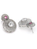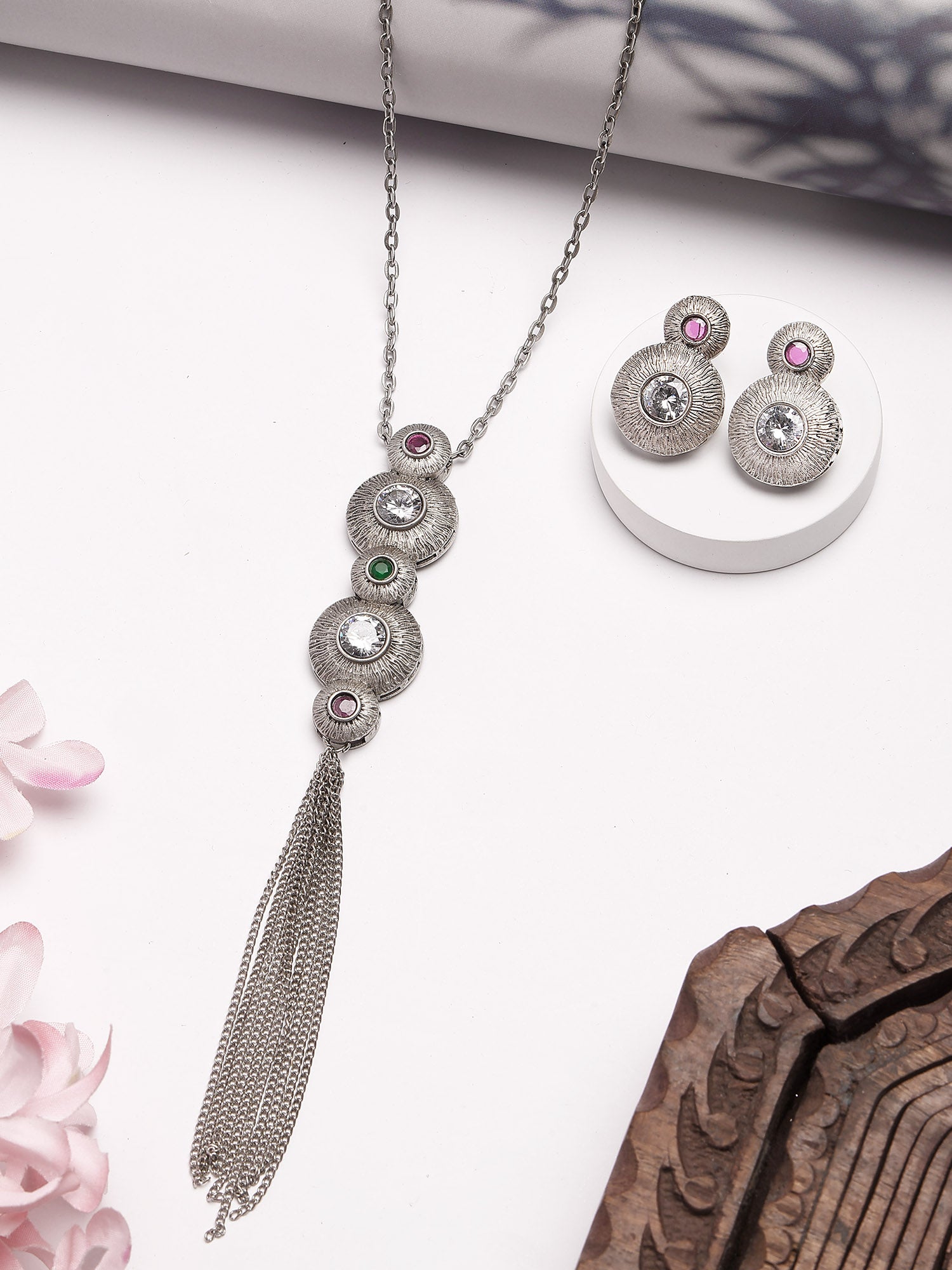 The Karatcart Oxidised Silver Red and Green Stone Pendant Set is an exquisite fusion of traditional charm and modern design. Crafted in oxidised silver with a beautifully carved pattern, this set features vibrant red and green stones that stand out against the deep silver hue. The pendant, set on a long chain, has a rectangle shape and is further enhanced with a touch of gold elegance, adding a rich contrast to the overall design. The crystal drop details provide a subtle sparkle, while the locket pendant and floral beauty elevate the aesthetic with intricate craftsmanship. The spiritual stone and cross pendant add a meaningful, bohemian touch, making this set not only a stylish accessory but also a statement of spirituality and elegance. Whether you are dressing for a party, a casual day out, or a wedding, this versatile necklace set seamlessly complements both traditional and contemporary looks. Lightweight yet bold in design, this set is easy to wear and ensures all-day comfort. The timeless sparkle of the pendant paired with the modern edge of the design makes this set a perfect addition to any jewelry collection. Ideal for everyday wear or special occasions, the Karatcart Oxidised Silver Red and Green Stone Pendant Set brings a unique blend of elegance and charm to any ensemble.