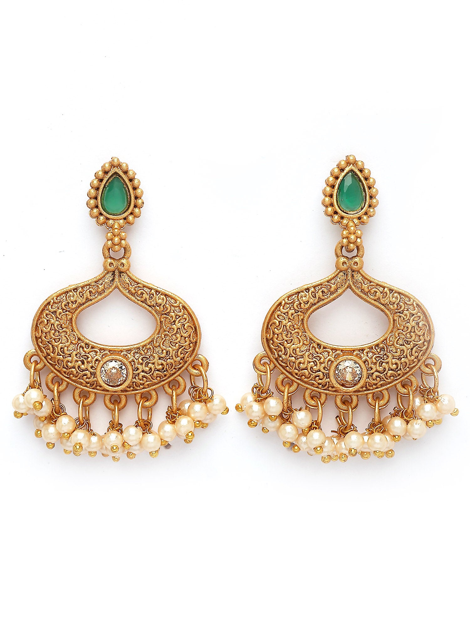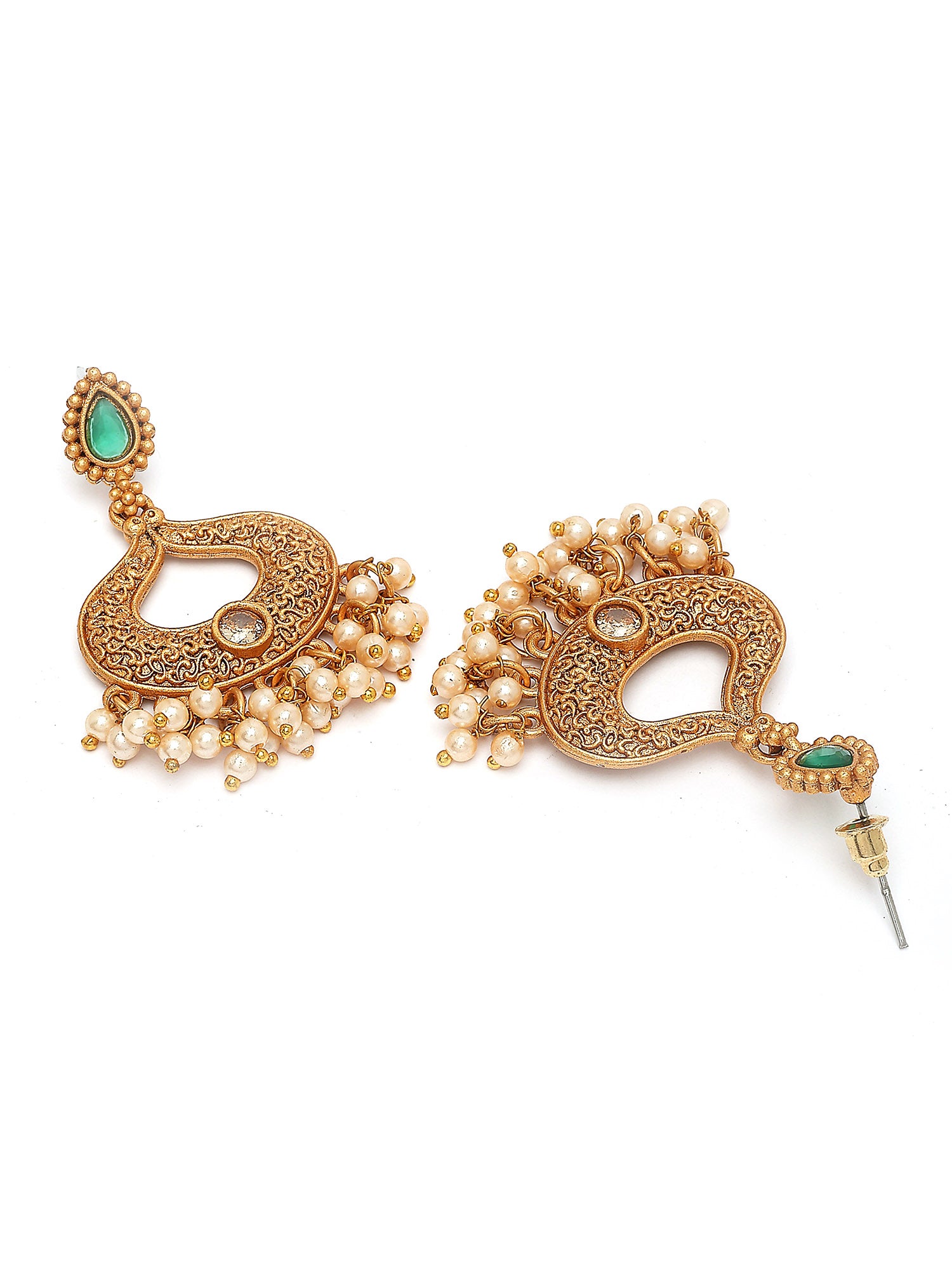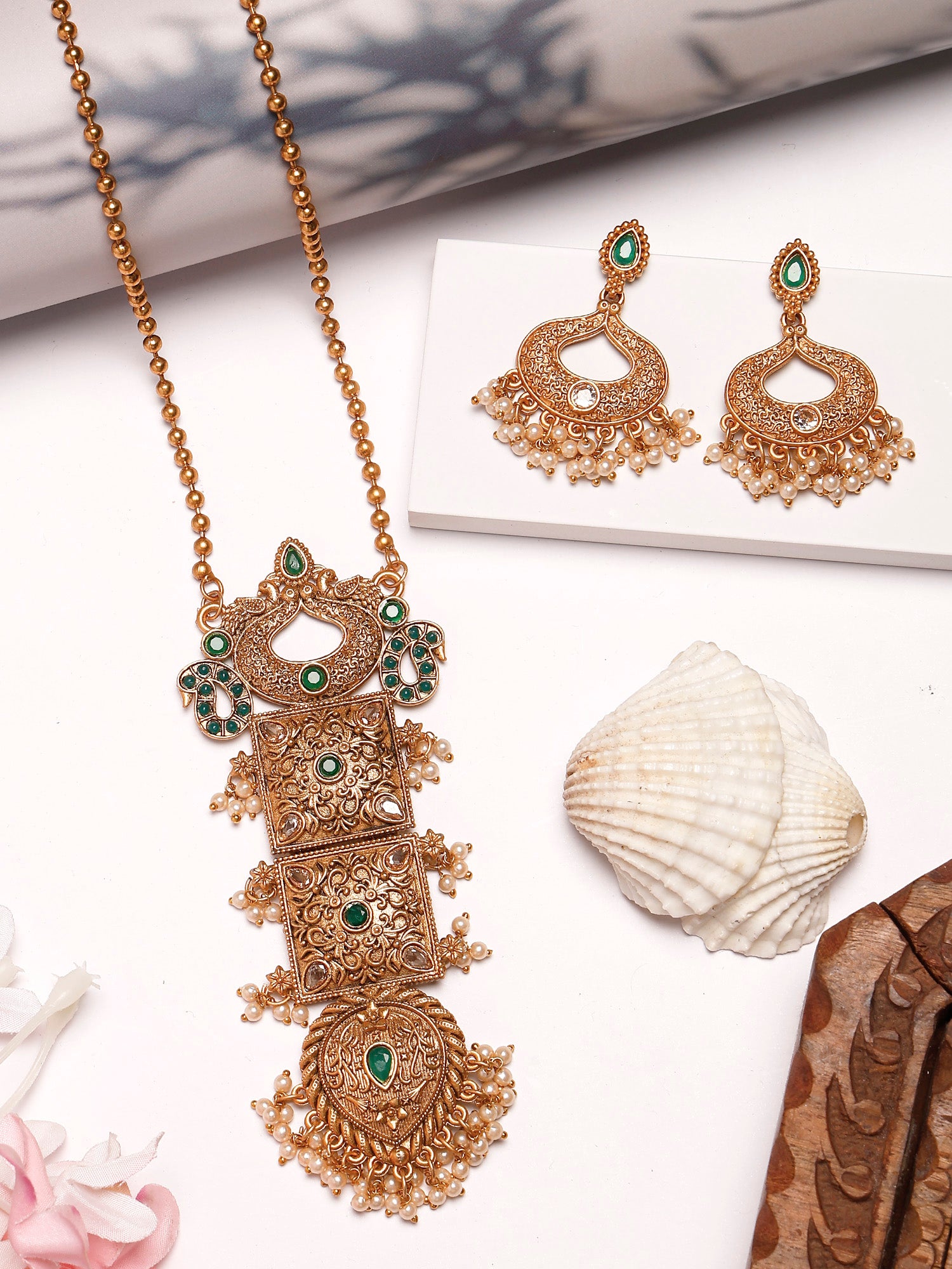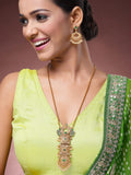 The Karatcart Antique Gold Plated Green Stone Pendant Set is a stunning blend of sophistication and modern flair. The set features a beautiful combination of golden, green, and white hues, with delicate pearls and kundan accents that bring elegance to life. The geometrical design of the pendant, set on a long gold-plated chain, is complemented by the exquisite green stone, creating a timeless and luxurious appeal. The crystal drop adds a subtle touch of sparkle, while the locket pendant and floral beauty lend an intricate charm to the piece. The spiritual stone and cross pendant offer a meaningful edge to the design, combining both elegance and depth. Whether it’s a casual outing or a formal gathering, this necklace is perfect for any occasion. Its versatility allows it to seamlessly transition from daily wear to party wear, making it an essential addition to any jewelry collection. The modern edge of this set pairs effortlessly with its bohemian vibe, creating a balance of timeless elegance and bold, contemporary style. The delicate pendant is lightweight and comfortable, ensuring you can wear it all day without any discomfort. With its delicate balance of tradition and modernity, the Karatcart Antique Gold Plated Green Stone Pendant Set is an ideal choice for both special occasions and everyday glamour.