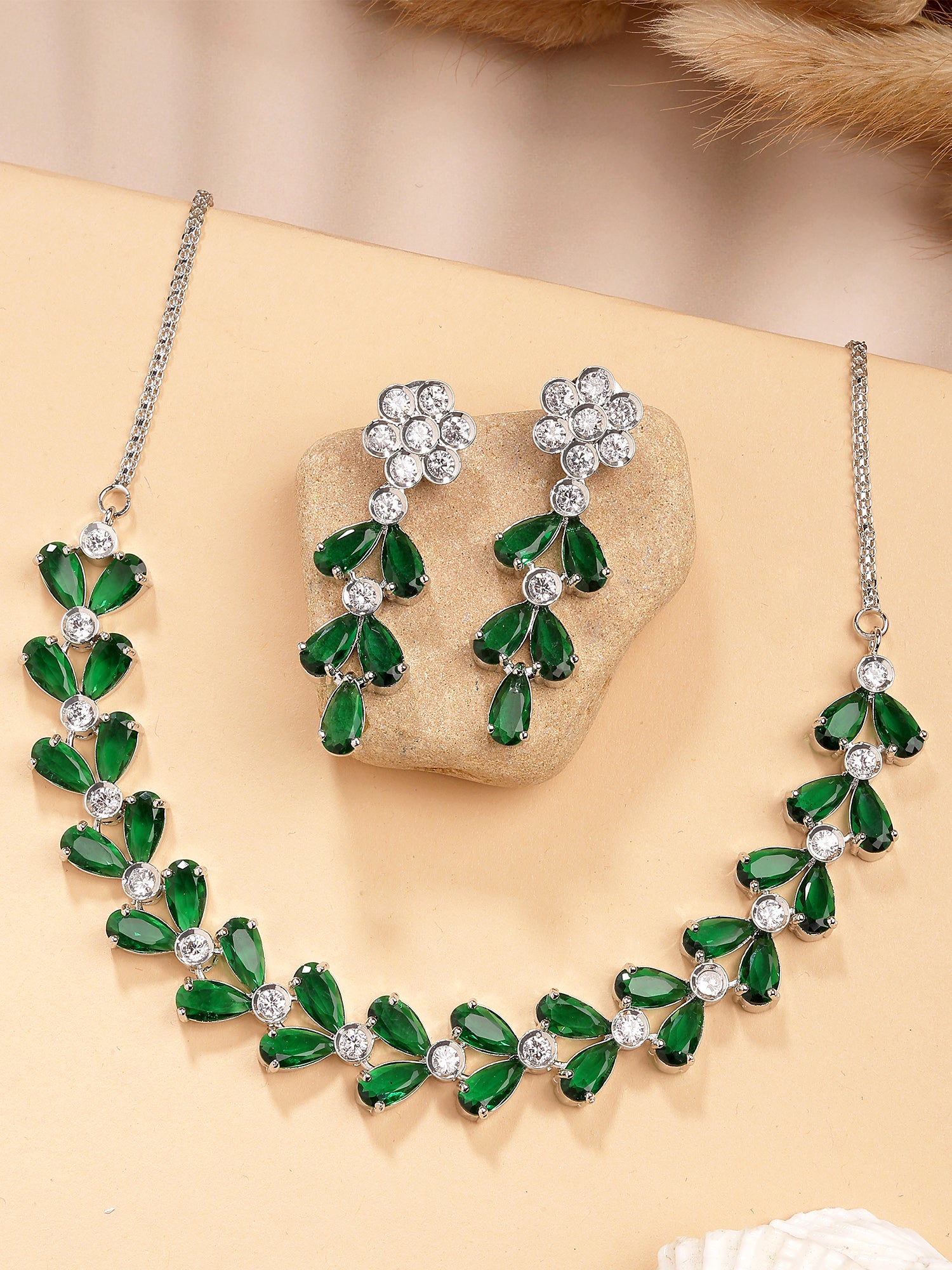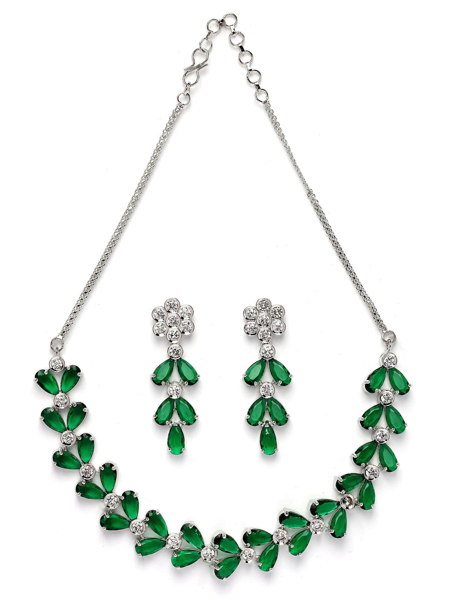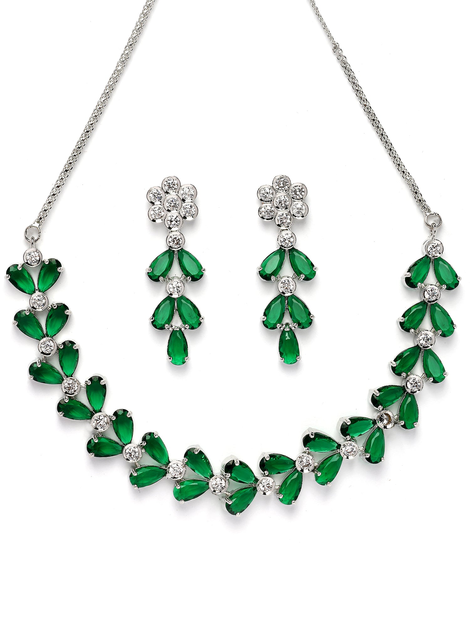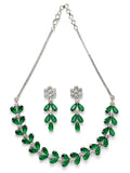 Karatcart Elegant Green American Diamond Silver Plated Leaf Design Necklace Set for Women