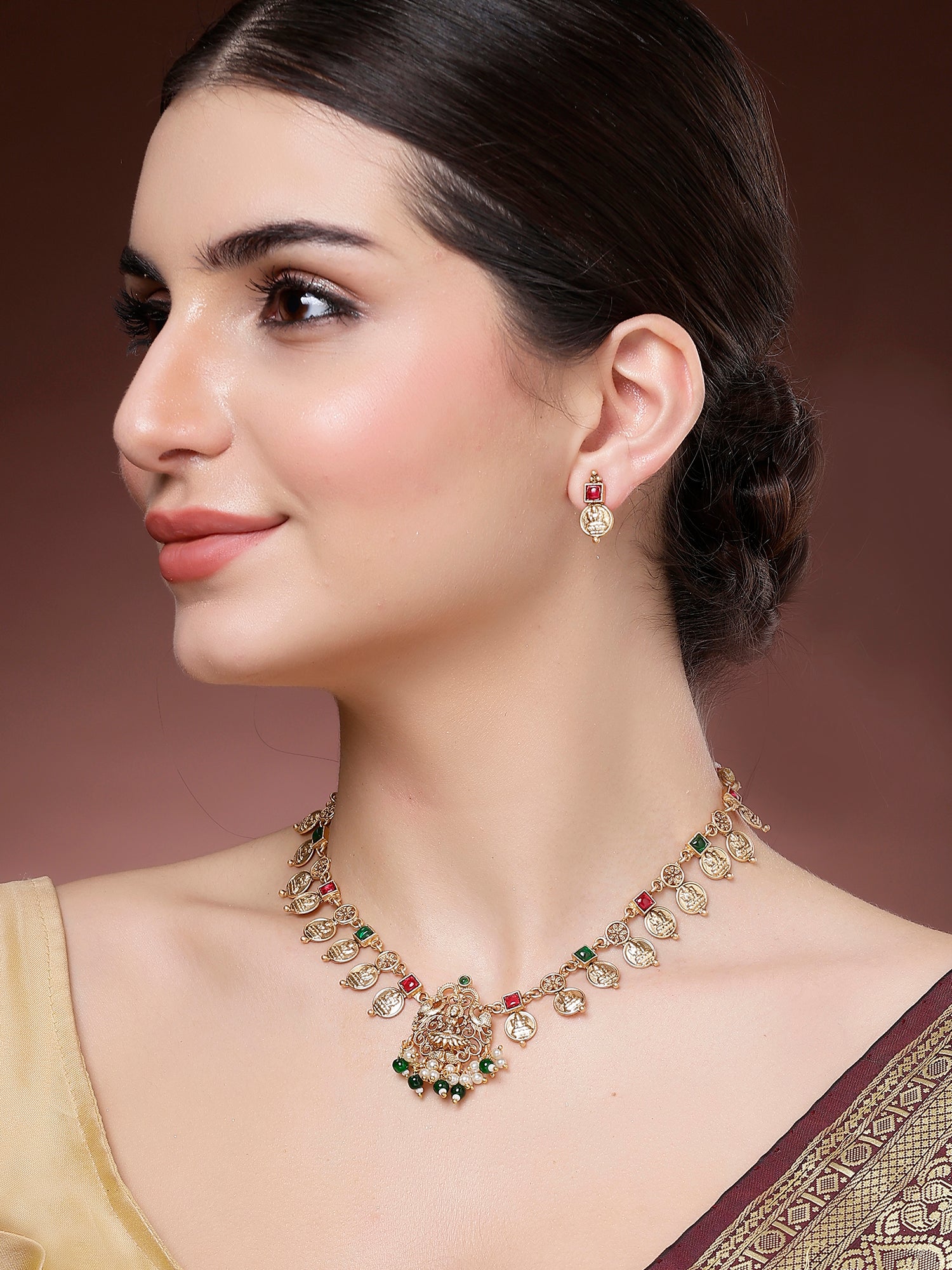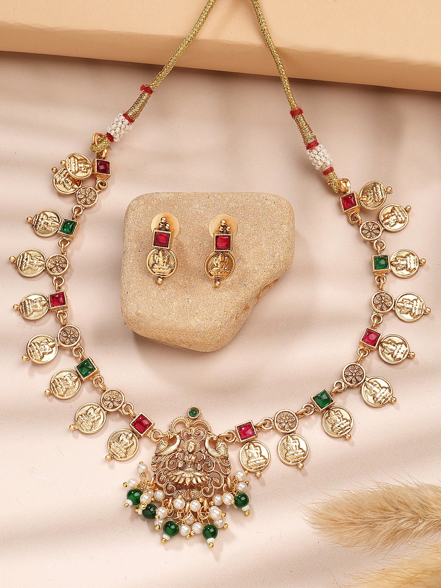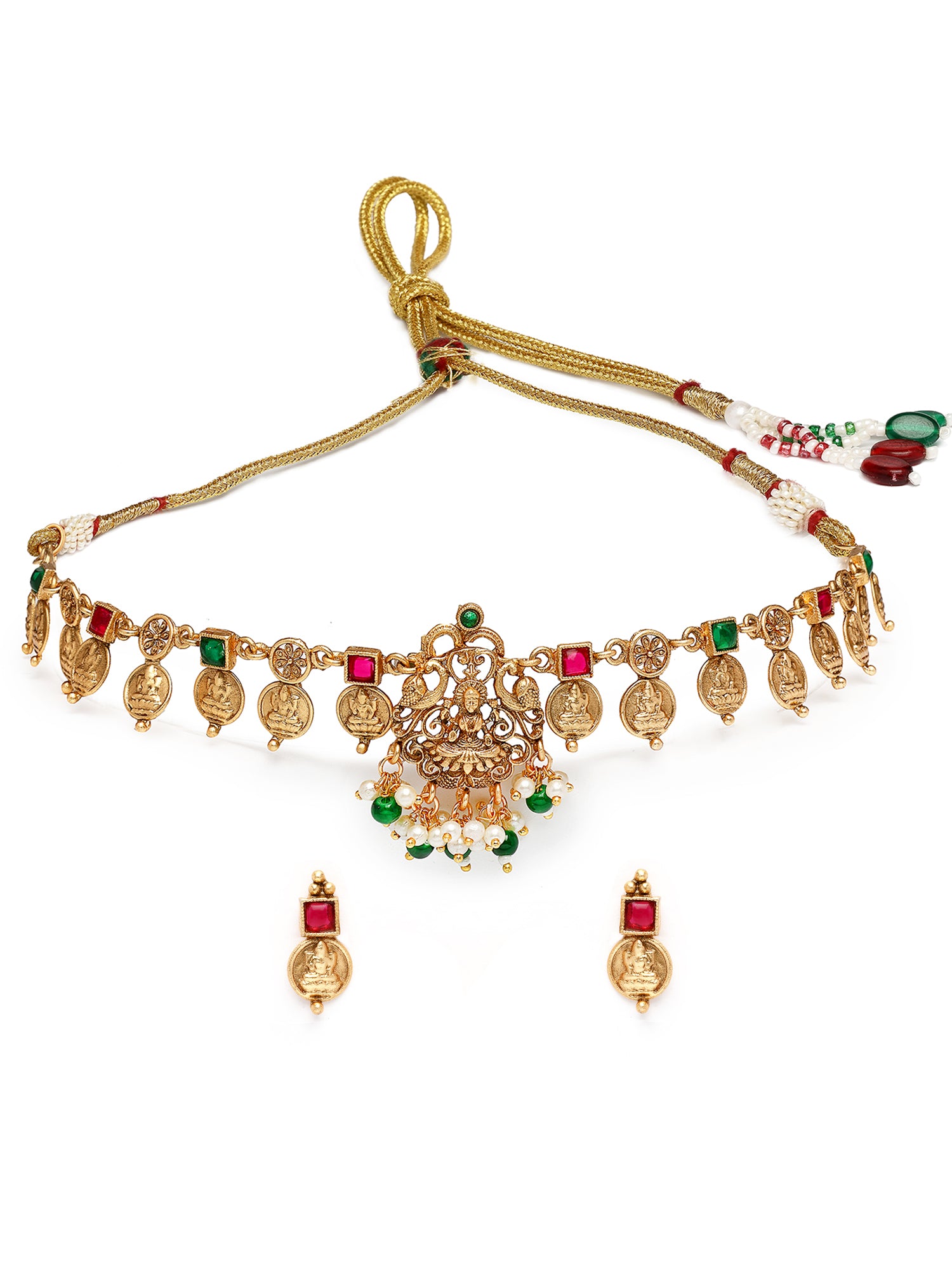 Karatcart Green Beads Engraved Coin Design Laxmi Mata Necklace Set for Women