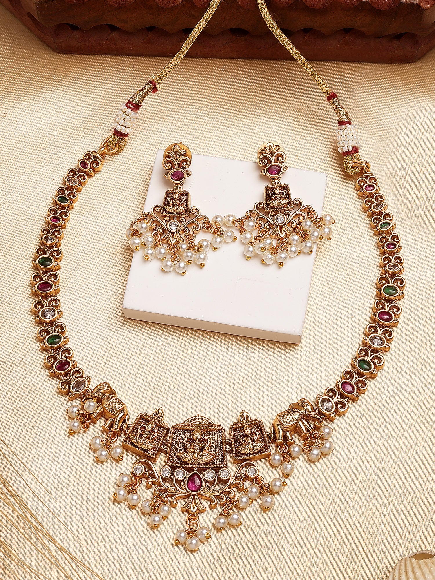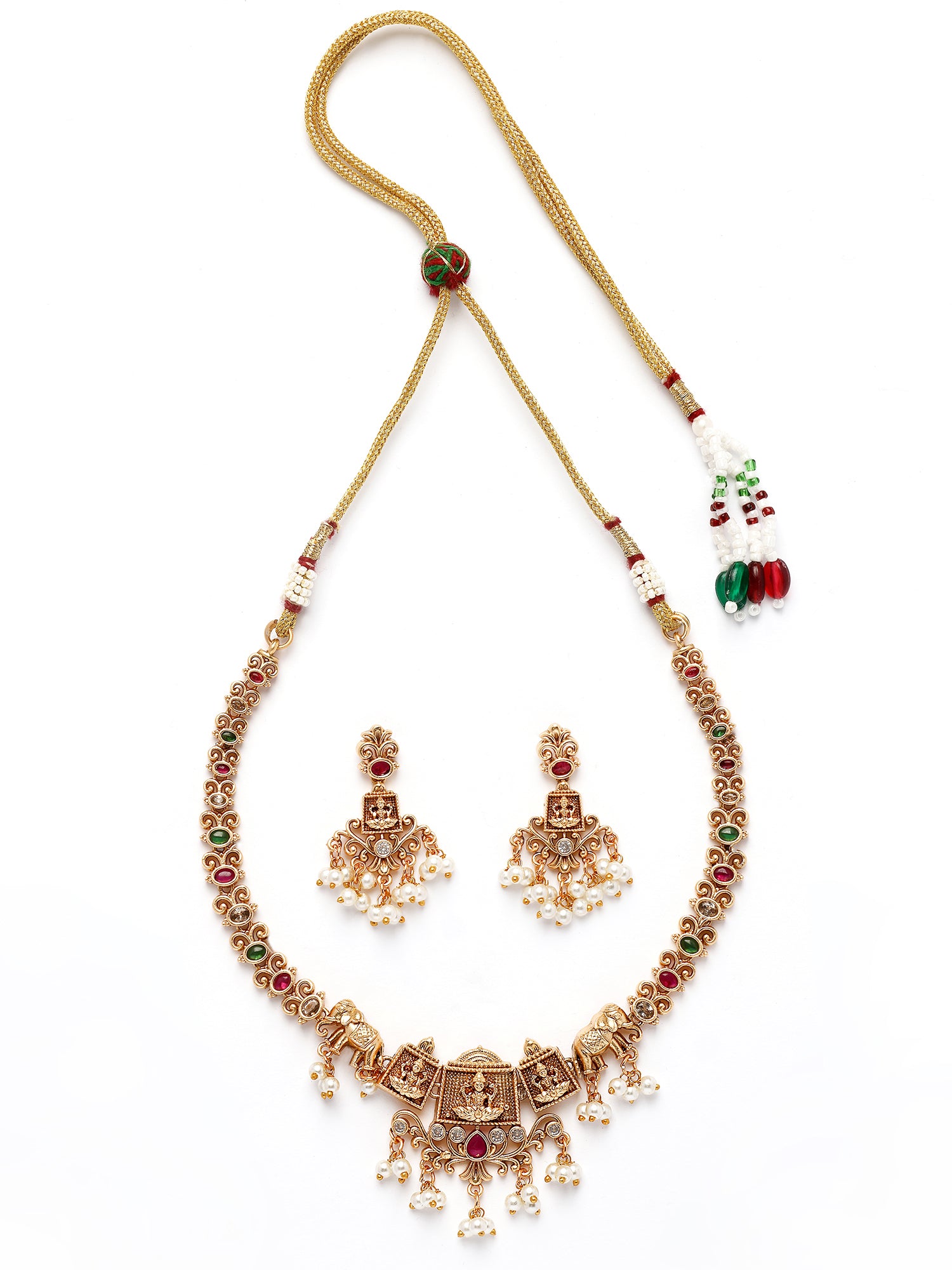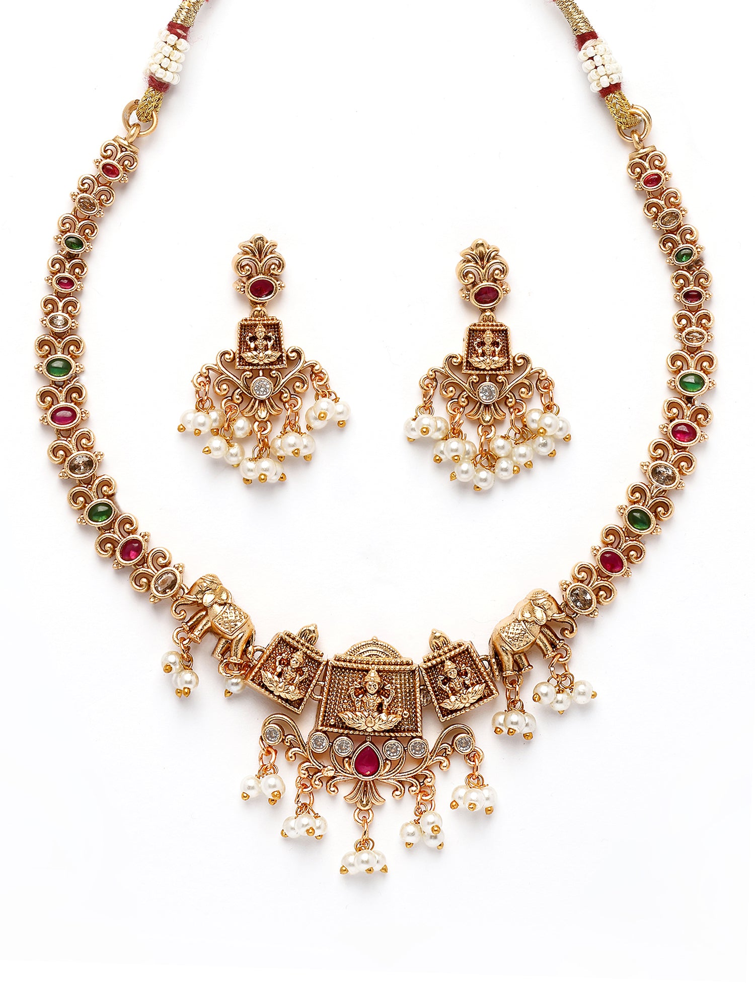 - Karatcart Gold Plated Red and Green Stones Laxmi Mata Temple Jewellery Set for Women. Our products are designed with high-quality material and these products are enhanced with plating that are skin-friendly & with love to reach your heart.